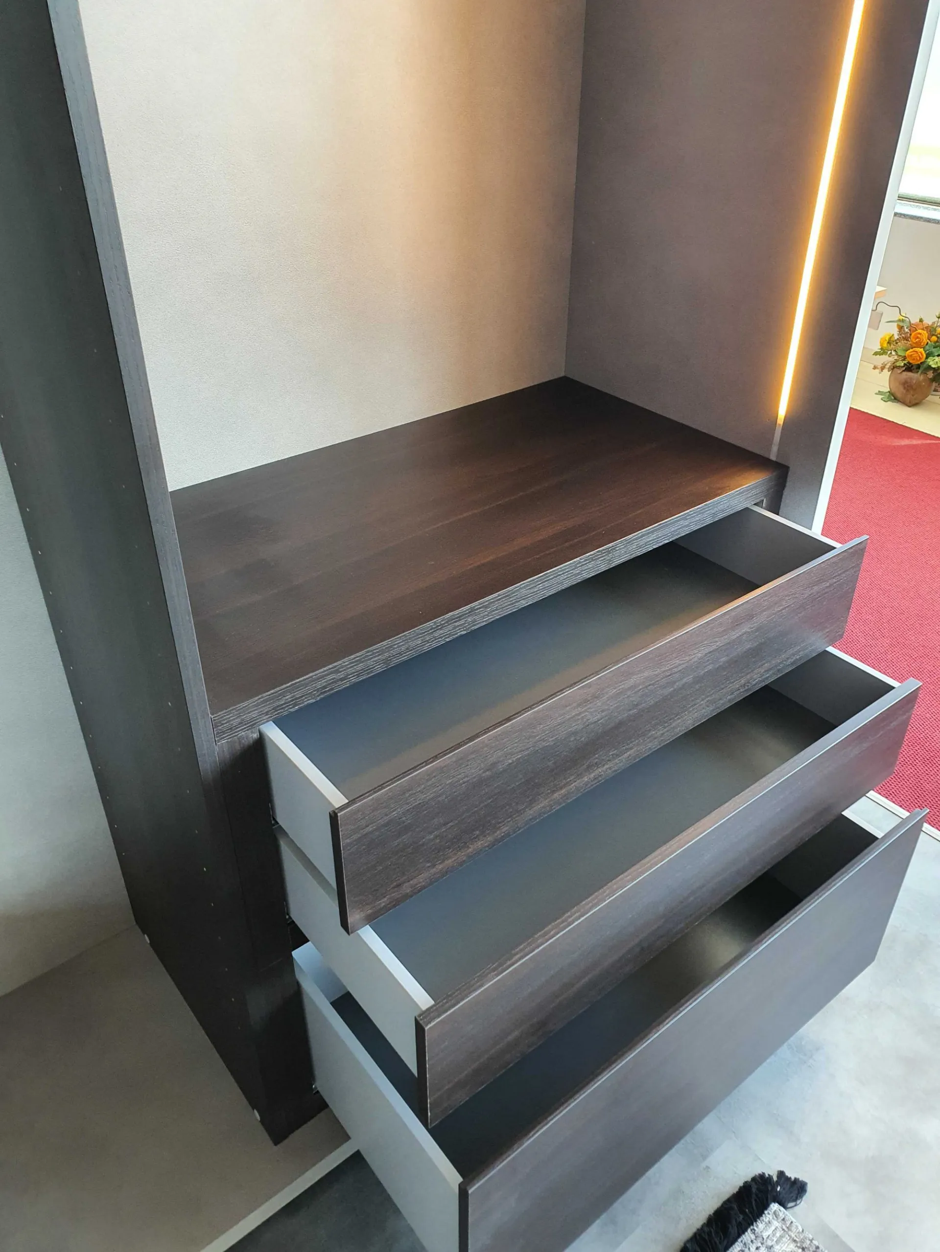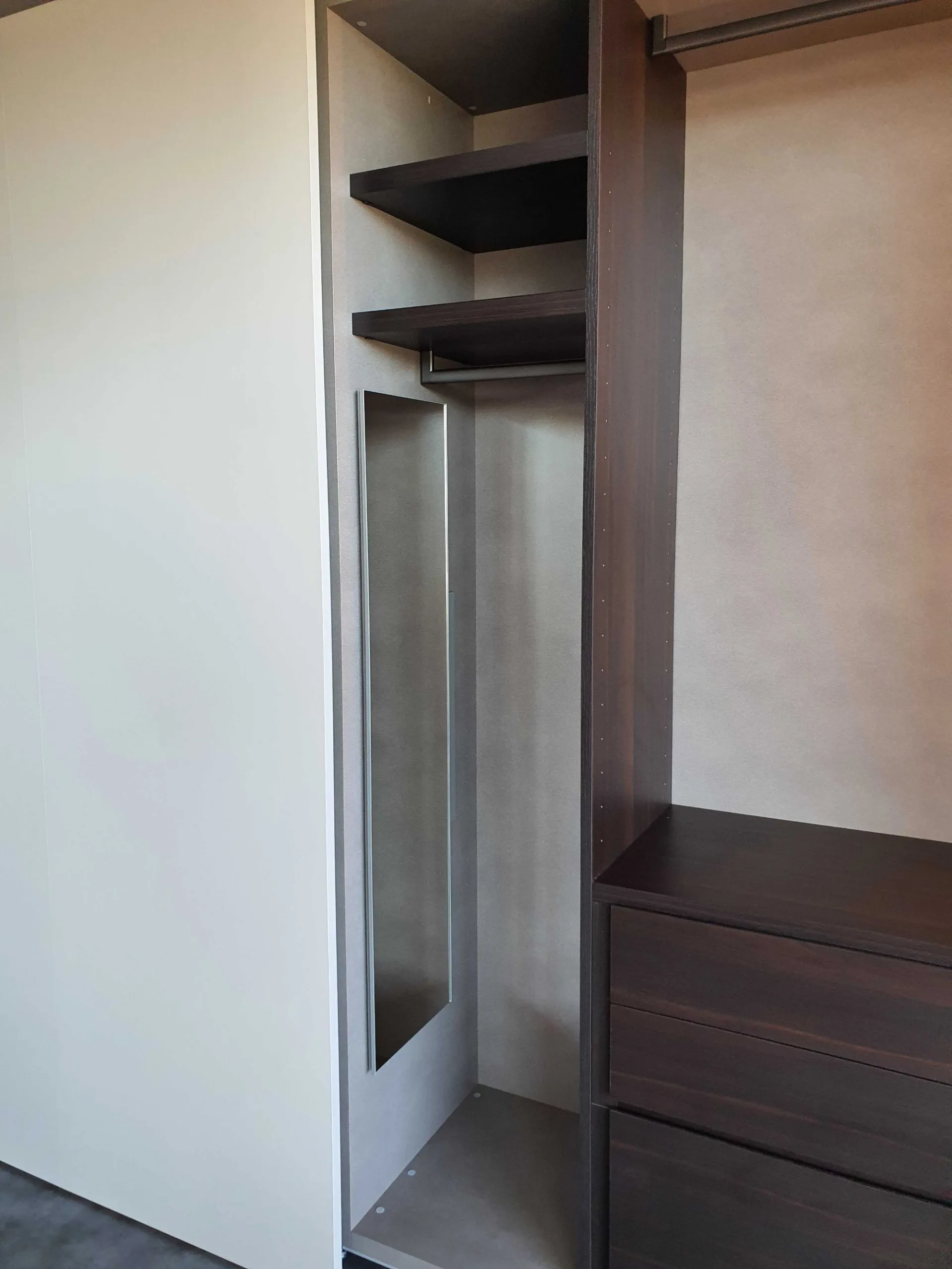 L& # 39; internal equipment è composed of: internal chest of drawers 2 drawers 1 basket, removable and adjustable internal mirror, 3 internal shelves and 4 clothes hanger tubes