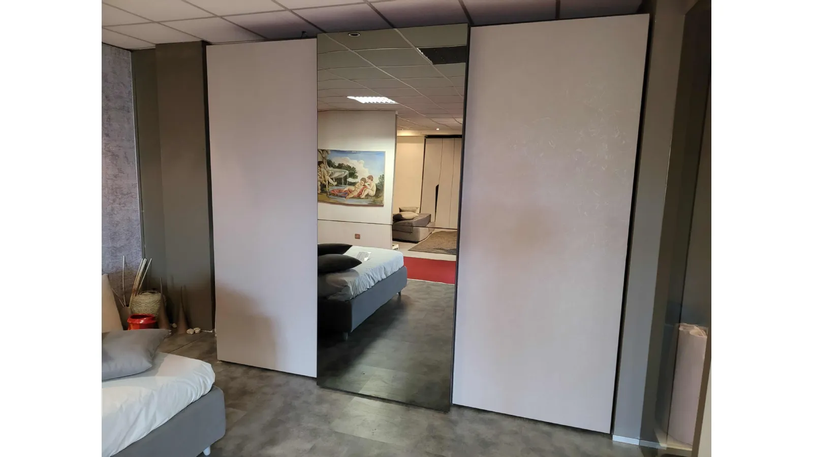 The fumé mirror; dell’ door VISION perfectly matches the integrated anthracite-colored handle. The measurements of the wardrobe are L.304xH.255