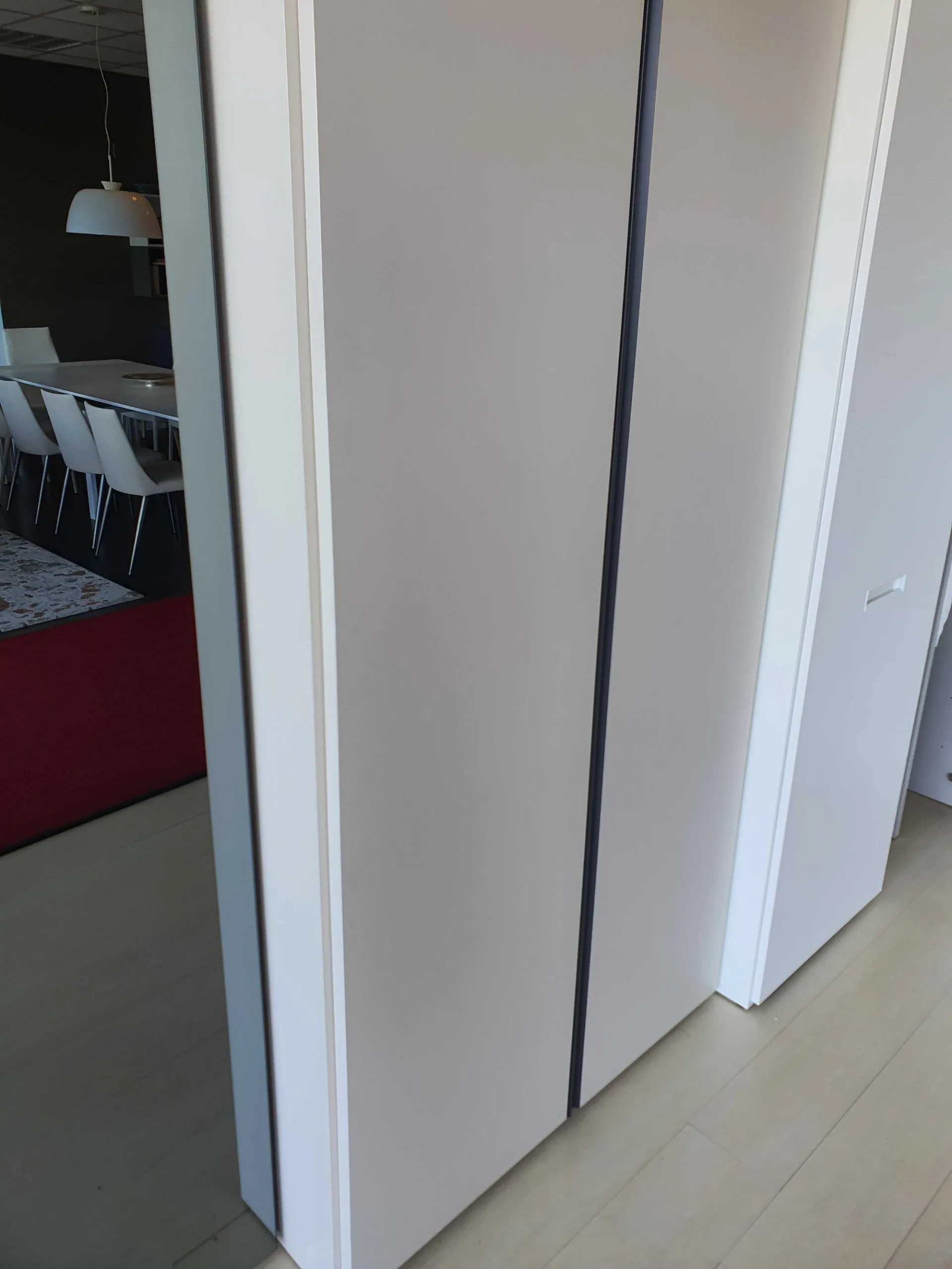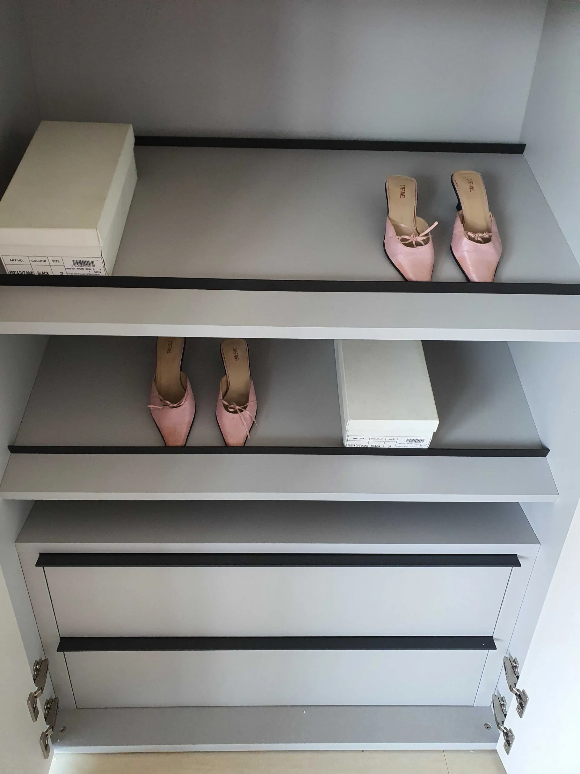 ADOK wardrobe Intermezzo Premium Return hallway shoe rack with 2 hinged doors, opening with ROW handle in cast iron finish, internal material titanium finish, external matt dove gray lacquered finish, internally equipped with shelf, 2 inclined shelves for shoes, 2 drawer chest