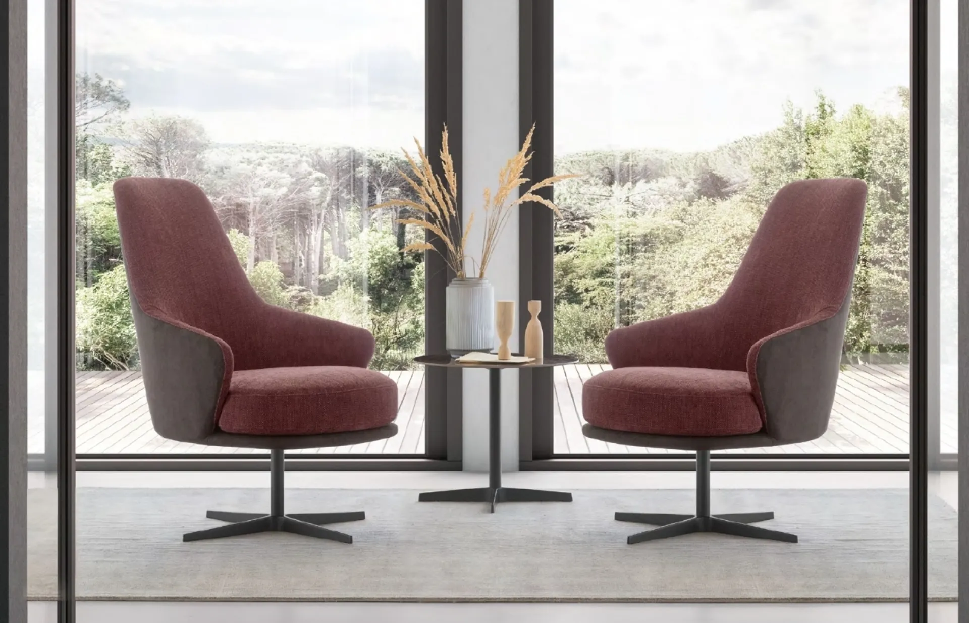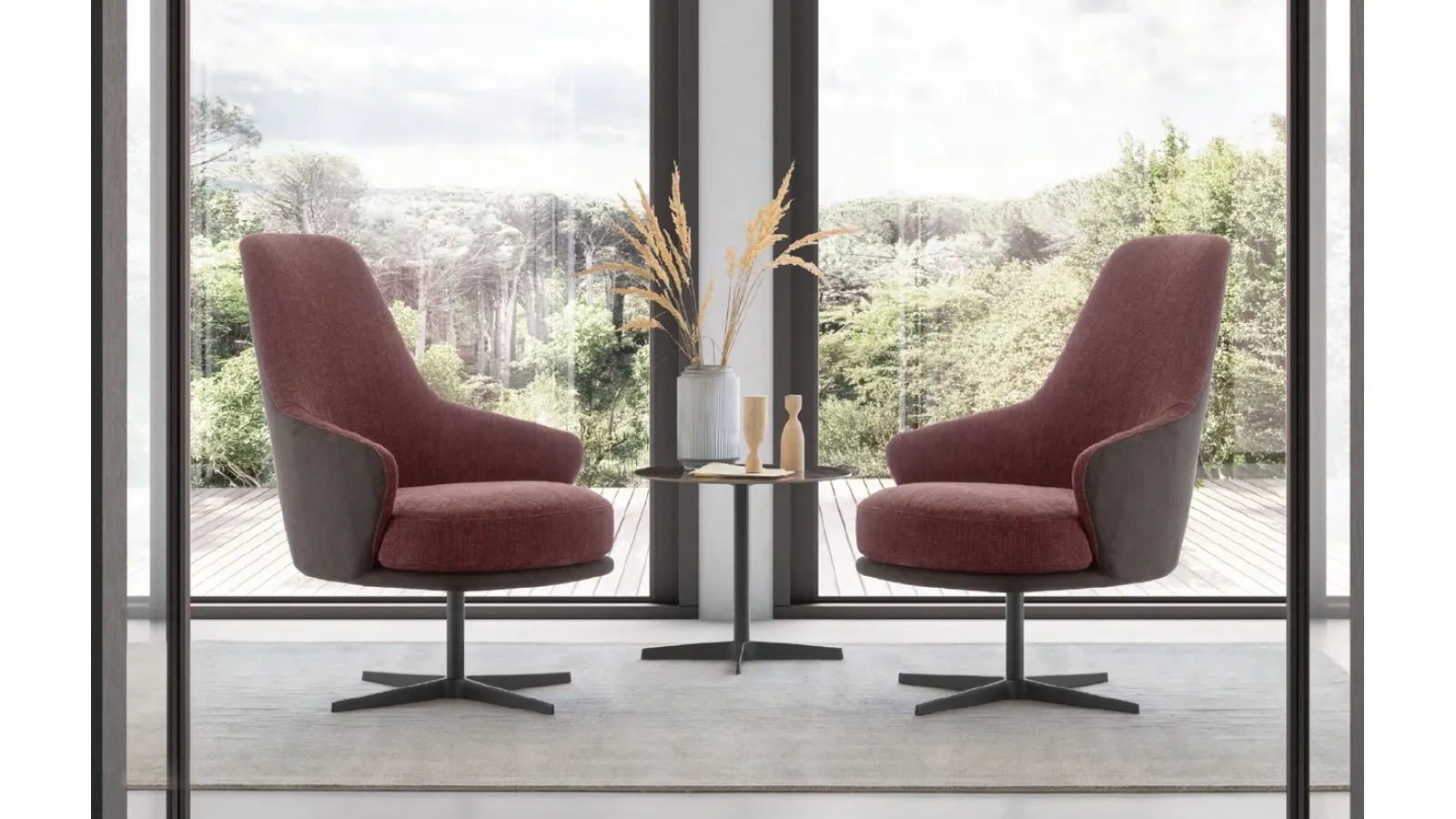Upholstered items are furnishing modules around which you can enjoy moments of relaxation and socializing. The armchairs are a truly essential element of design in various rooms, from the living area to the rest area, environments to be furnished with care. Le Comfort, specialists in the production of armchairs and lounges, have created an elegant and sophisticated covering with a fabric structure for the model in the photo. Discover a large variety of upholstered furniture and you will be able to create the spaces you've always dreamed of. Amy swivel armchair by Le Comfort : let yourself be inspired by our modern proposals.