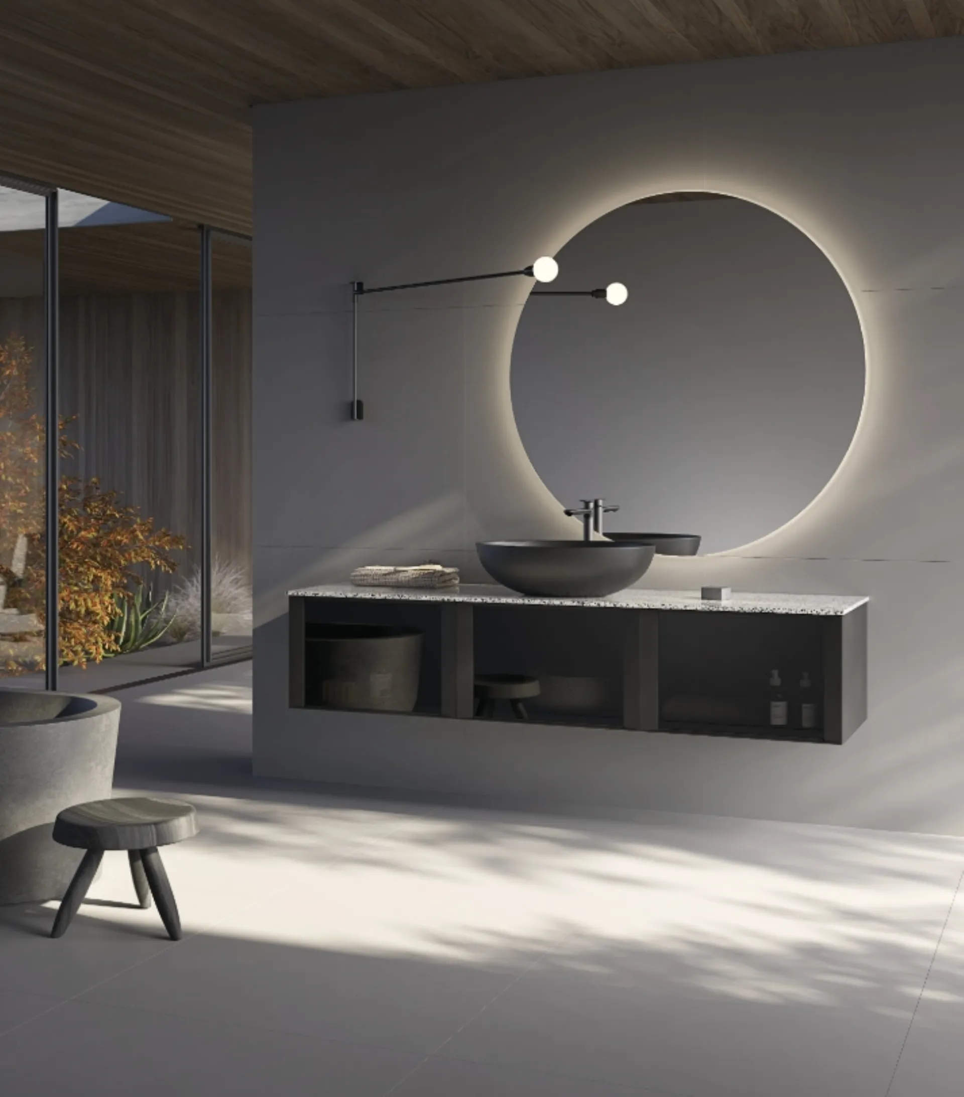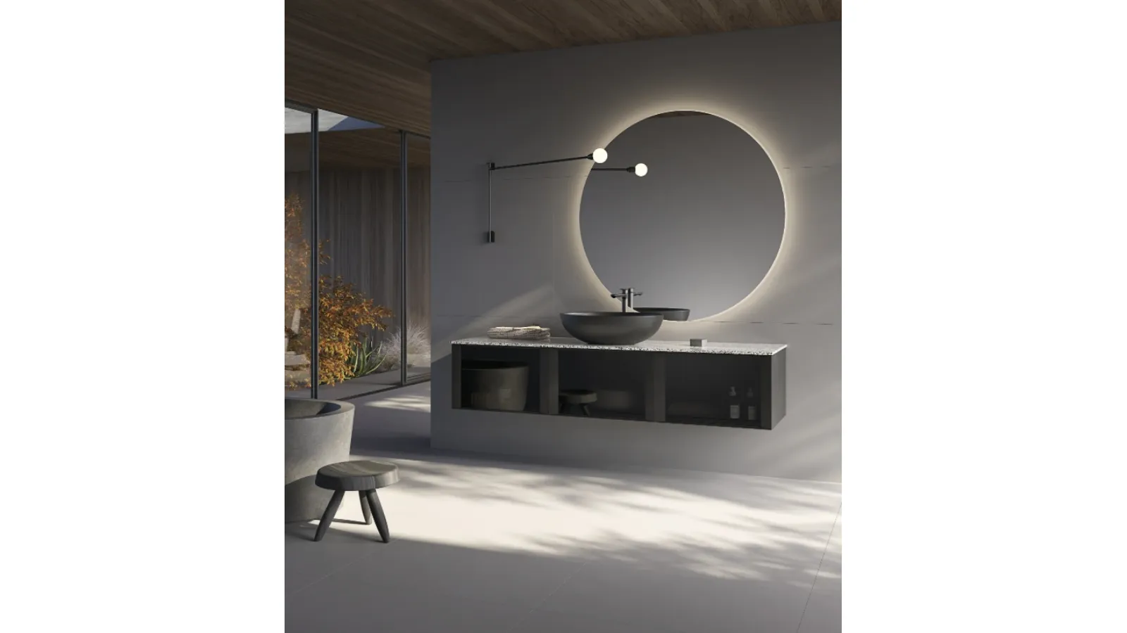 | Materiale: | Struttura: laccato opaco (es. nero), Ante: vetro fumè, Lavabo: lavabo da appoggio in ceramica (es. nero opaco), Top: top in quarzo-resina (es. finitura Terrazzo white), Specchio: modello Sfera+Led, diametro 120 cm |