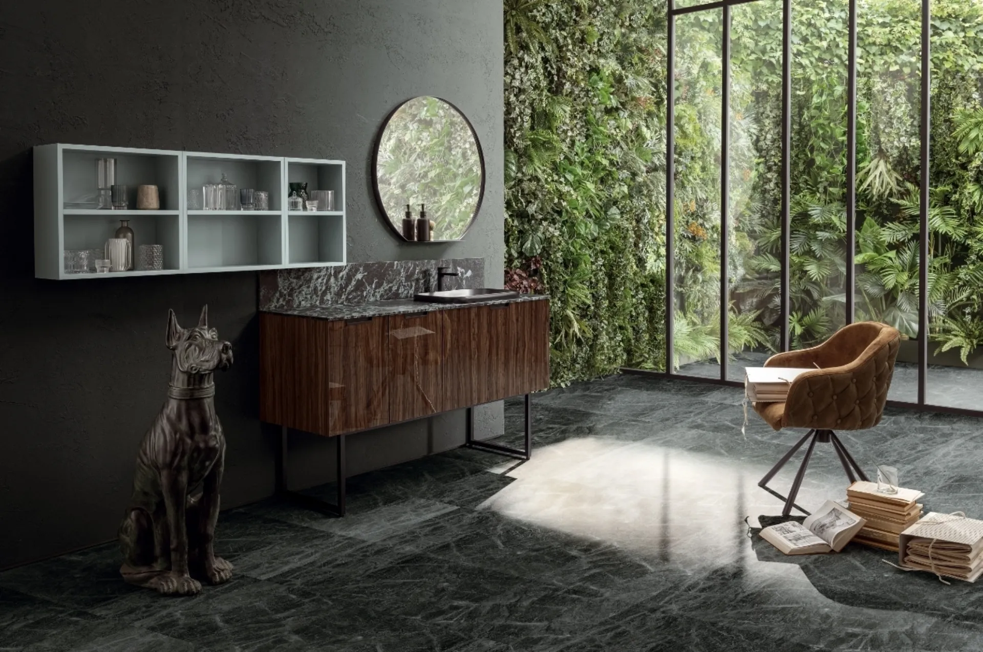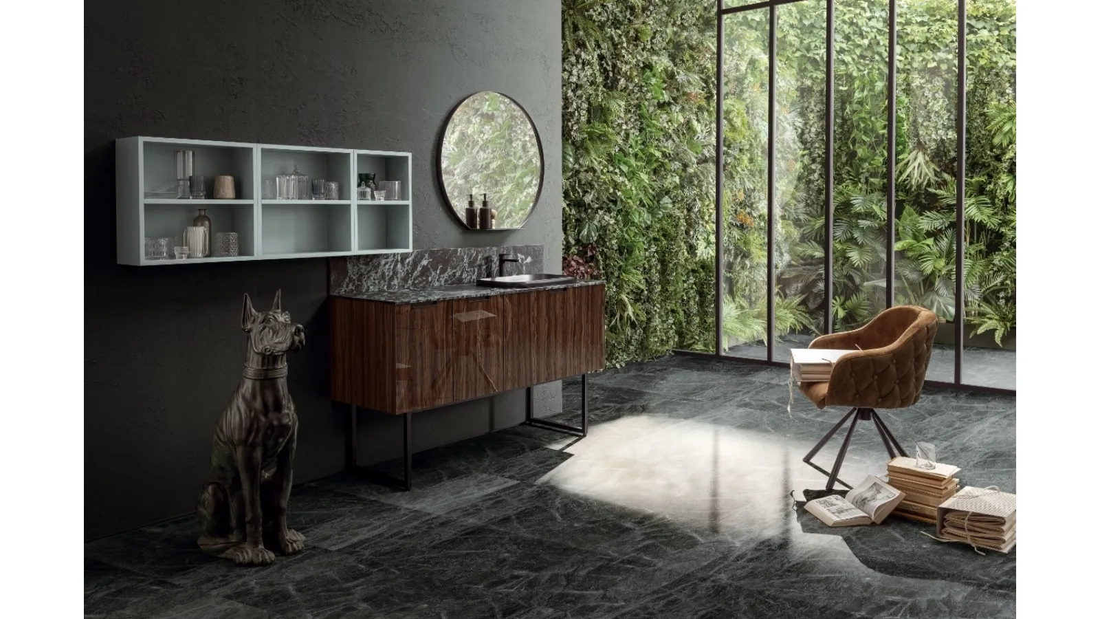 Il mobile da bagno EGOISTA EG01 di Compab incarna una sintesi perfetta tra funzionalità avanzata e design raffinato. La sua struttura si avvale di un'elegante finitura in olivo scuro lucido e laccato opaco nella tonalità C2 ocean, con frontali che riprendono l'identica estetica. La dotazione include un lavabo da incasso soprapiano, modello “Civita”, realizzato in ceramica nero opaco, che si integra armoniosamente con il piano. Quest'ultimo è un gres di 1,3 cm di spessore, con alzata posteriore e finitura Verde alpi, garantendo resistenza all'usura e un pregevole impatto visivo. Completa l'insieme una specchiera ROUND-C, con laccatura opaca G4 grigio ombra, studiata per ottimizzare la modularità e l'estetica dell'ambiente. L'ingegnerizzazione di ogni componente assicura una perfetta coesione tra l'estetica del design italiano e la durabilità dei materiali selezionati, offrendo prestazioni e longevità superiori.