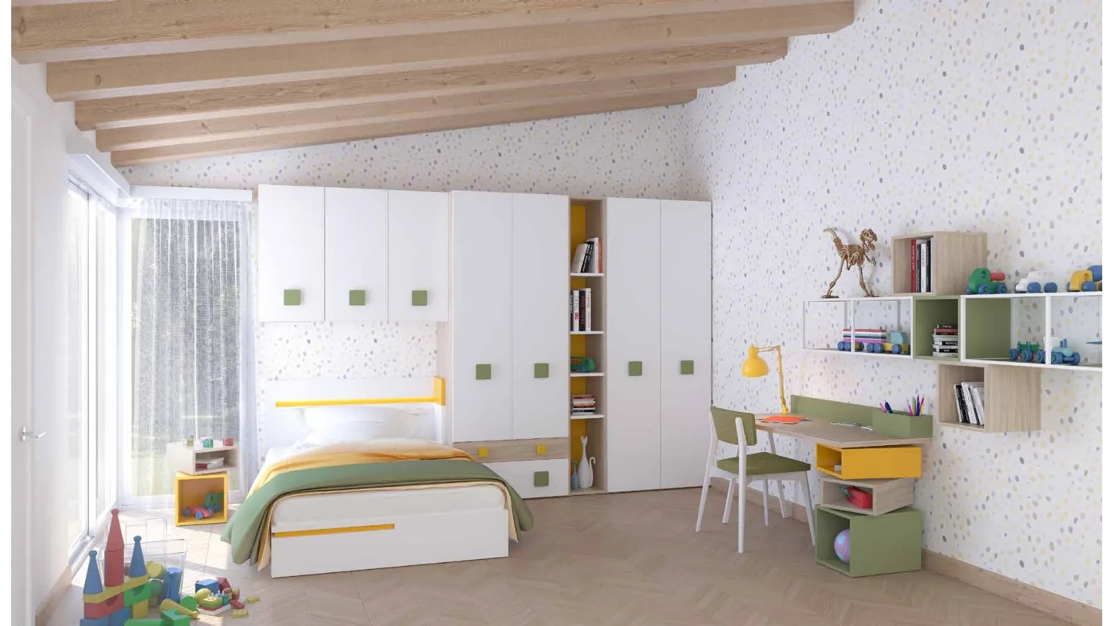 Esplora la cameretta Open 06 S75, una soluzione d'arredo che unisce design contemporaneo e massima funzionalità. Questa composizione ingegnosa include un armadio modello OPEN, pensili e libreria SHANGHAI, un letto CUBE, e gli elementi WHEEL per comodino e scrittoio 130. Dettagli come i pensili in metallo FRAME e KUBOCOLOR, e la sedia ELLEN con struttura bianca e seduta in tessuto verde foresta, arricchiscono l'insieme. Lo scrittoio, con gamba in metallo e cassetti, si integra perfettamente nell'ambiente. Realizzata prevalentemente in melaminico, questa cameretta assicura durabilità e semplicità di manutenzione. Per un ambiente che non scende a compromessi sulla qualità, questa proposta offre stile e resistenza nel tempo.