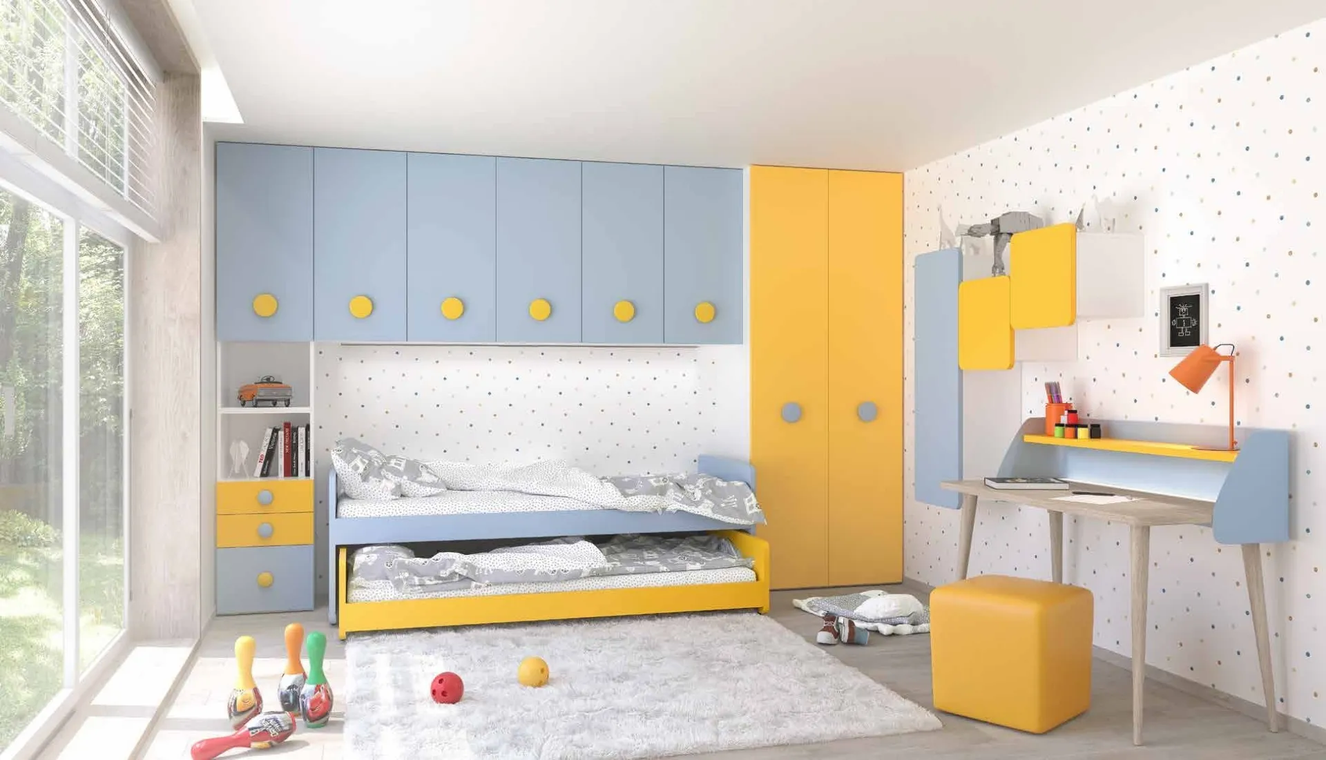 It brings aesthetic value and vibrant colors to the room dedicated to the little ones with this proposal, one of the Children's Bridge Bedrooms by S75. If you're looking for creative ideas to furnish your children's room excellently, we propose the Bridge Bedroom with a pull-out bed Open 16 by S75 with a melamine finish. When it comes to furnishing the youth's room, rely on us: in our store, we offer all the most exclusive modern compositions for their room. S75 offers a wide range of customized accessories to match: you will find a bed, wardrobe, work table, chairs, and bookshelves. This melamine solution greatly enhances the practical qualities and aesthetics of the bedroom, as it is capable of combining ergonomics and safety.