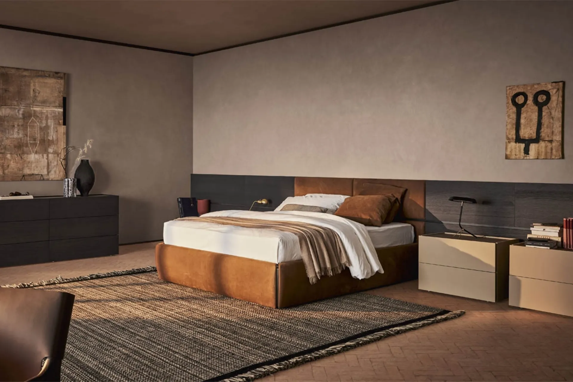 If you wish to design modern spaces, we await you to propose our Home Furniture design to create your custom project. Discover in-store a rich catalog of box spring beds, furniture, and bedroom accessories from top manufacturers. If you wish to recreate an intimate and relaxing atmosphere, the model shown in the photo is perfect for you: in the resting room, you will have to recreate a relaxing atmosphere to refresh your psychic and physical energies every night. Reliability of materials and great comfort are the aspects that characterize all the brand's products, including the leather bed in the image. With the Pianca Leather Box Spring Bed with Wooden Boiserie from the well-known and renowned brand, a specialist in the field, you can embellish your sleeping area, ensuring comfort, practicality, and clean design.