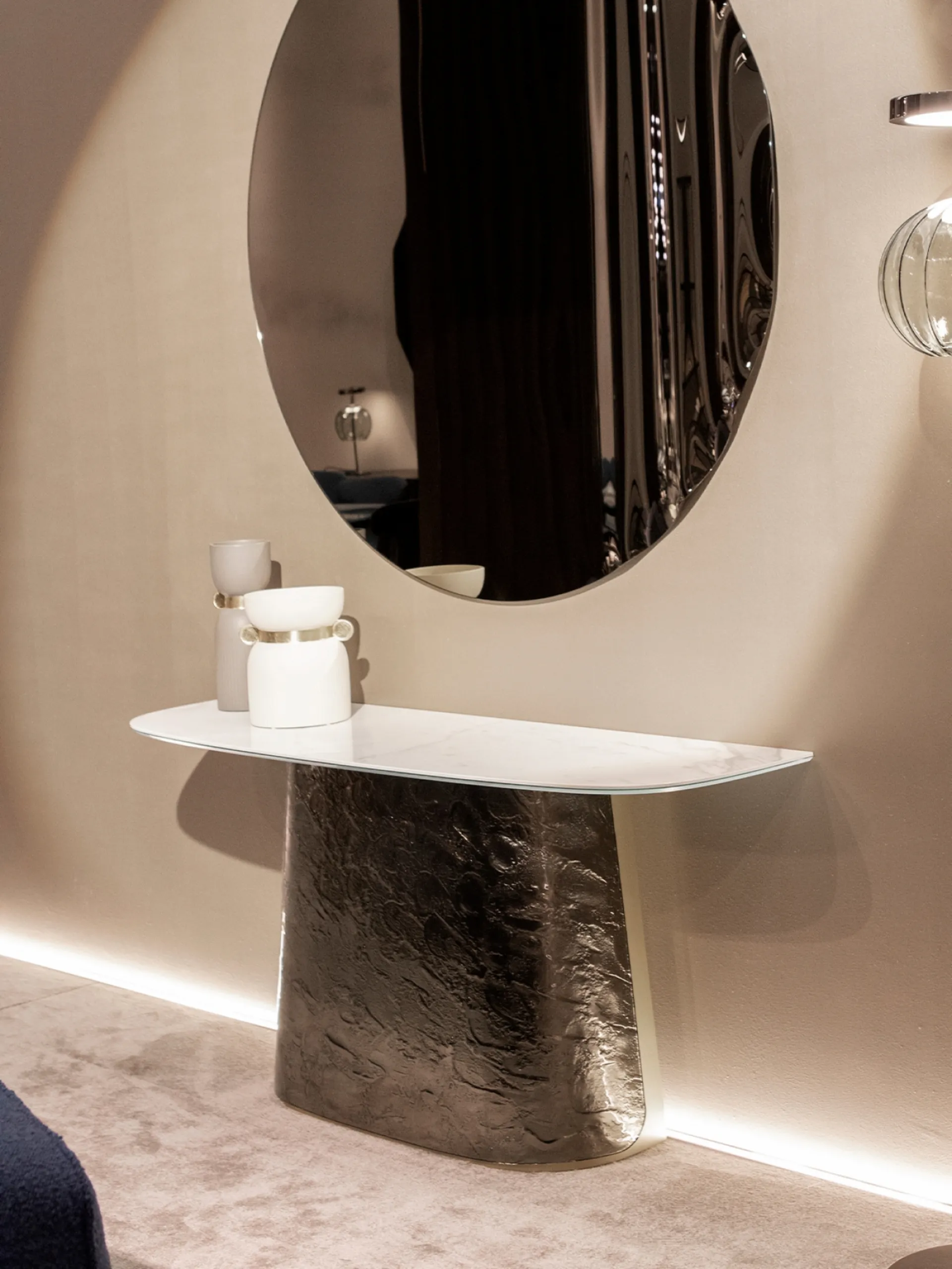 La consolle Adone, firmata Tonin Casa, rappresenta un'eccellenza nel design d'interni, grazie alla sua struttura scultorea e alla meticolosa lavorazione artigianale. Il pezzo si distingue per l'innovativa fusione di materiali: un top dalle finiture naturali e una base in vetro curvato bocciardato e retroargentato, disponibile nelle colorazioni bronzo o nero, che ne esaltano la raffinatezza. Questo approccio progettuale garantisce un'estetica distintiva e una funzionalità intrinseca, rendendola un fulcro visivo in ogni ambiente. Per approfondire le specifiche tecniche e le opzioni di personalizzazione disponibili, è possibile consultare la documentazione tecnica del prodotto.