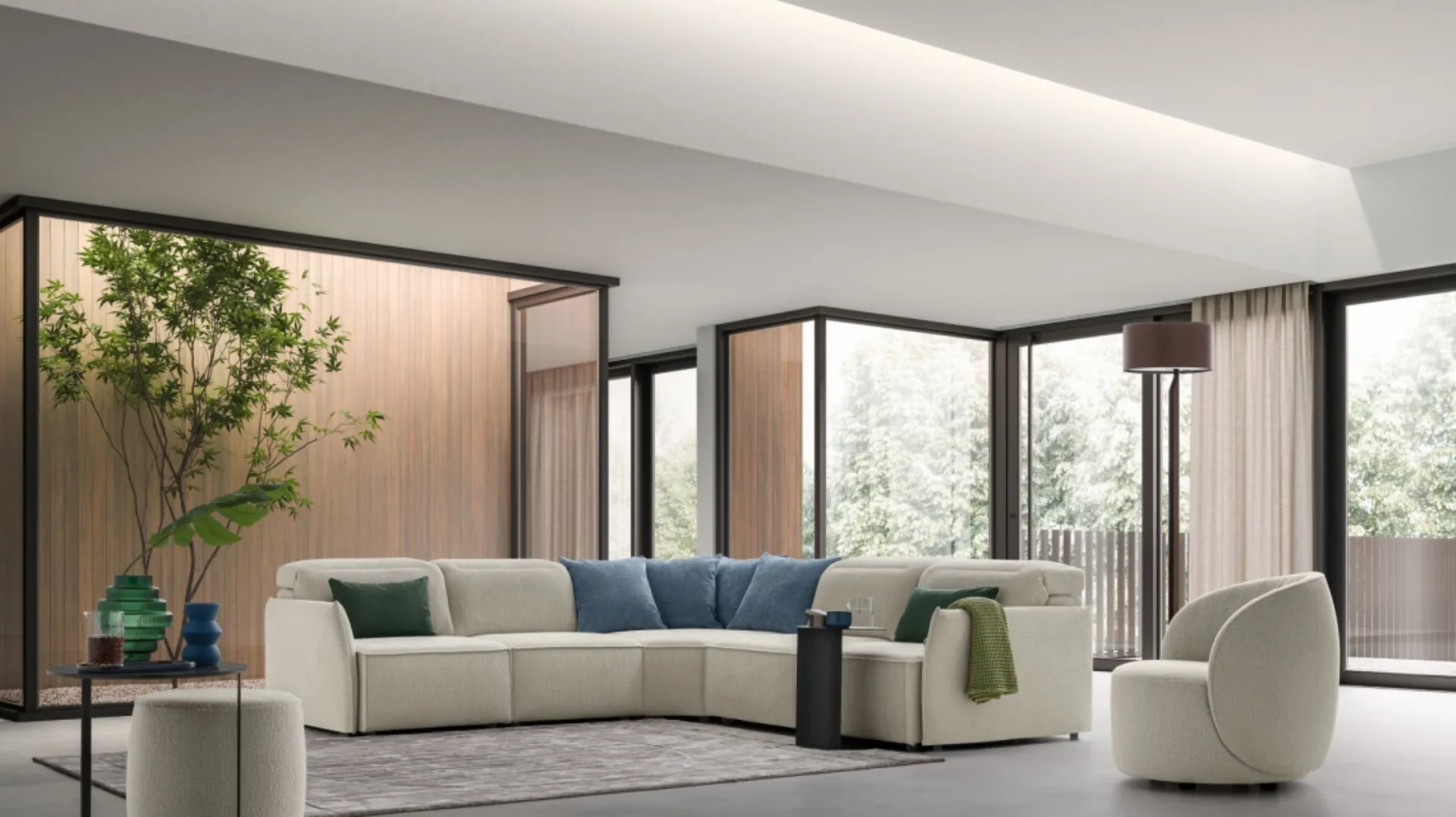 If you want corner sofas and armchairs like the model in the photo, characterized by volumes that invite you to enjoy your moments of relaxation. Our living rooms are designed to be combined with accessories of all kinds, such as coffee tables, lamps, and floor lamps, or in combination with additional fabric sofas. The Le Comfort catalog offers many inspirations for furnishing the habitat with functionality and aesthetics, focusing on your comfort. The sofa line from the aforementioned brand offers many unique ideas for furnishing the living room with functionality, comfort, and style. Le Comfort's Swan corner living room: recreates an intimate and comfortable space in modern spaces with refined aesthetics.