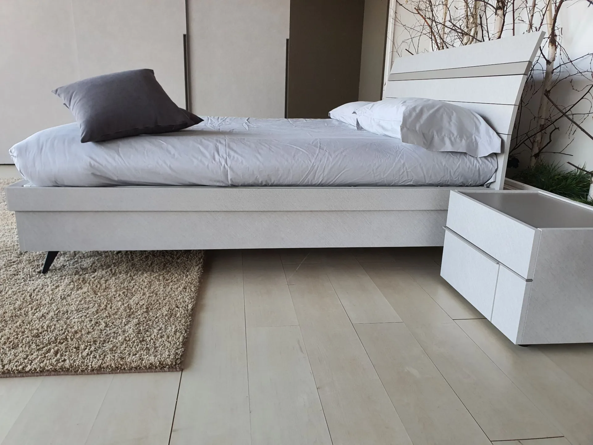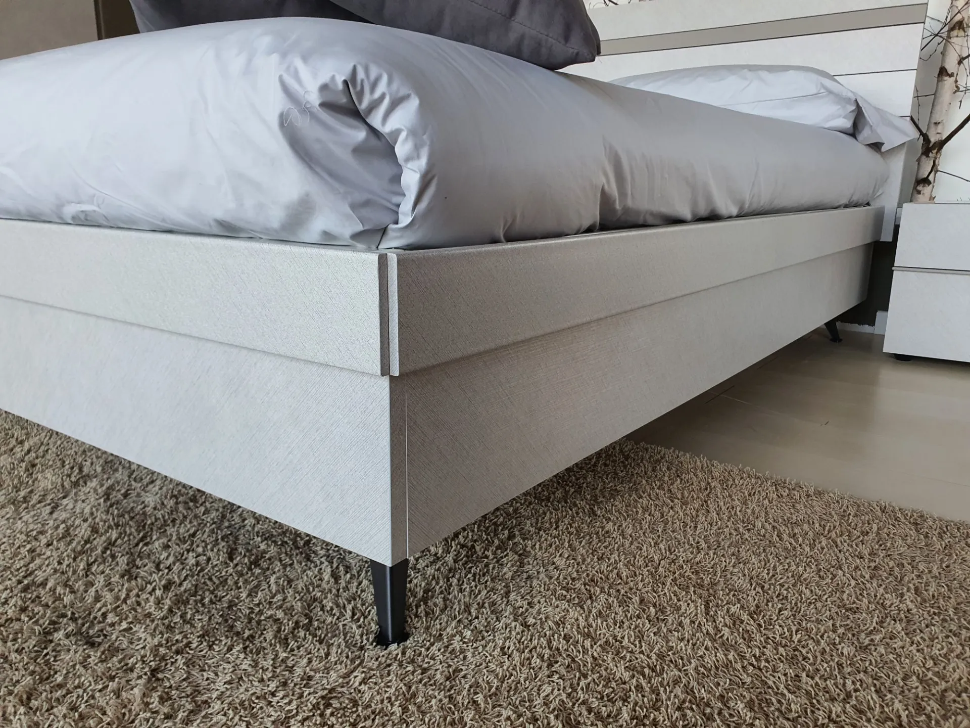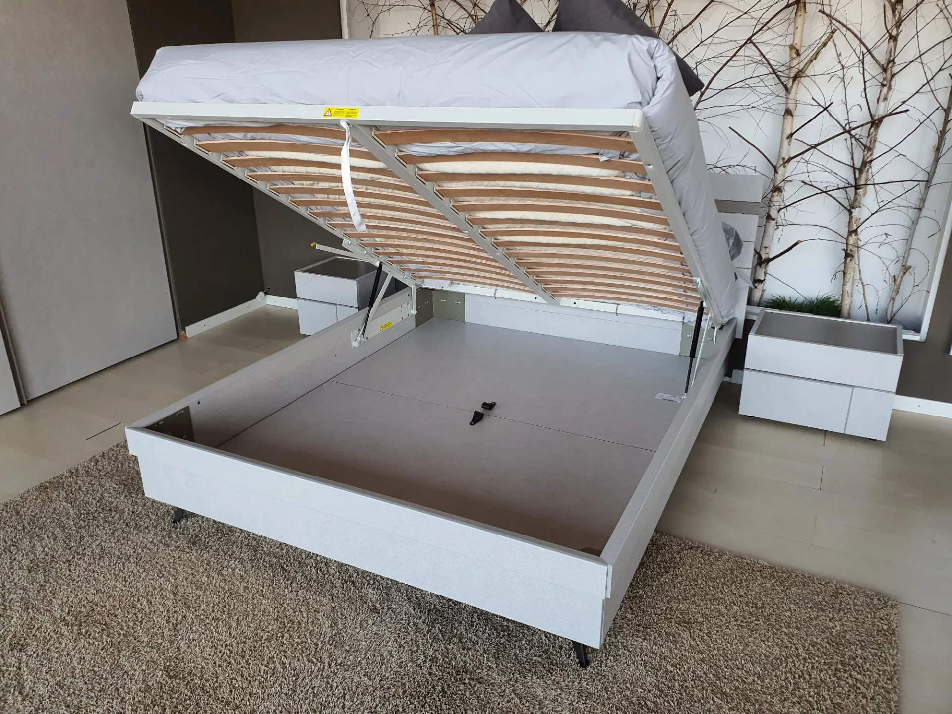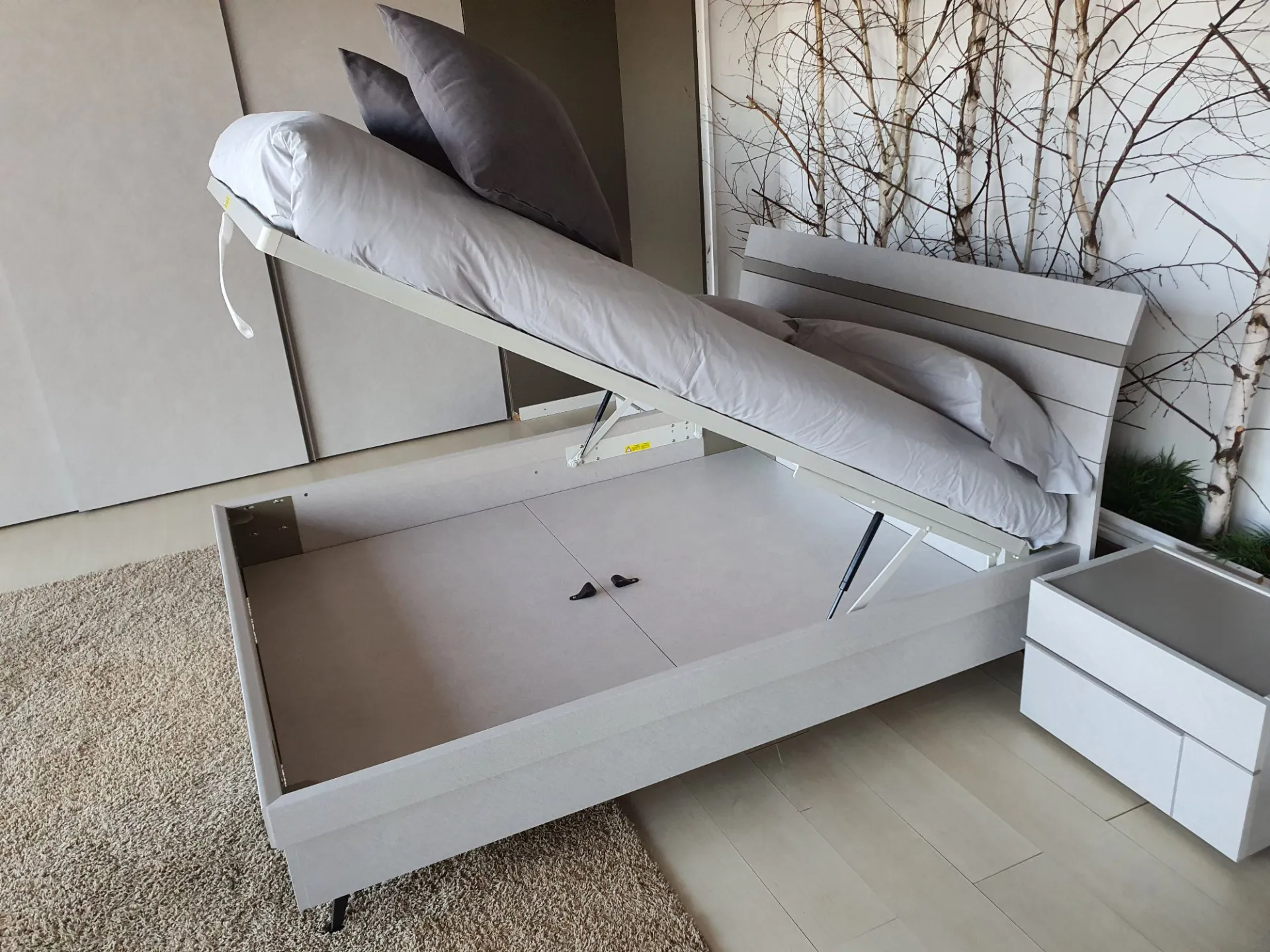 Double bed with storage mod.JOKER with a lift-up slatted bed base measuring cm.160x200 in CANVAS finish and with a matte texture ARENA border. The bed is elevated from the ground thanks to the anthracite-colored metal feet, allowing for easy cleaning underneath the bed. The overall dimensions are cm L.176xP.217xH.95 and the slatted bed base measures cm 160x200. Product available for immediate delivery! Contact us for more information!