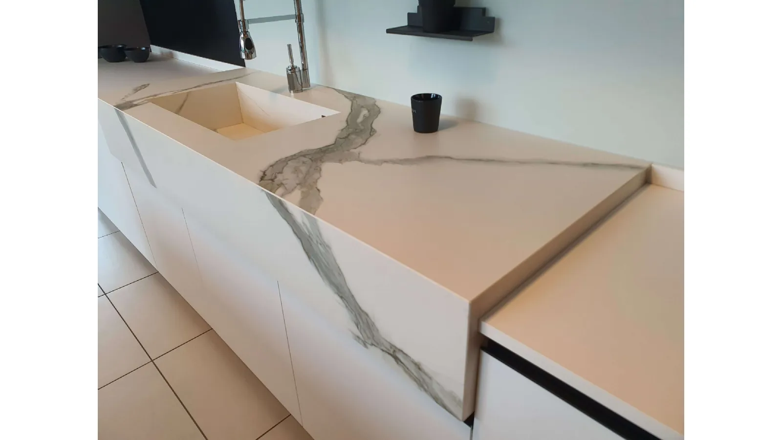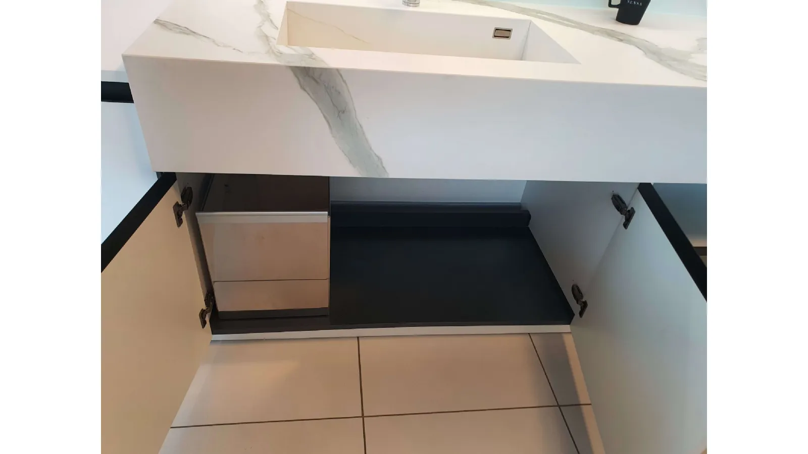 Structure in white color with fronts in MAXXIMATT 318 WHITE and Laminam TOP th.2 Calacatta Michelangelo Natural th. 1.2 cm with integrated bathtub
