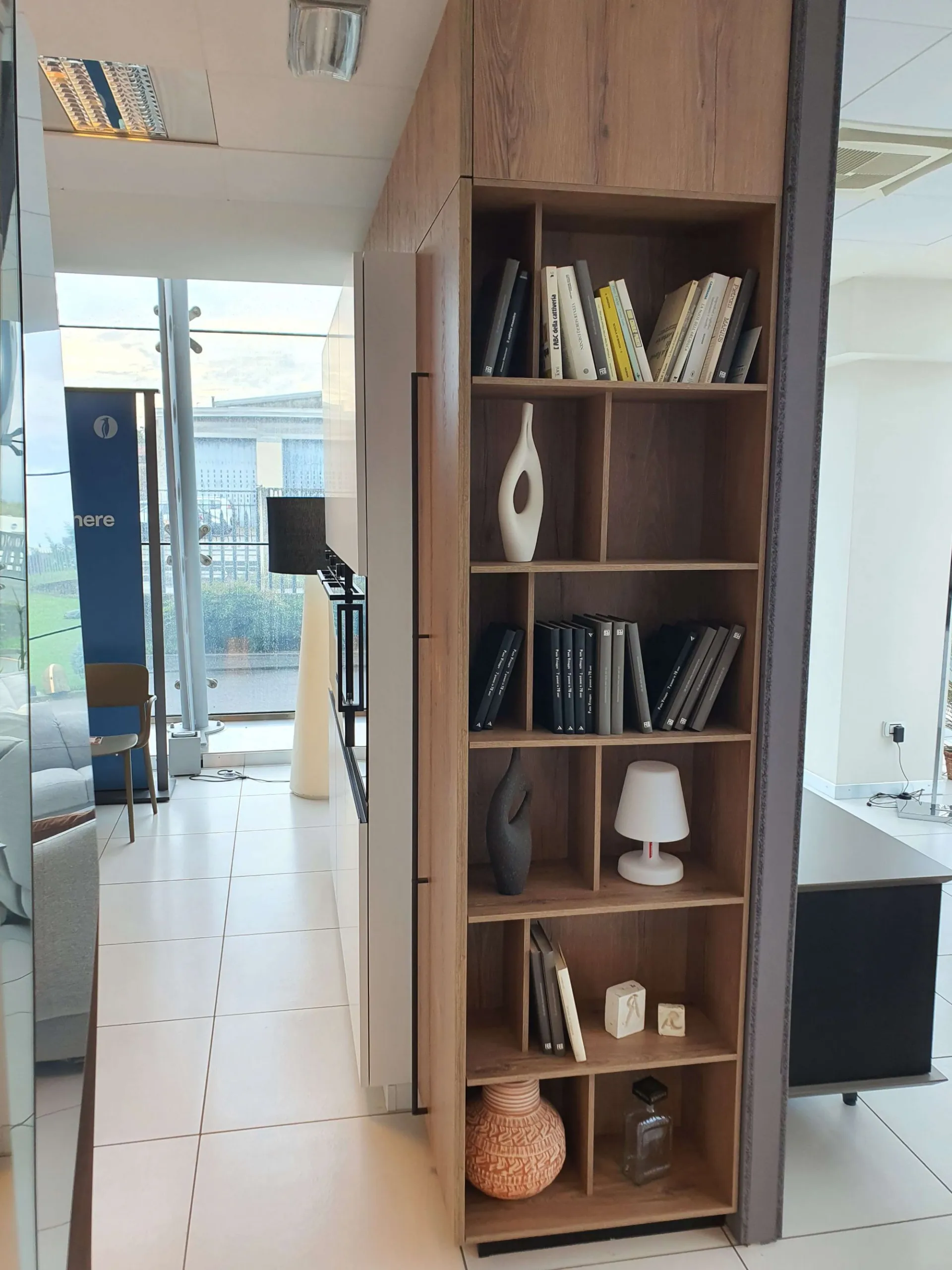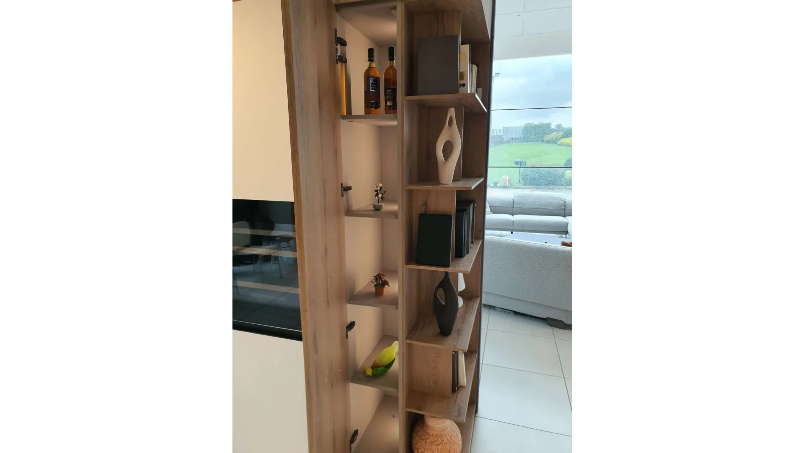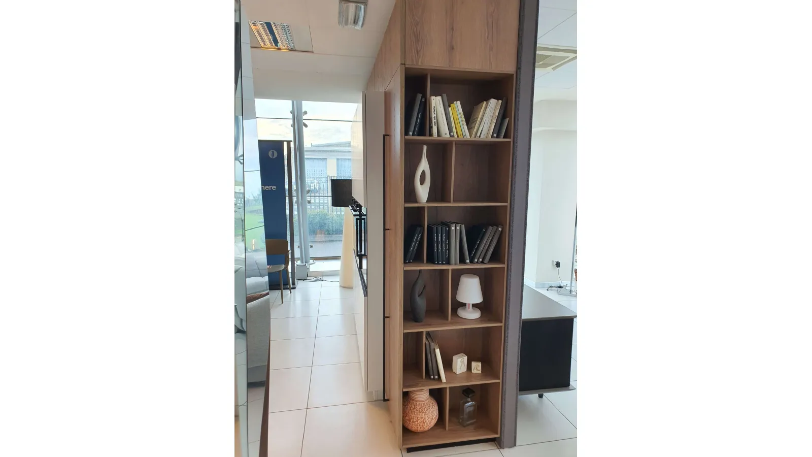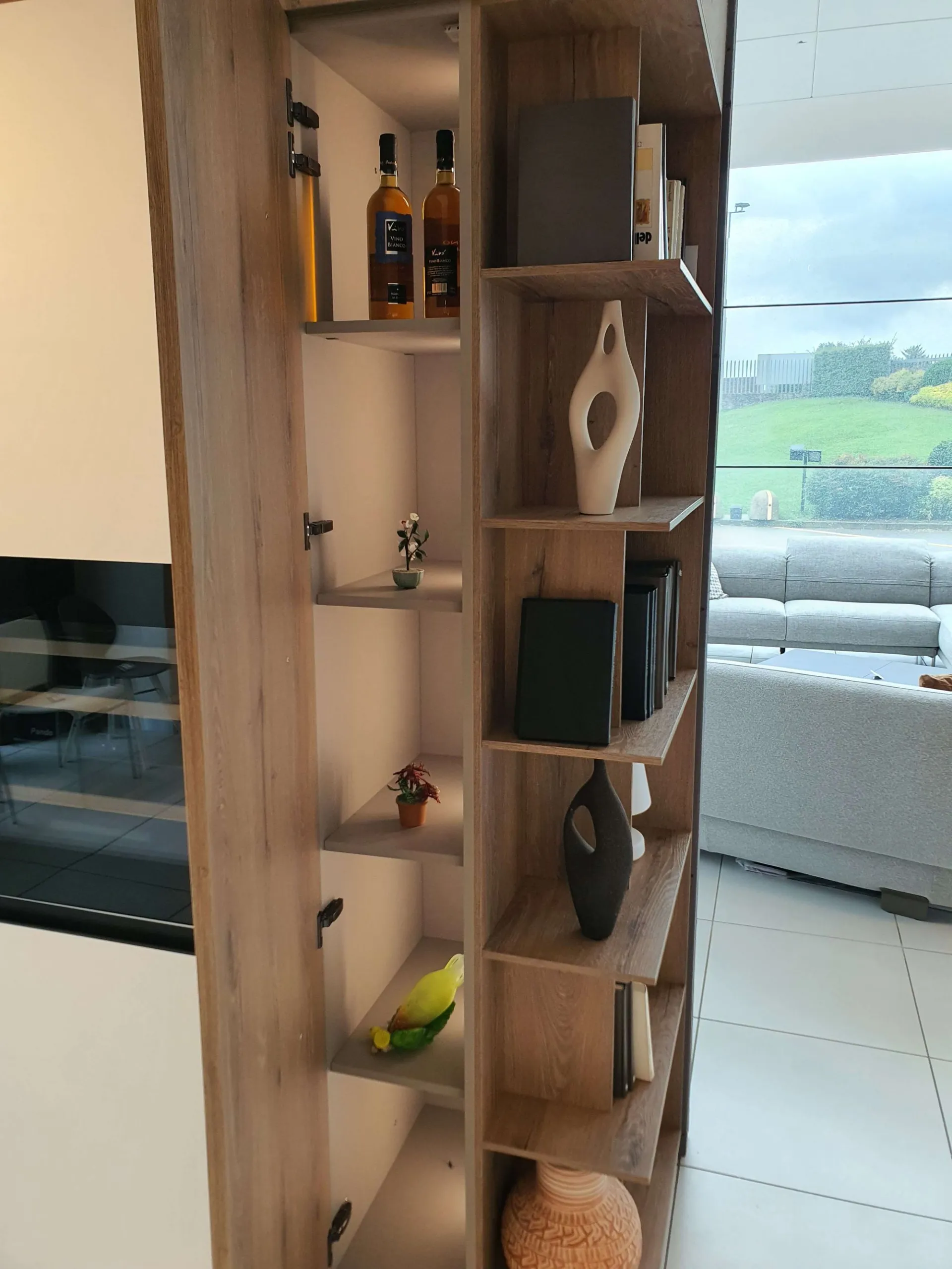 Columns with lateral open storage, wall units above column and snack top in ROVERE CUOIO 451