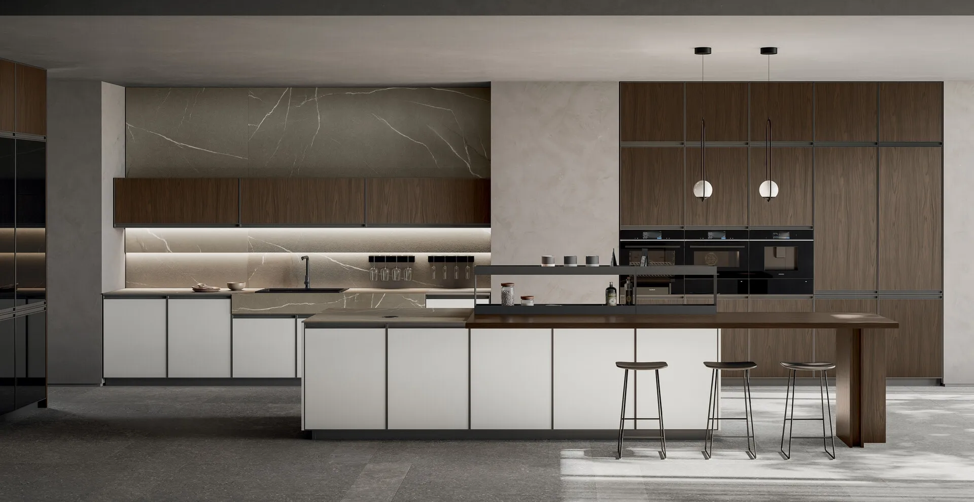 La Cucina Arredo3 Kronos 05 è un'espressione di design e funzionalità, con un'anta a telaio in alluminio e maniglia integrata che la rende esteticamente accattivante e pratica. Questa composizione, che include una maestosa isola centrale, colonne in laminato noce Imperial, pensili in vetro fumè, basi e isola in Pet inox e top in finitura Dekton Kelya, è pensata per durare nel tempo. Il nostro servizio completo include progettazione personalizzata, consegna e montaggio professionale, con copertura estesa in aree come Lugano, Chiasso, Bellinzona e tutti i comuni limitrofi. La vasta scelta di pannelli (laminato, HPL, Fenix-NTM®, legno, vetro o Laminam) e le soluzioni interne con cassetti e cestoni estraibili permettono di creare una cucina che risponda perfettamente alle tue esigenze. La tua soddisfazione è la nostra priorità: forniamo un servizio a 360 gradi, dalla consulenza iniziale all'assistenza a lungo termine, su tutta la nostra area di competenza.