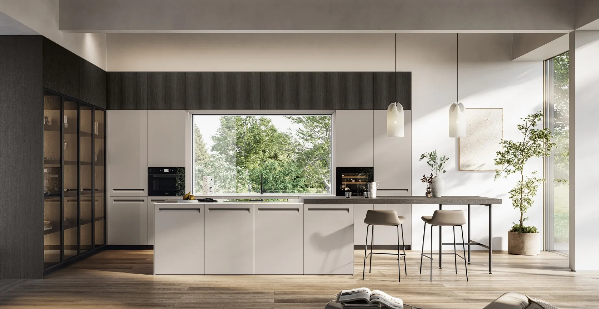 The purchase of one of the Modern Kitchens by the Arredo3 brand ensures a wide range of design options and maximum reliability: find out more about the Modern Kitchen with island Tekna 01 by Arredo3. The model in Pet in the photograph can be designed in various layouts, colors, and finishes with great visual impact to allow you to interpret the space with rationality, guaranteeing practicality and functionality that you need. If you are a fan of modern compositions and do not compromise on the quality assured by the well-known and renowned brand, then our showroom is the ideal place.
