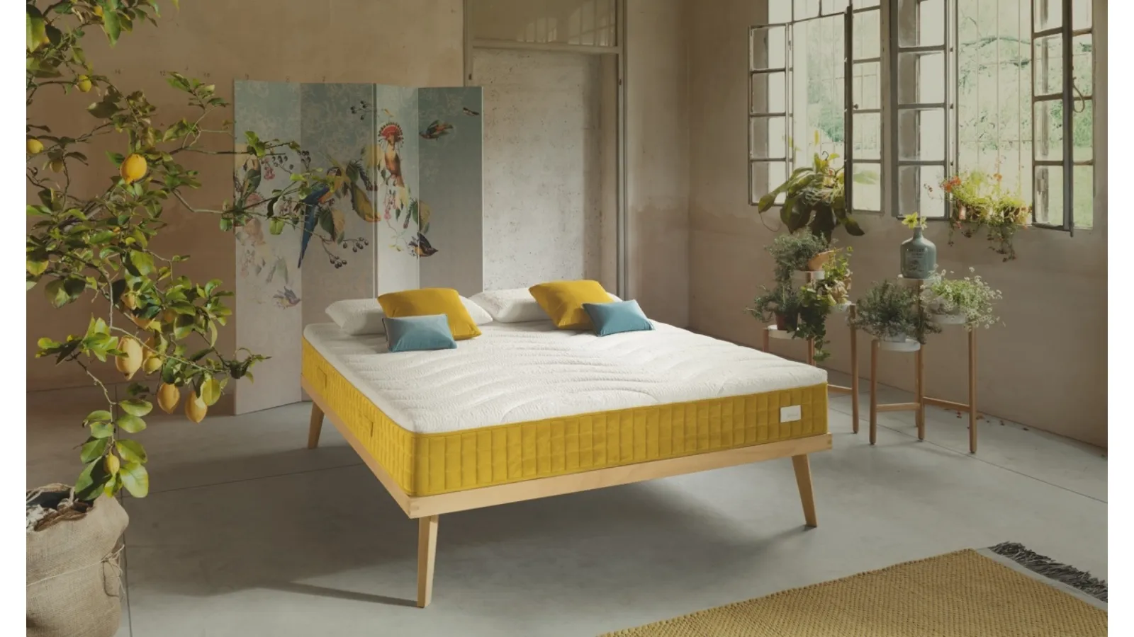 | Materiale: | Schiumato naturale Grand Soleil (a base di olio di girasole e acqua), rivestimenti in fibre naturali (Tencel®, cotone, bamboo, bioceramica). |
