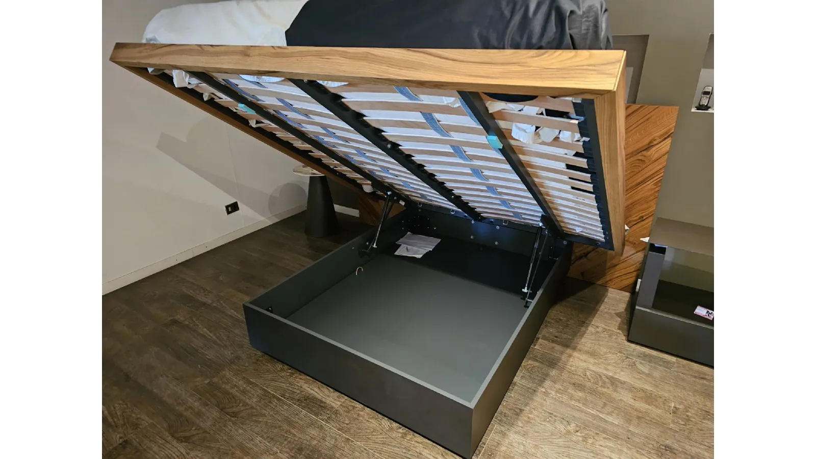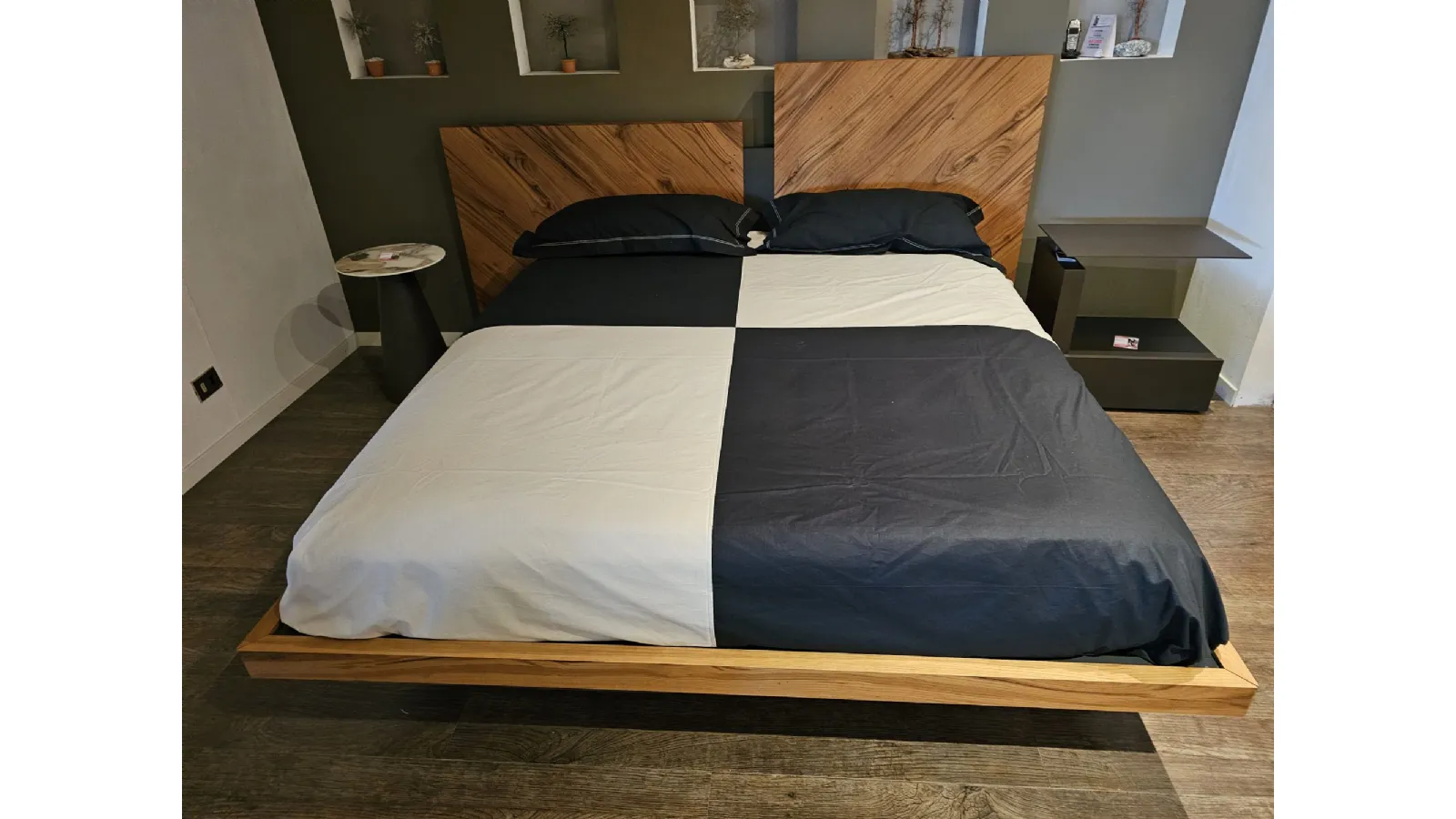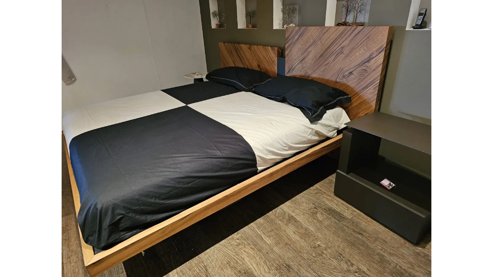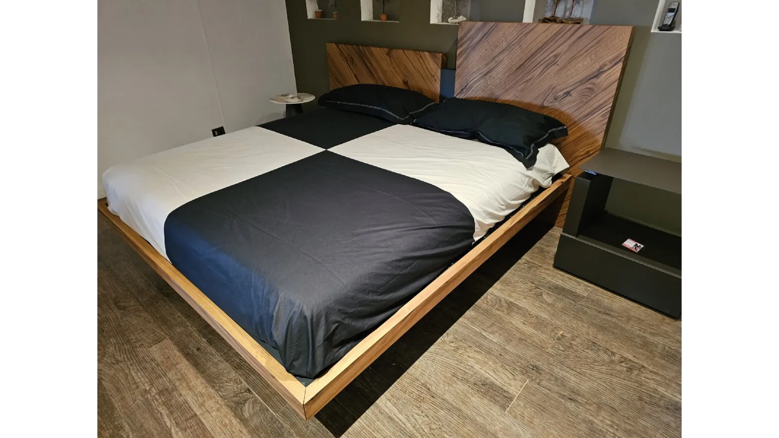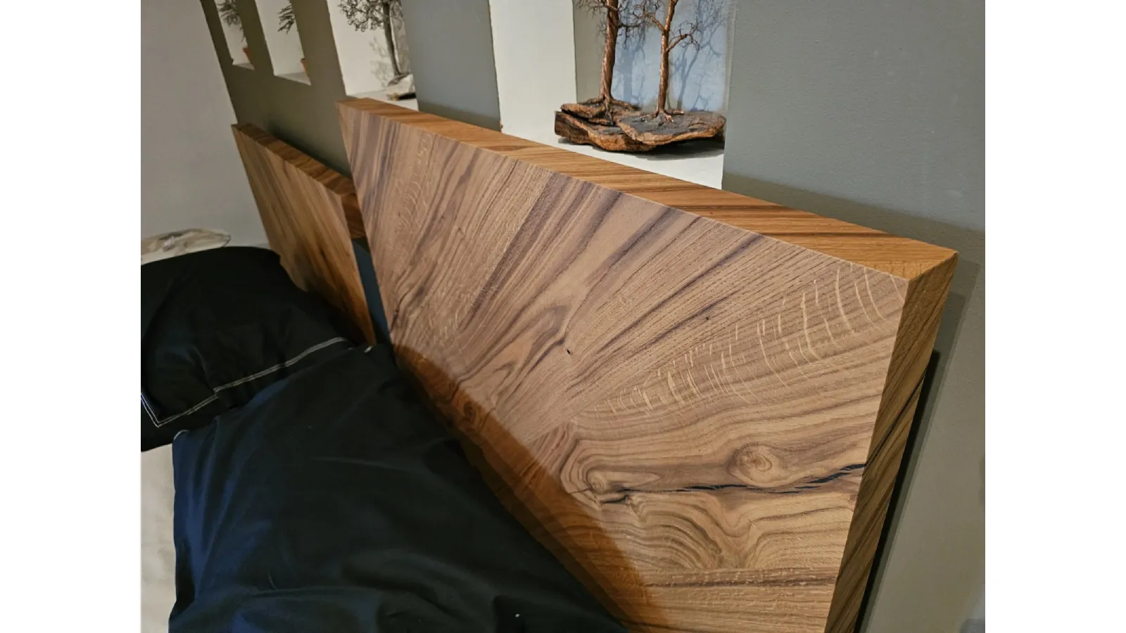 Nazare bed with asymmetric headboard and wooden bed frame, central inserts on the headboard and footboard in lacquered finish. Mattress support through wooden slats. Natural old wood finish PZ91 with central panel in graphite lacquered color. Measurement: cm L.232xW.218xH.100-120 (suitable for 180x200 mattress) + LED footboard kit (evening activation on the right/left through a 2-meter range presence sensor and automatic shut-off after 1 minute)