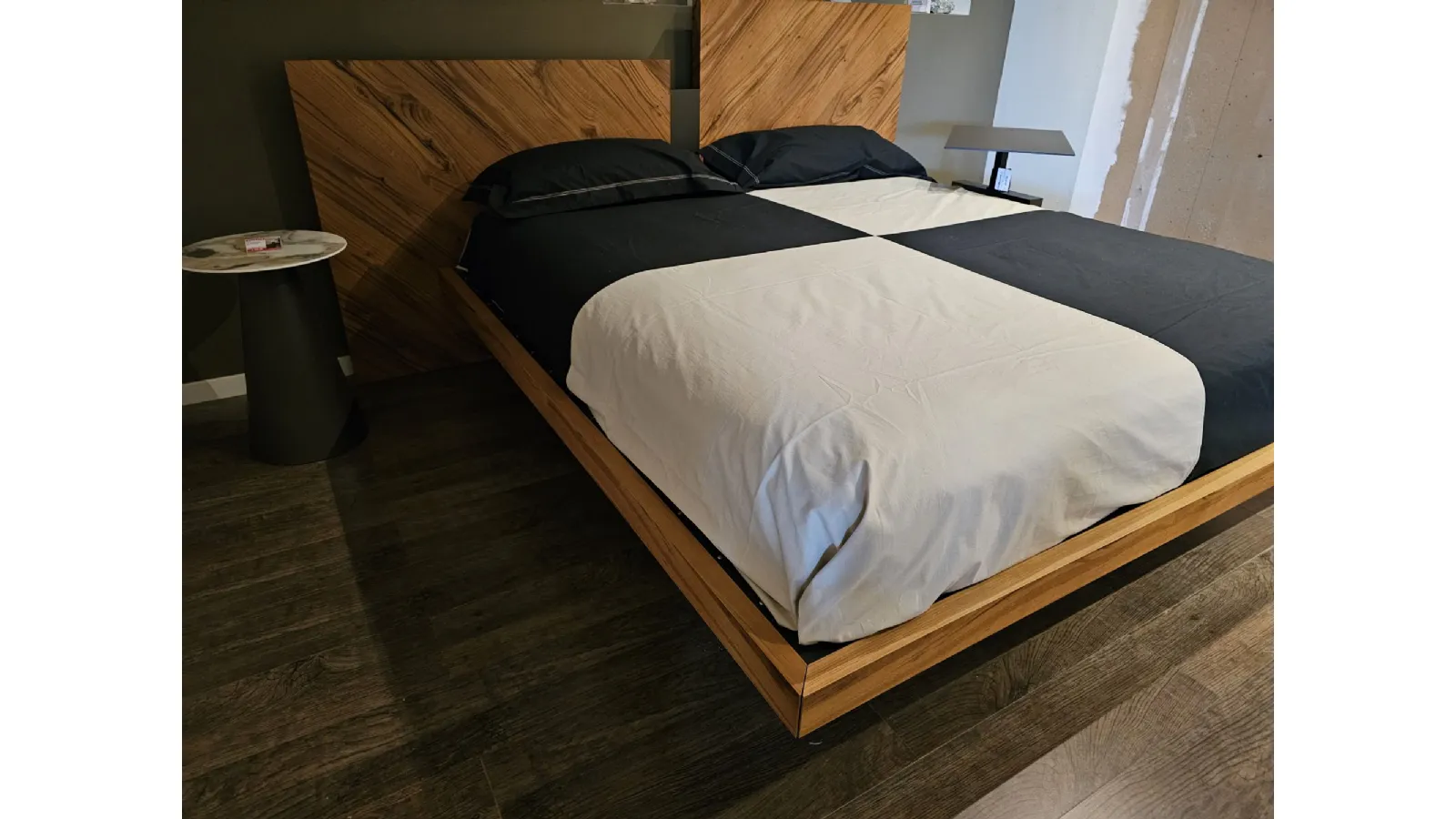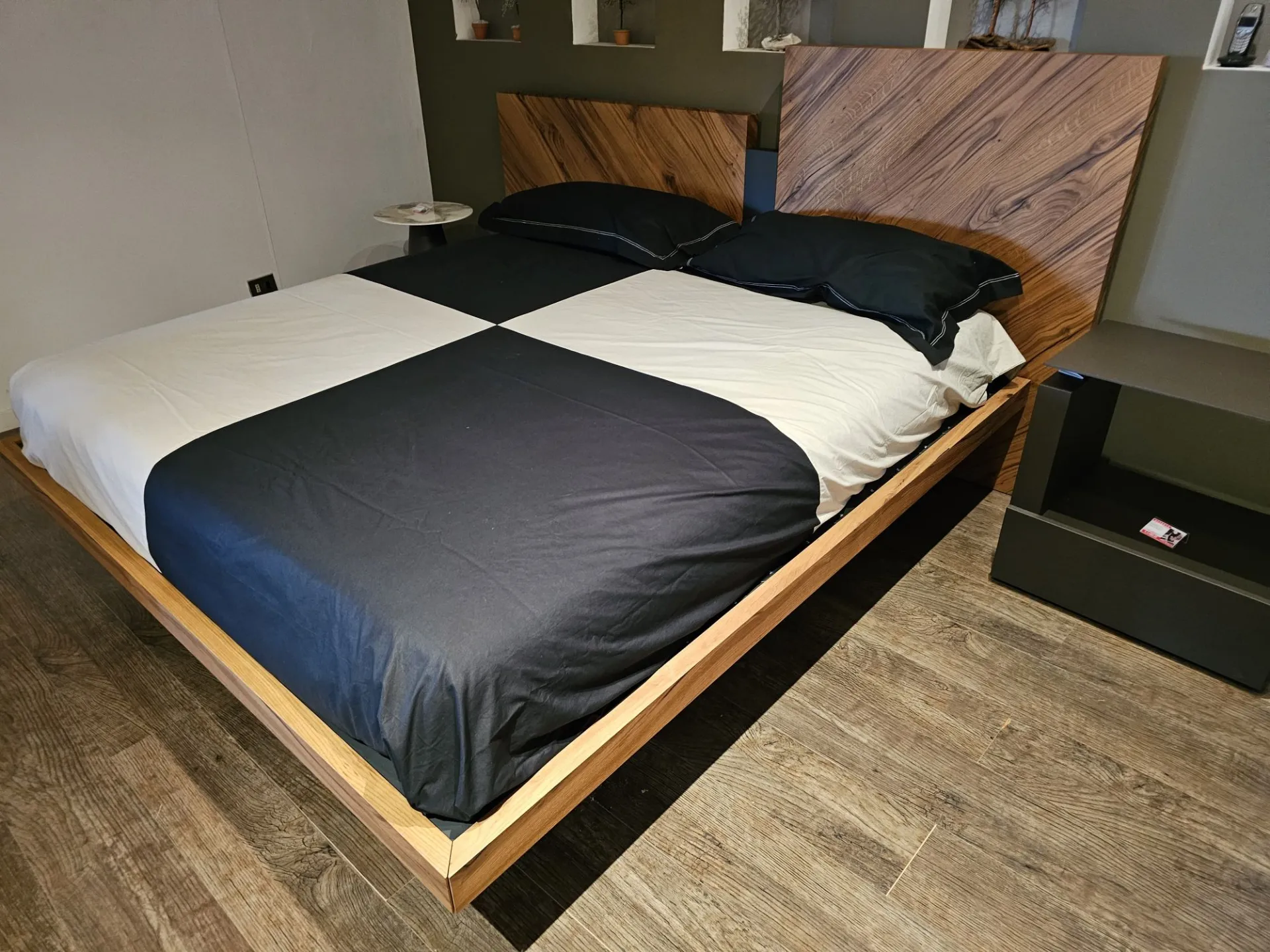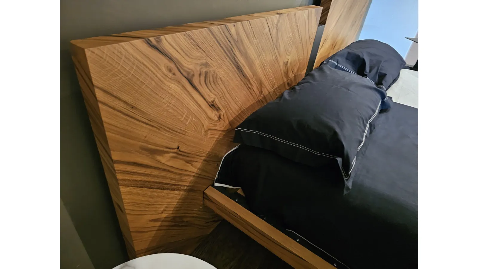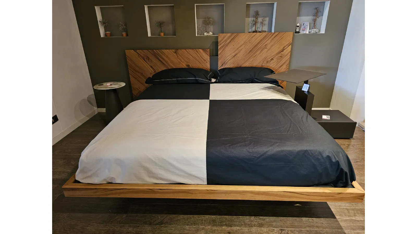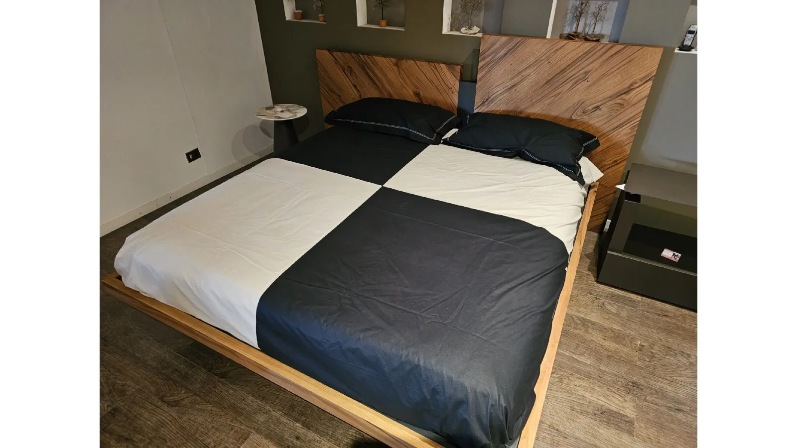 Nazare bed with asymmetric headboard and wooden bed frame, central inserts on the headboard and footboard in lacquered finish. Mattress support through wooden slats. Natural old wood finish PZ91 with central panel in graphite lacquered color. Measurement: cm L.232xW.218xH.100-120 (suitable for 180x200 mattress) + LED footboard kit (evening activation on the right/left through a 2-meter range presence sensor and automatic shut-off after 1 minute)