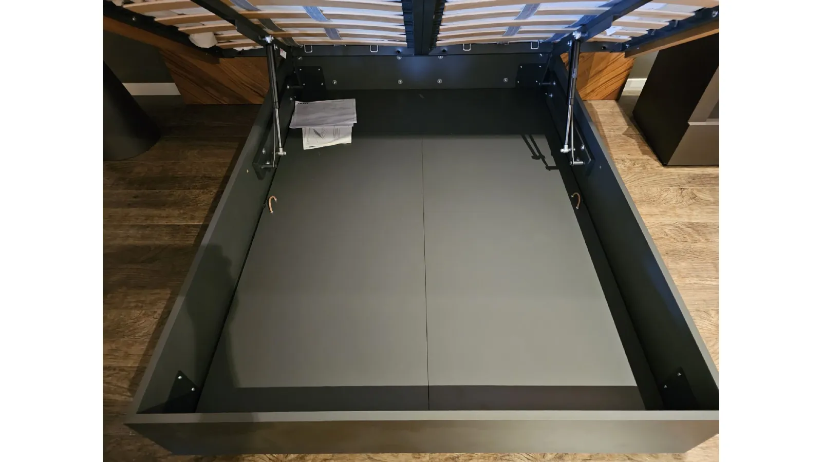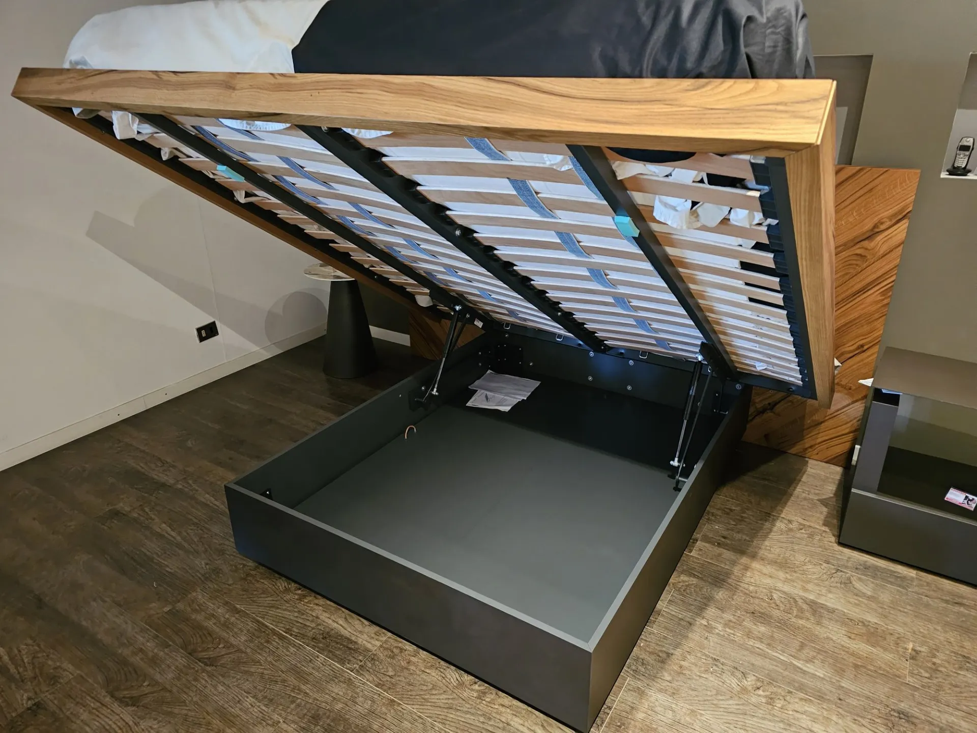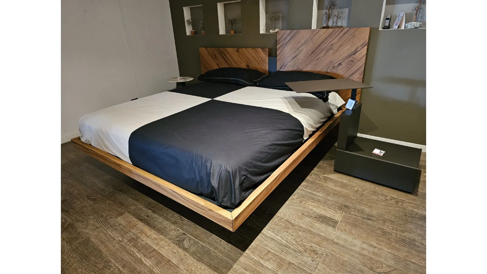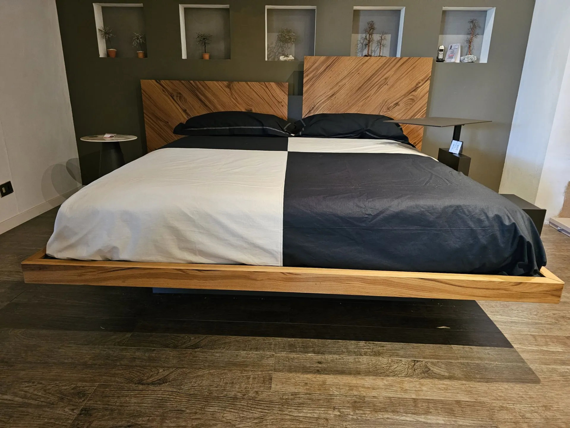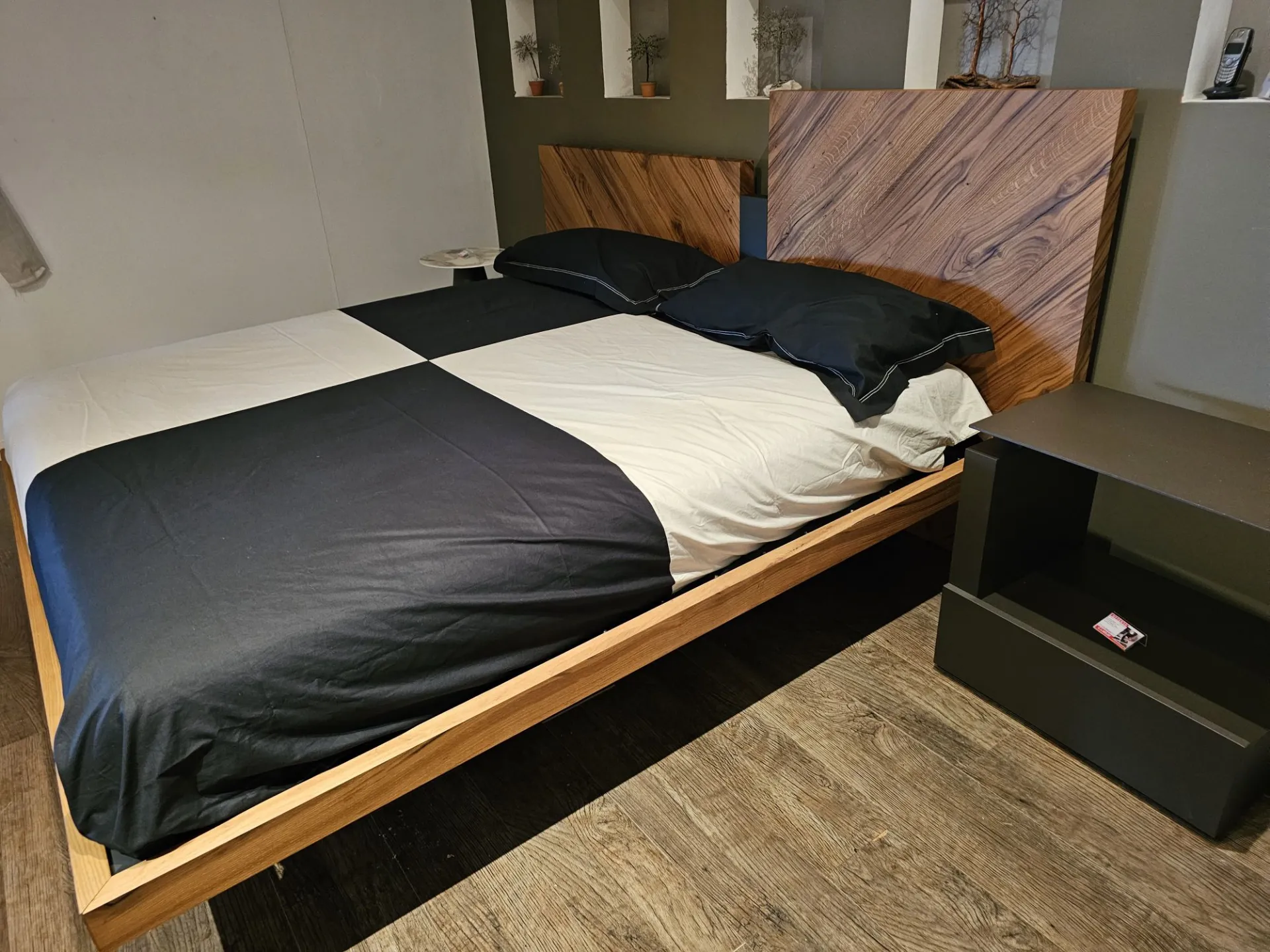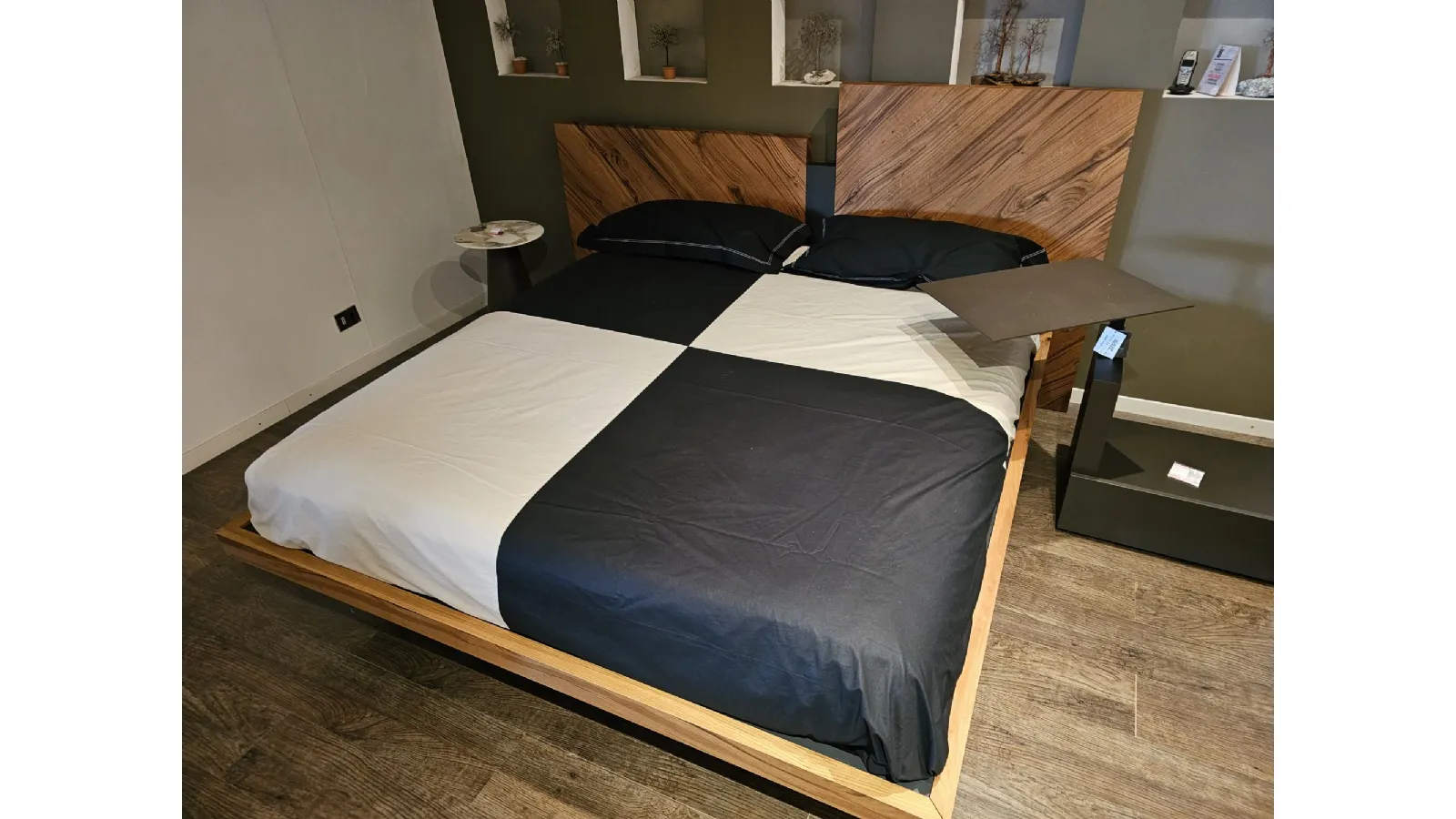 Nazare bed with asymmetric headboard and wooden bed frame, central inserts on the headboard and footboard in lacquered finish. Mattress support through wooden slats. Natural old wood finish PZ91 with central panel in graphite lacquered color. Measurement: cm L.232xW.218xH.100-120 (suitable for 180x200 mattress) + LED footboard kit (evening activation on the right/left through a 2-meter range presence sensor and automatic shut-off after 1 minute)
