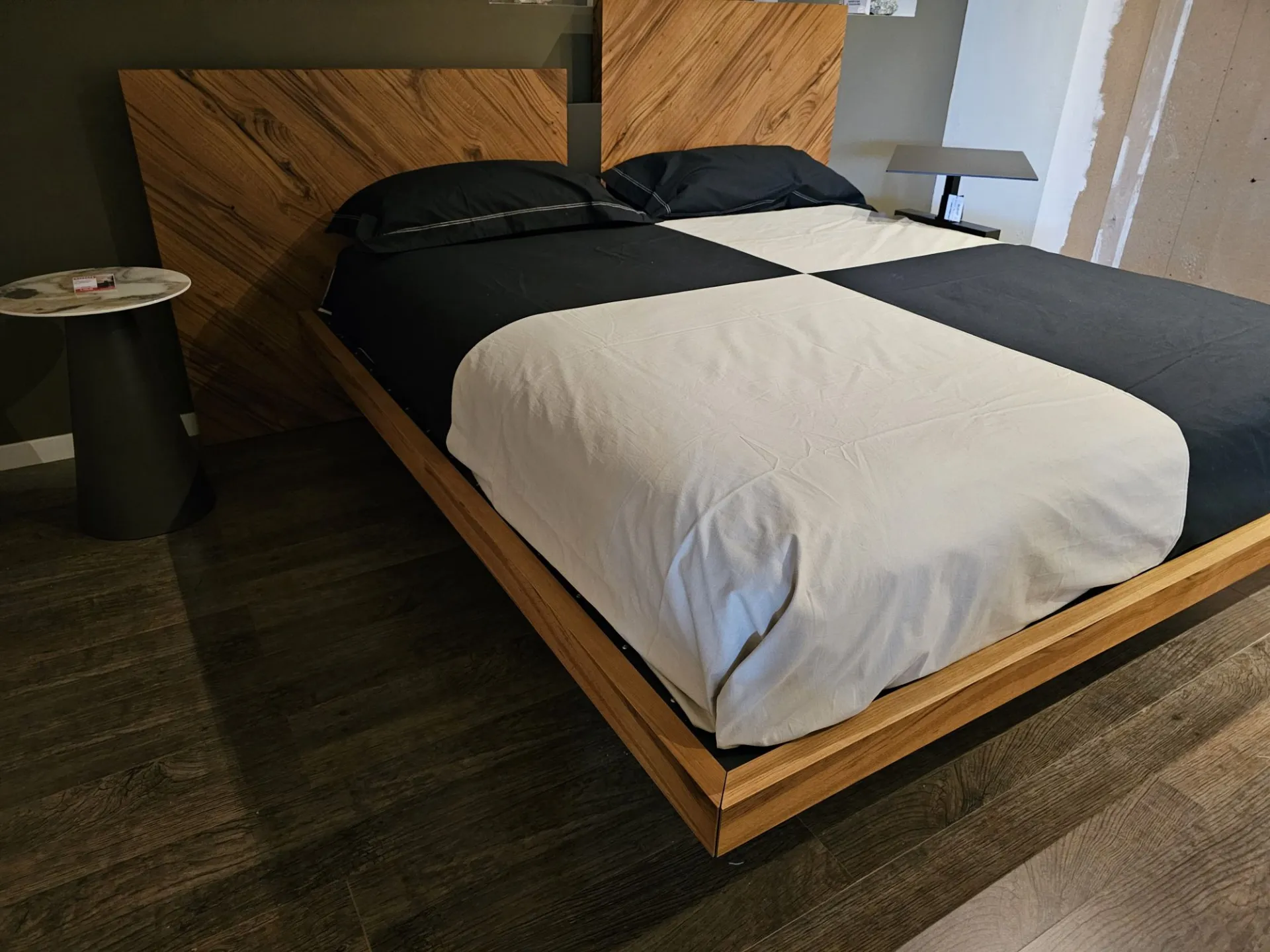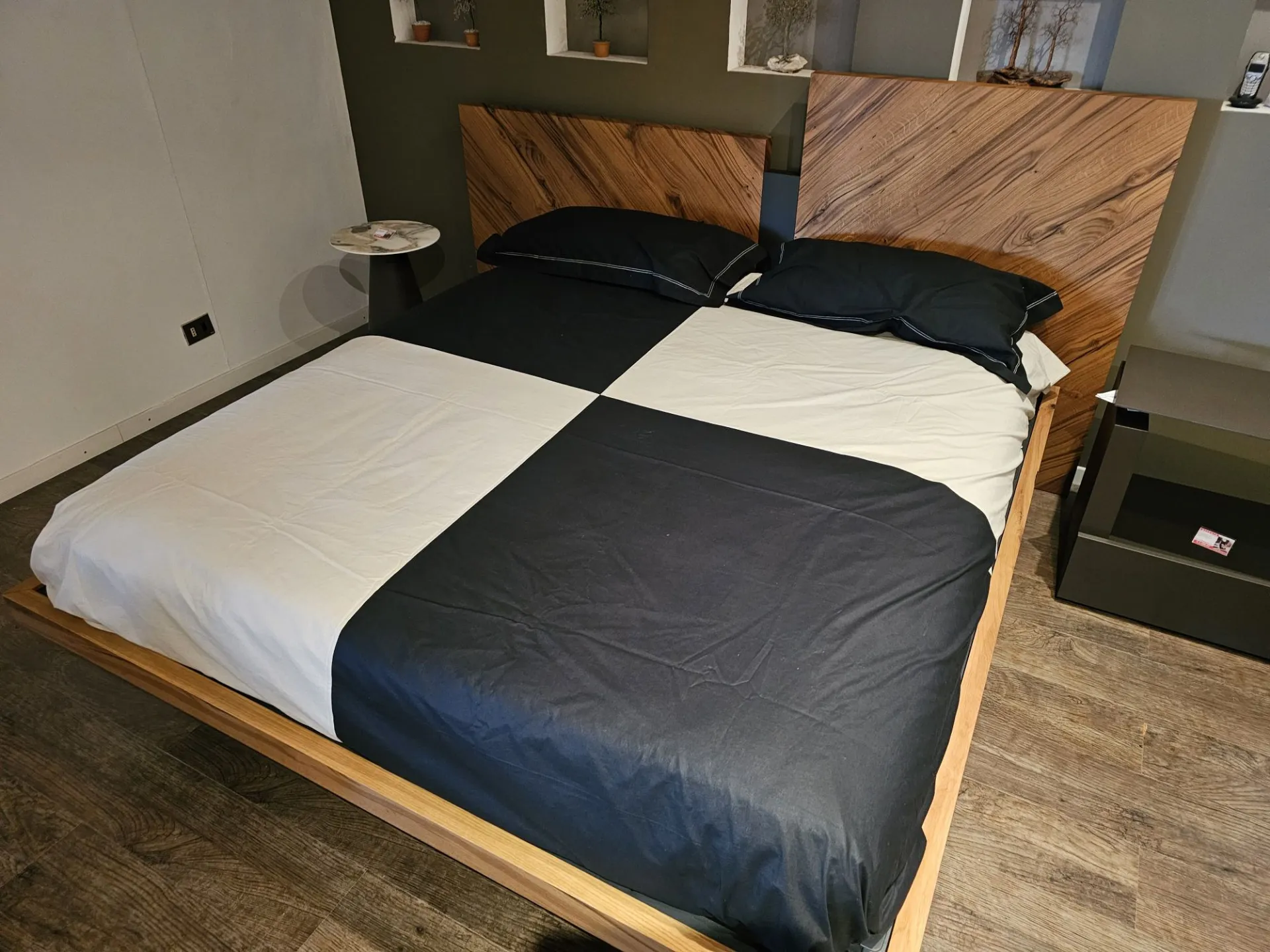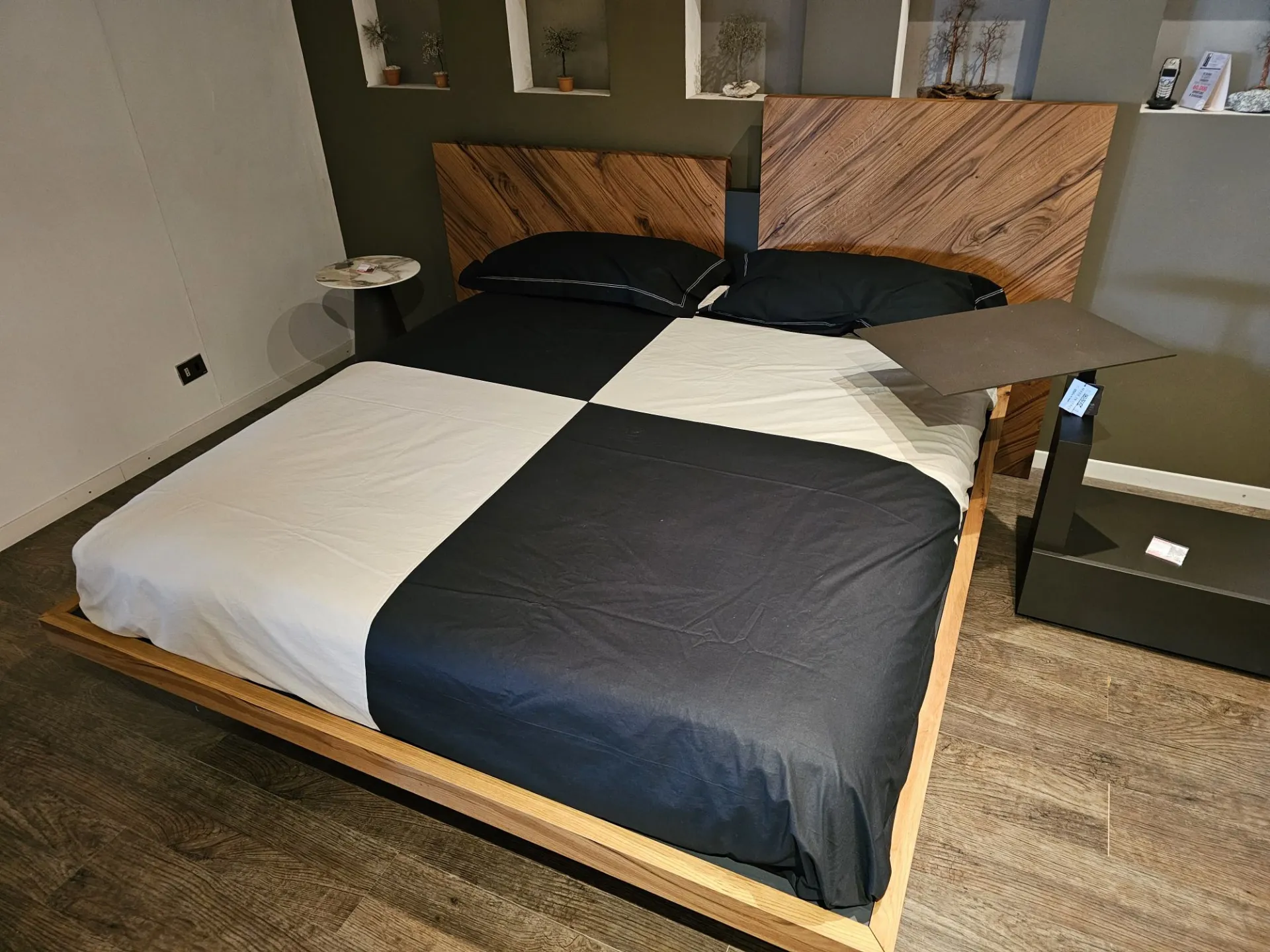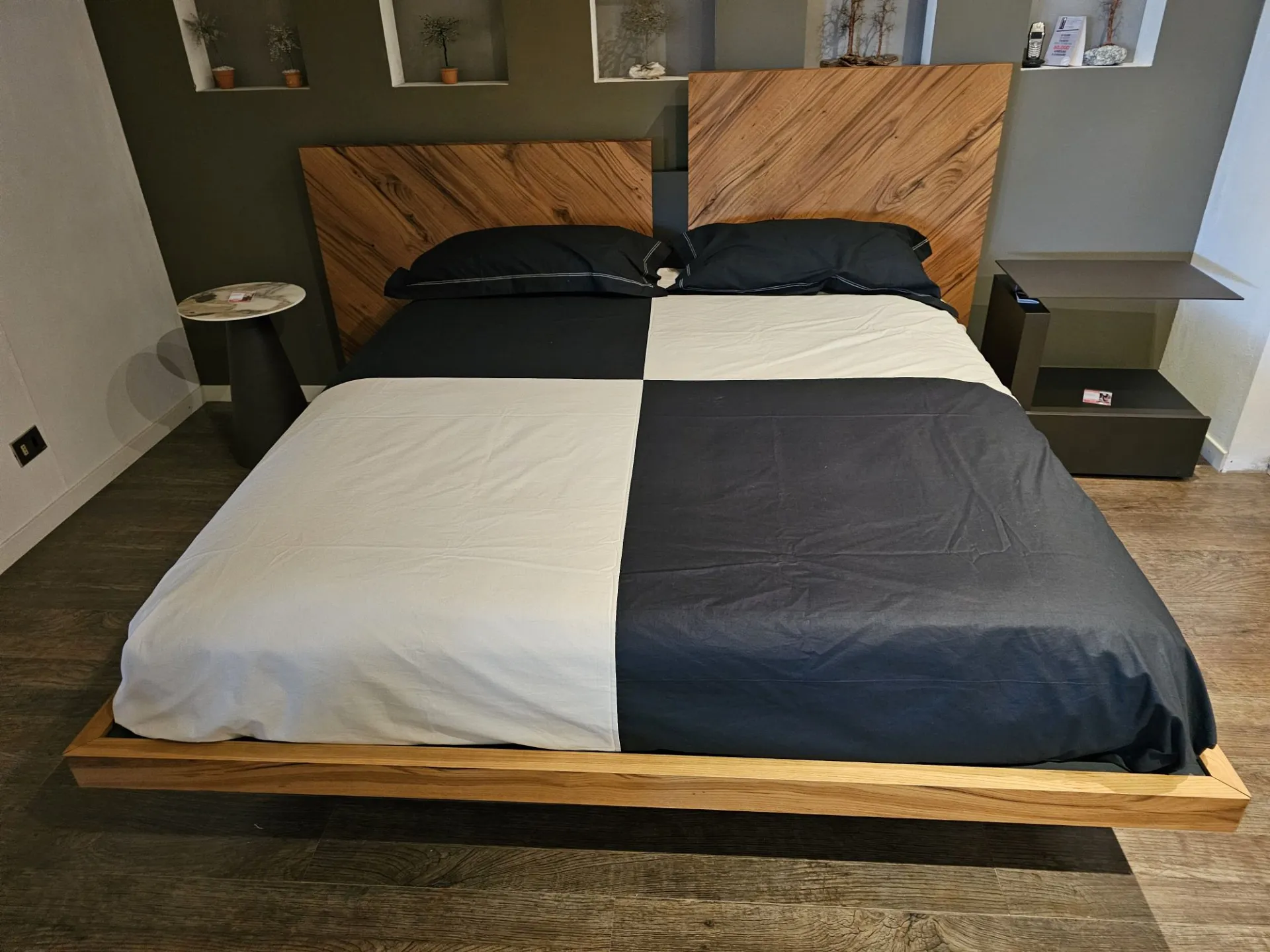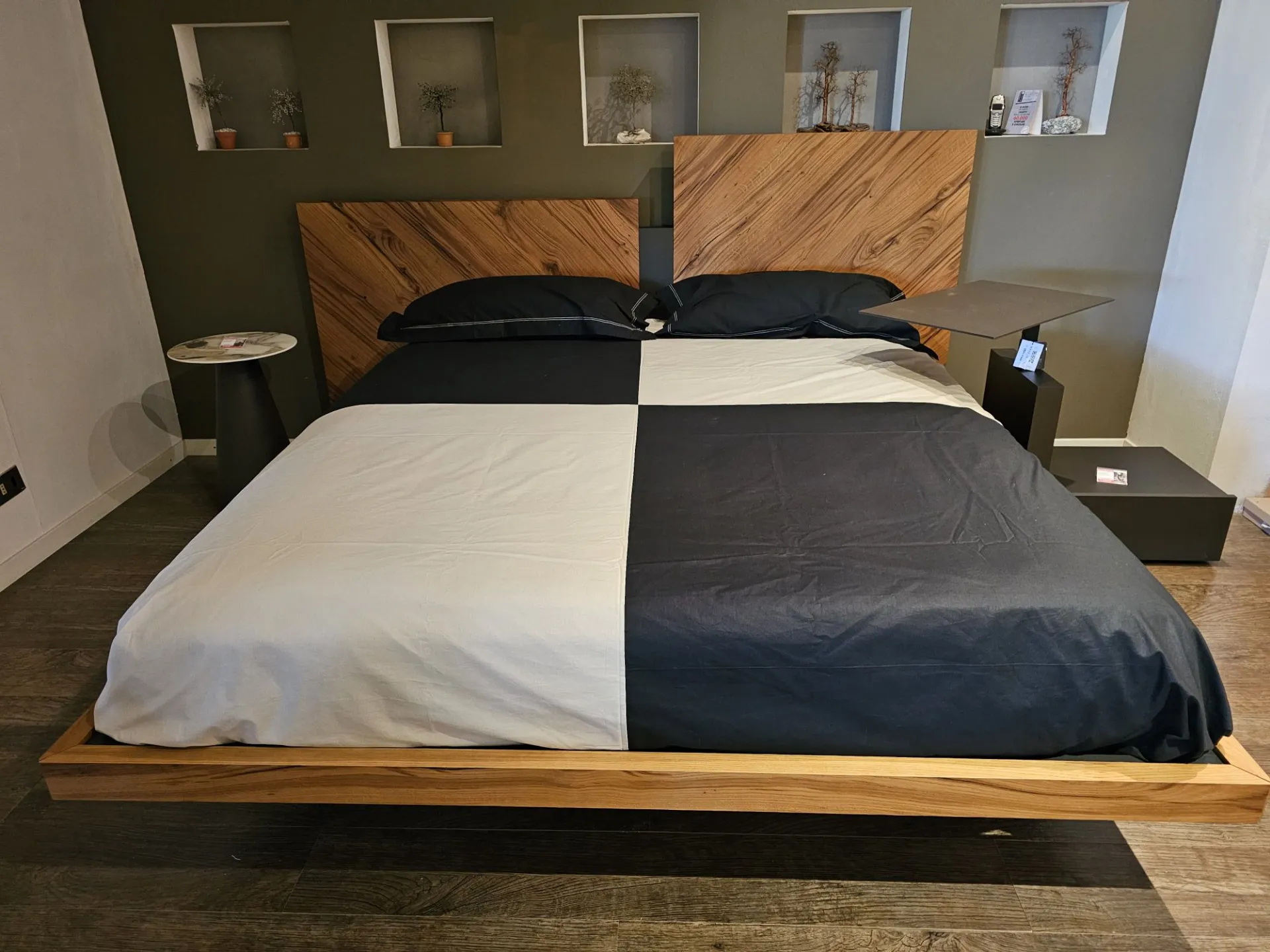 Nazare bed with asymmetric headboard and wooden bed frame, central inserts on the headboard and footboard in lacquered finish. Mattress support through wooden slats. Natural old wood finish PZ91 with central panel in graphite lacquered color. Measurement: cm L.232xW.218xH.100-120 (suitable for 180x200 mattress) + LED footboard kit (evening activation on the right/left through a 2-meter range presence sensor and automatic shut-off after 1 minute)