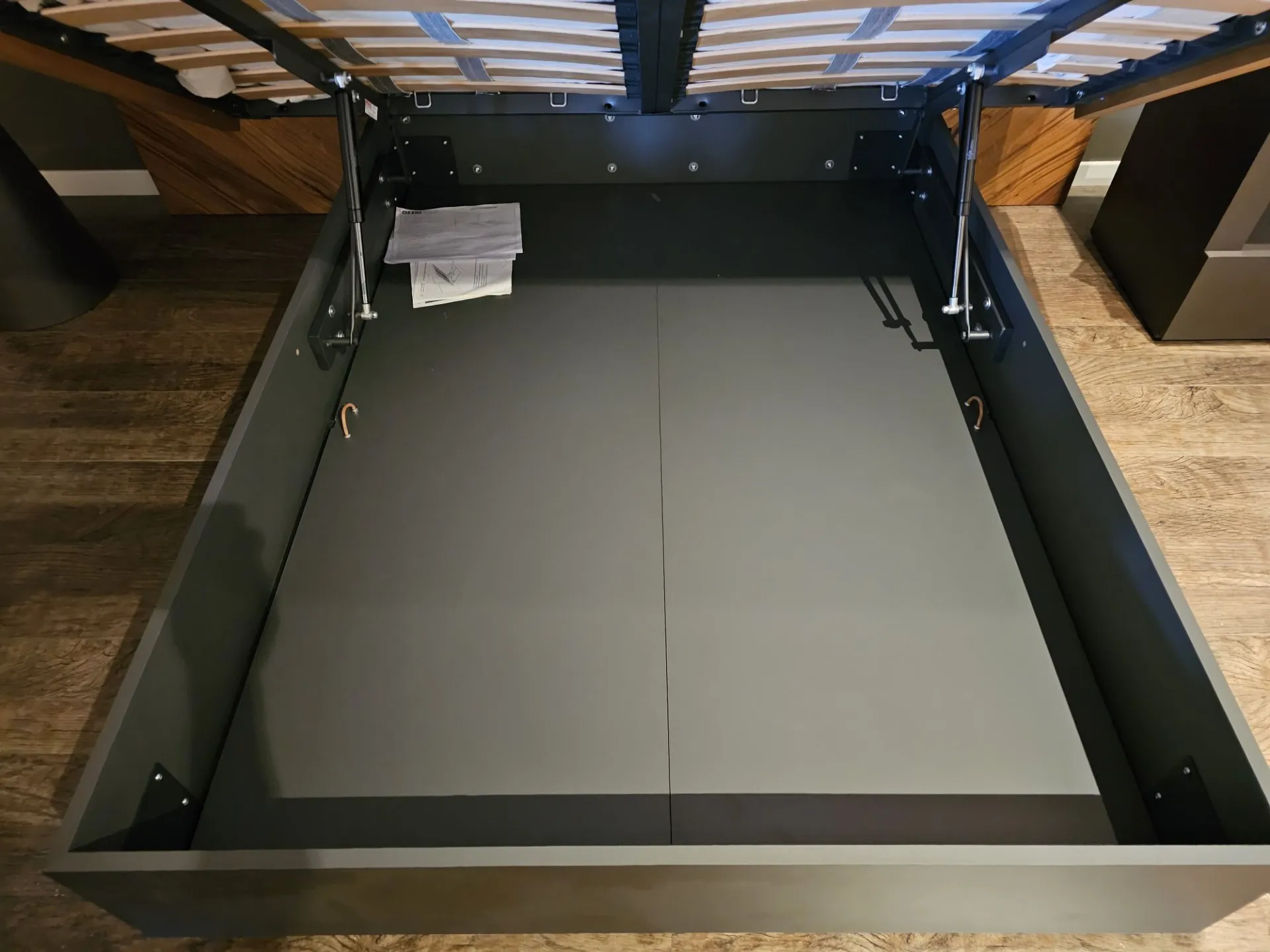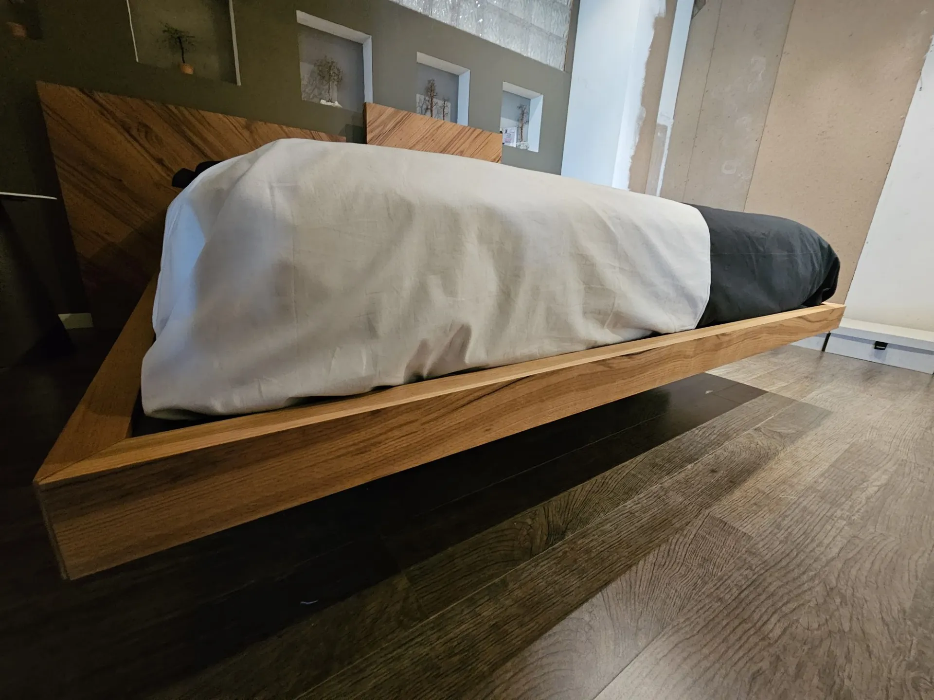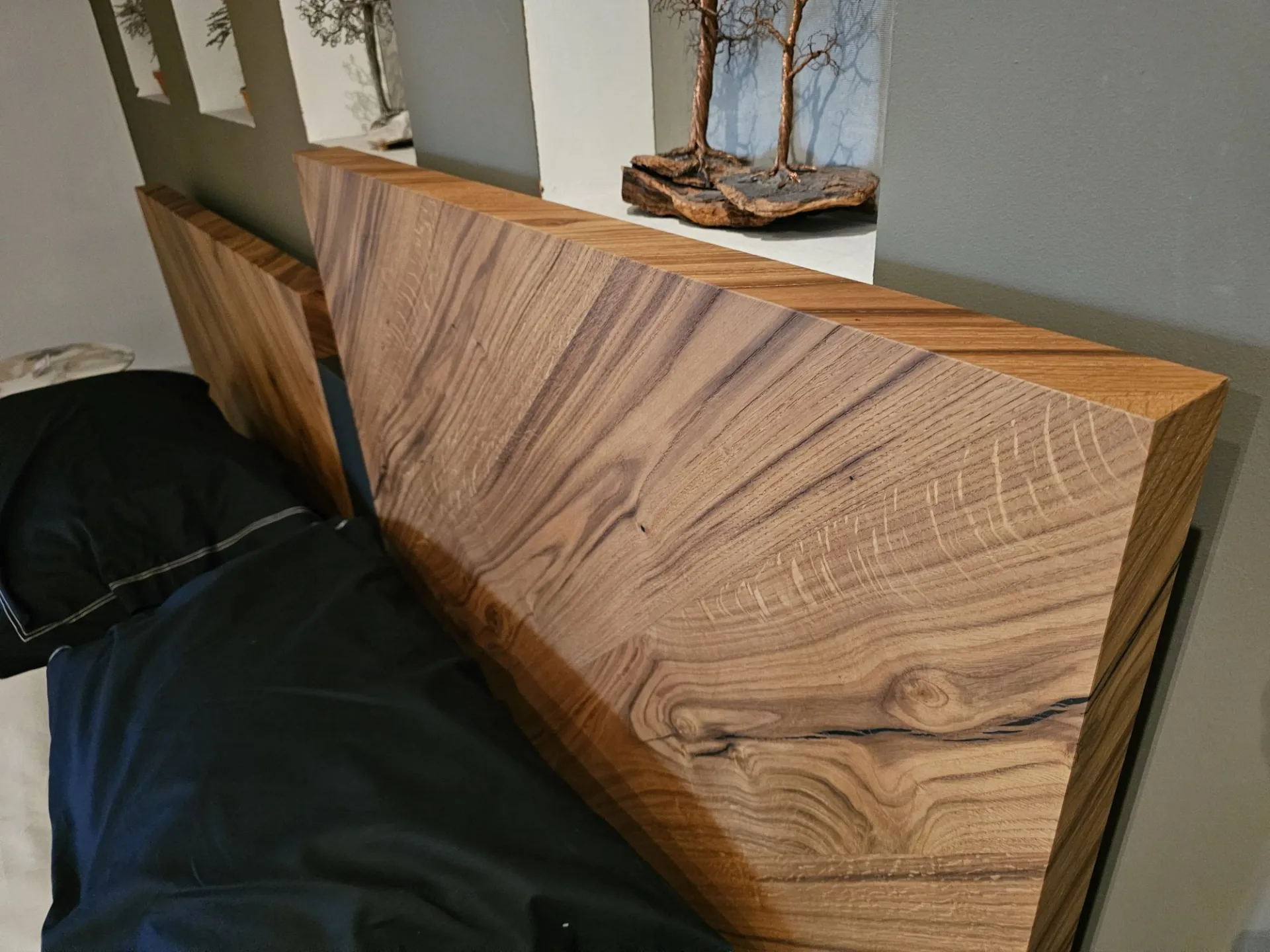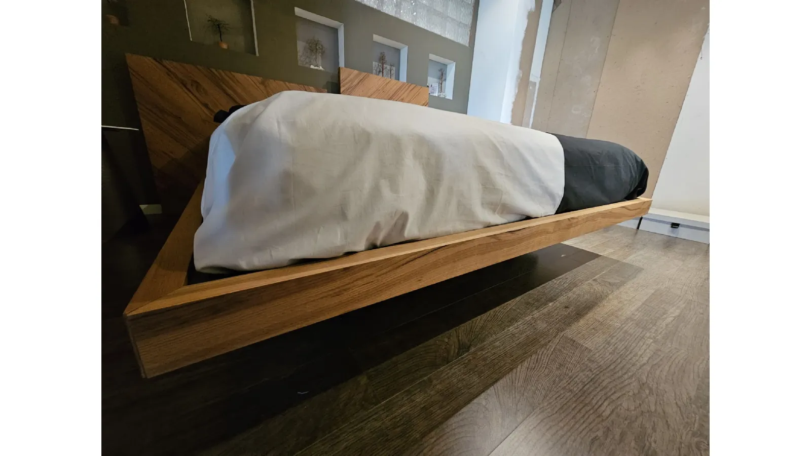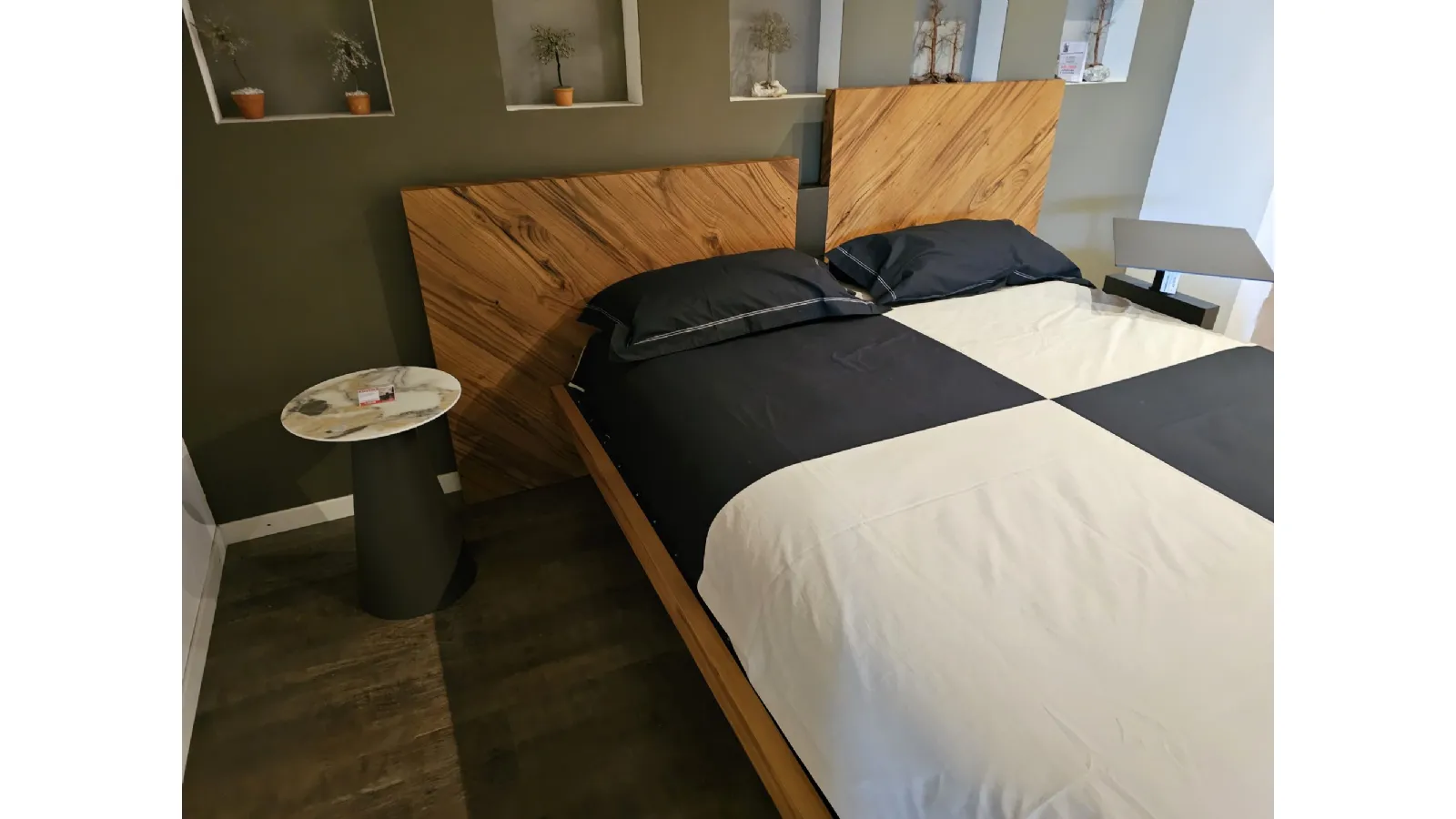 Nazare bed with asymmetric headboard and wooden bed frame, central inserts on the headboard and footboard in lacquered finish. Mattress support through wooden slats. Natural old wood finish PZ91 with central panel in graphite lacquered color. Measurement: cm L.232xW.218xH.100-120 (suitable for 180x200 mattress) + LED footboard kit (evening activation on the right/left through a 2-meter range presence sensor and automatic shut-off after 1 minute)