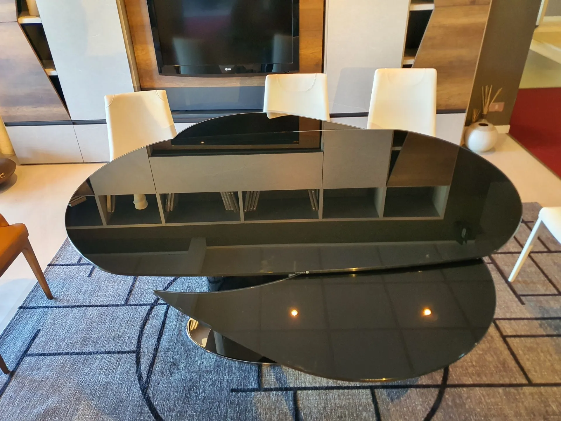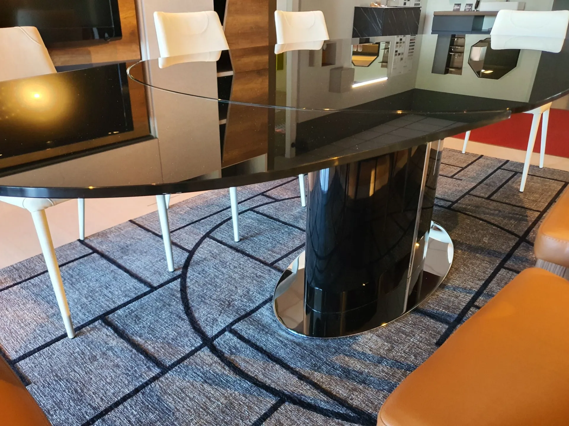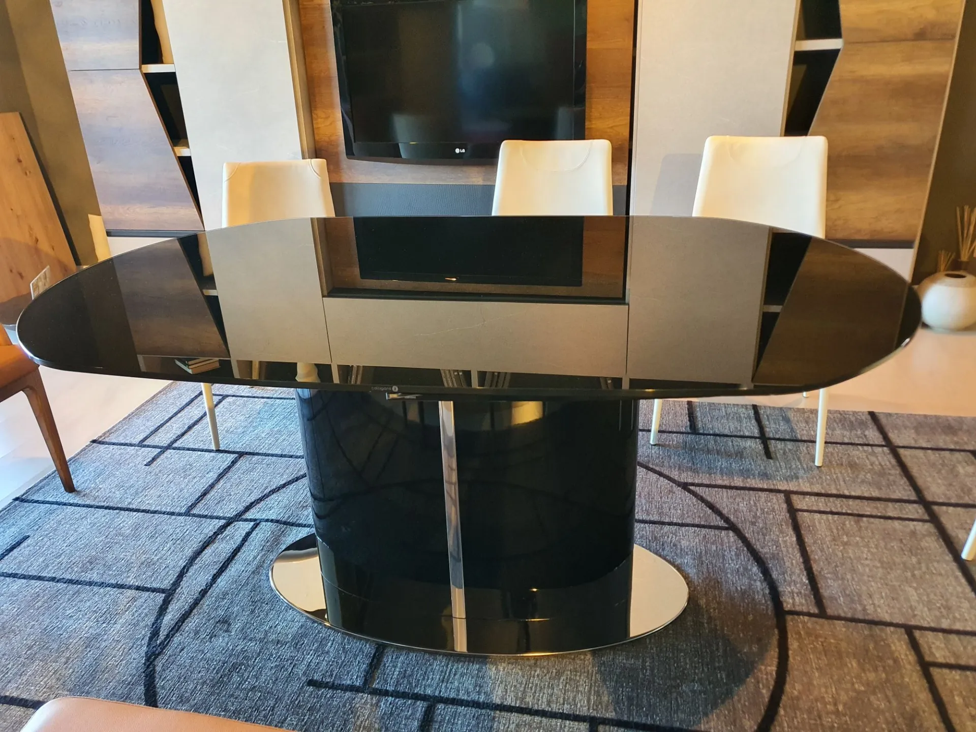 Extendable table model ODYSSEY with black silk-screened glass top, glossy black lacquered base, and chrome metal details. Measurements: cm L.165(255)xP.105xH.75 **Product exhibited at the fair**.