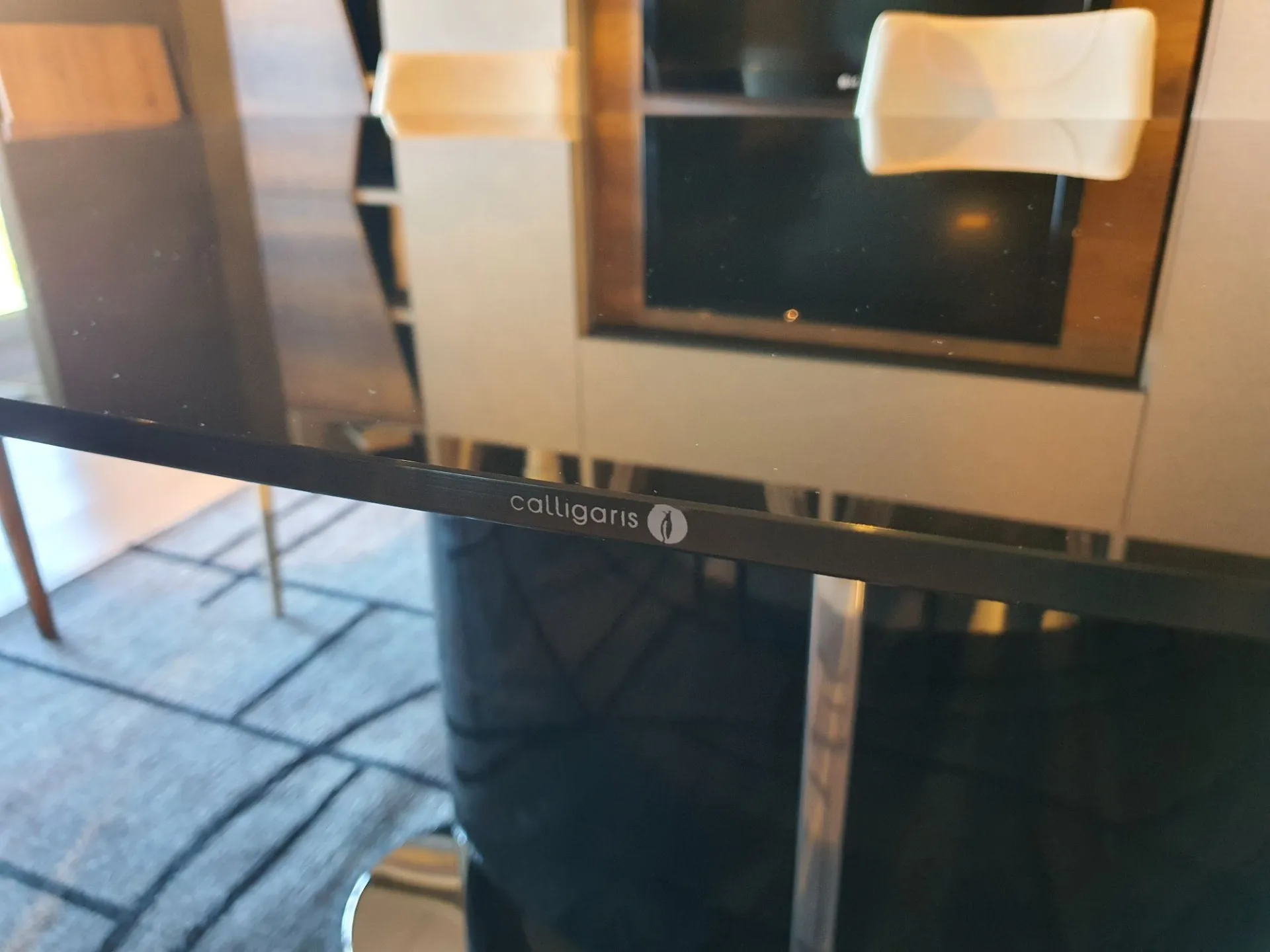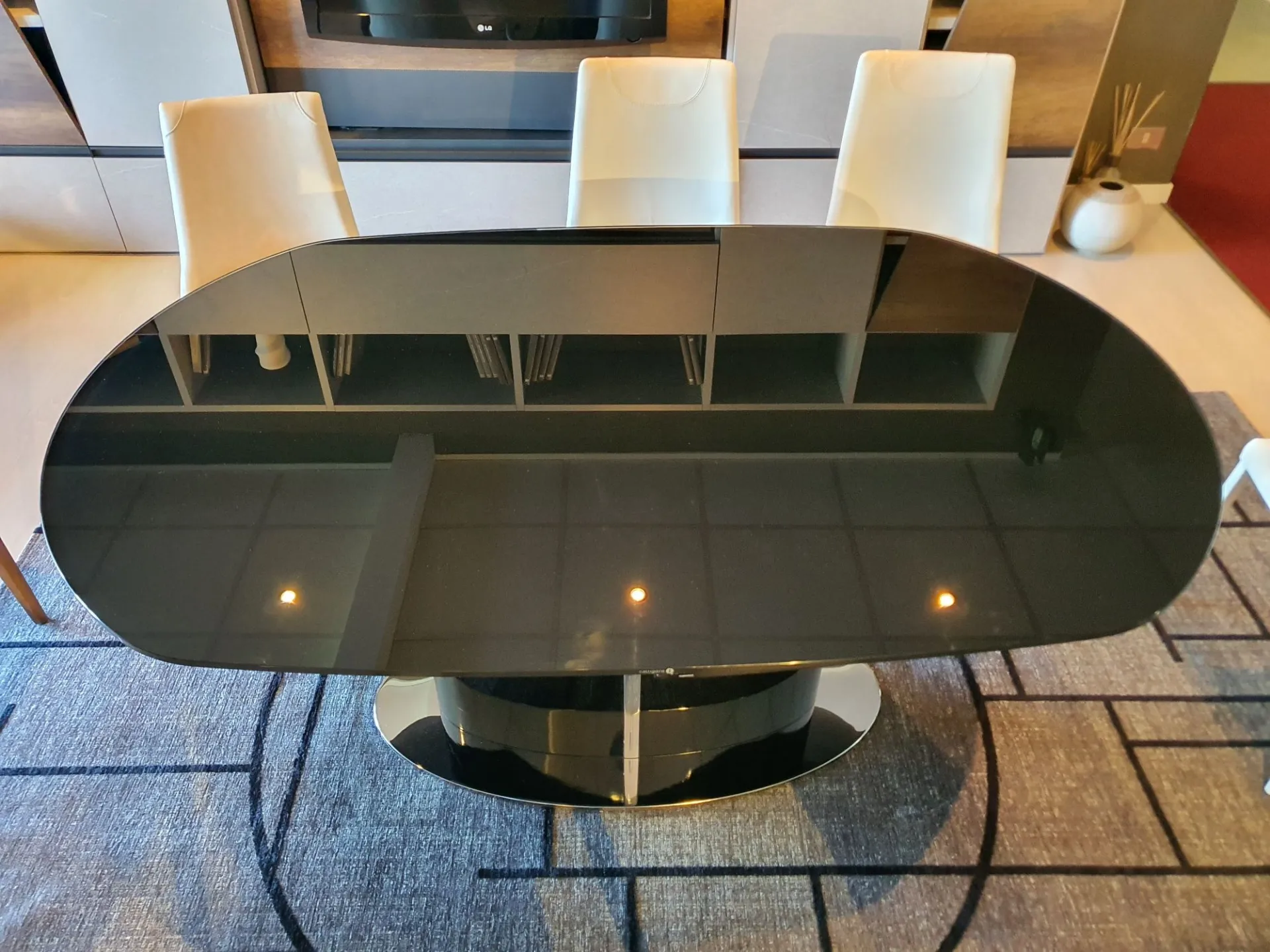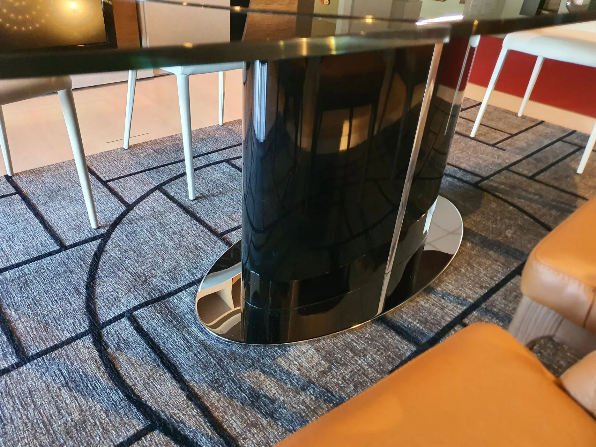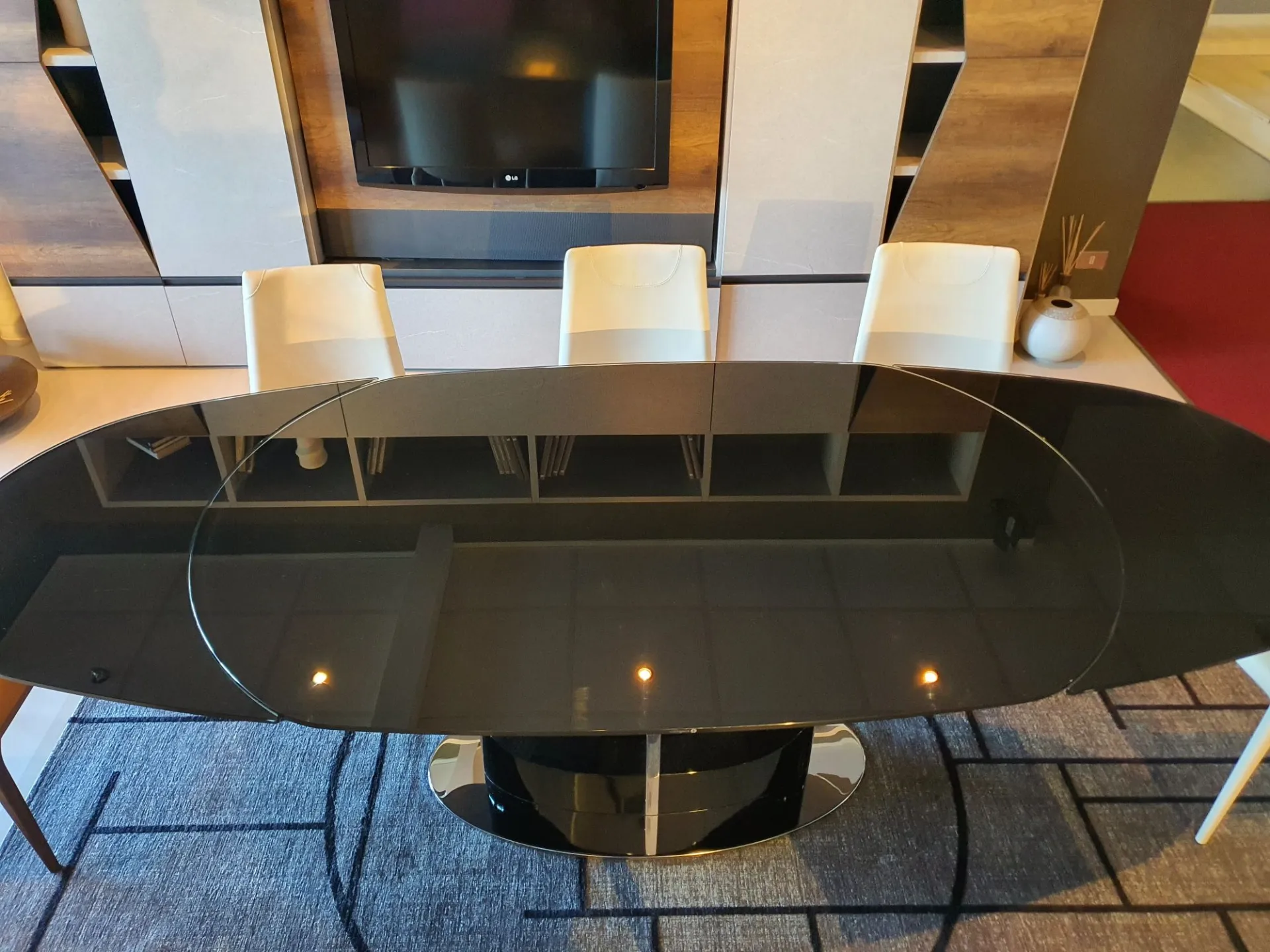 Extendable table model ODYSSEY with black silk-screened glass top, glossy black lacquered base, and chrome metal details. Measurements: cm L.165(255)xP.105xH.75 **Product exhibited at the fair**.