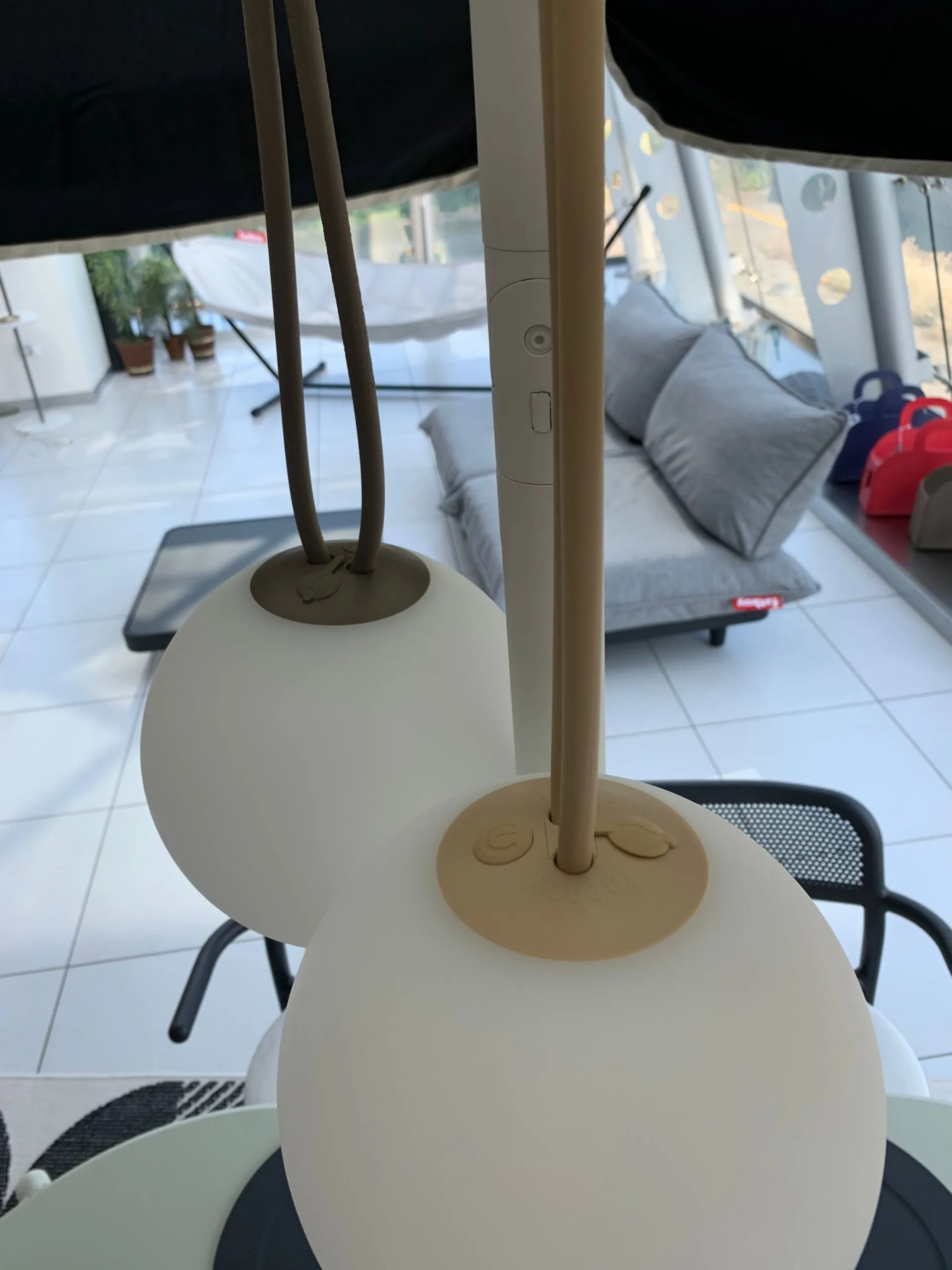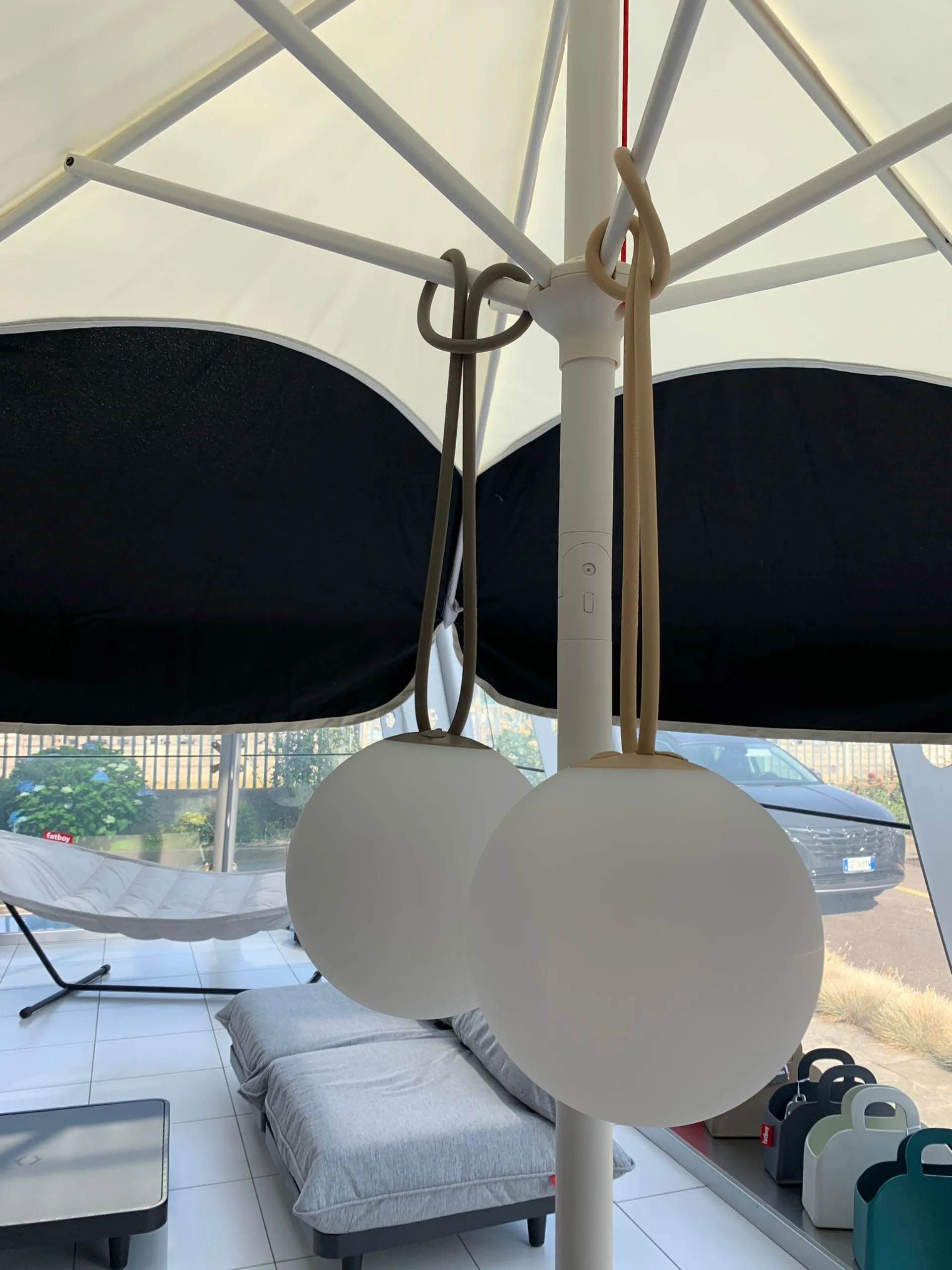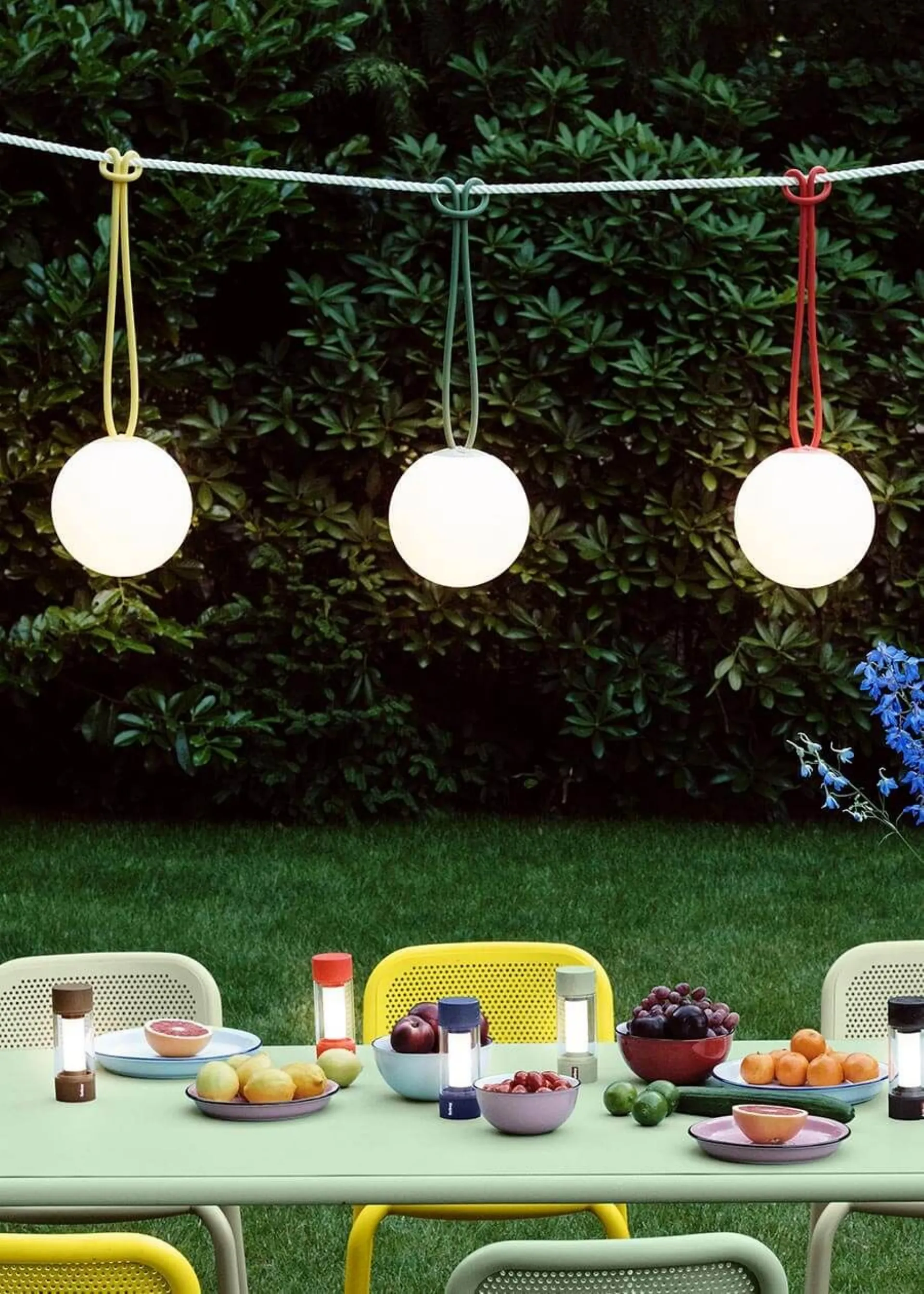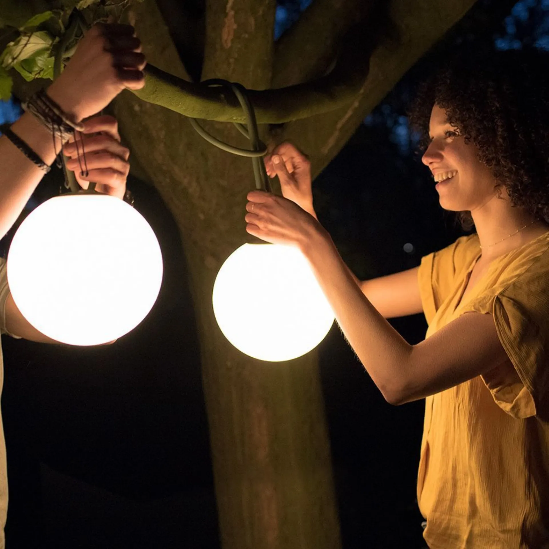You can recharge Bolleke via the USB port and enjoy an instant atmosphere for 24 hours, with three intensityà of light. The rubber string, which looks like a super long hair tie, makes hanging this ball light really easy. Bolleke è waterproof, you can safely leave it hanging outdoors.