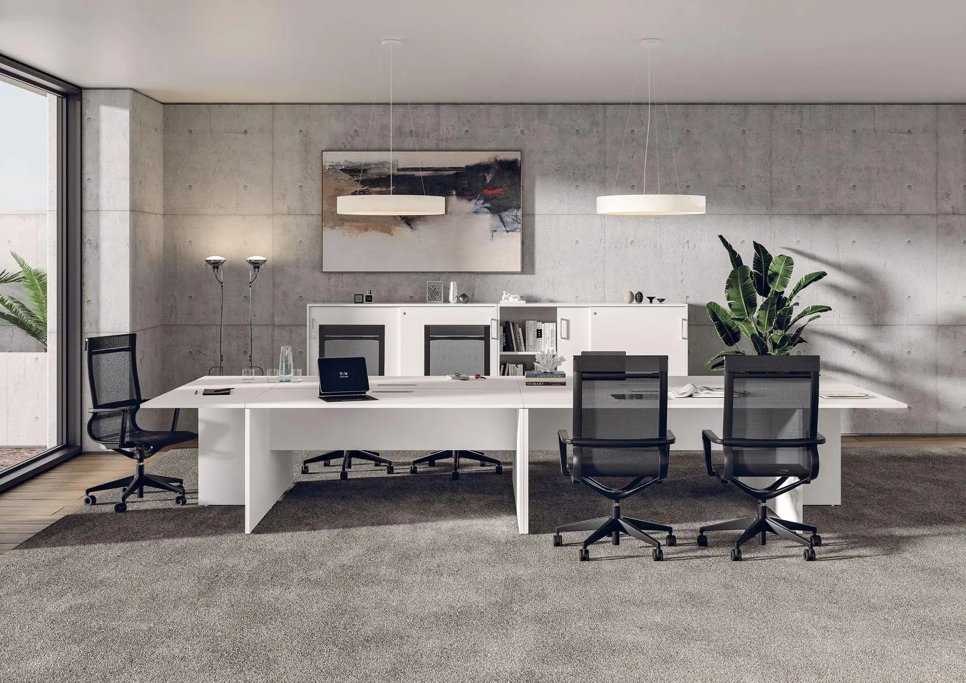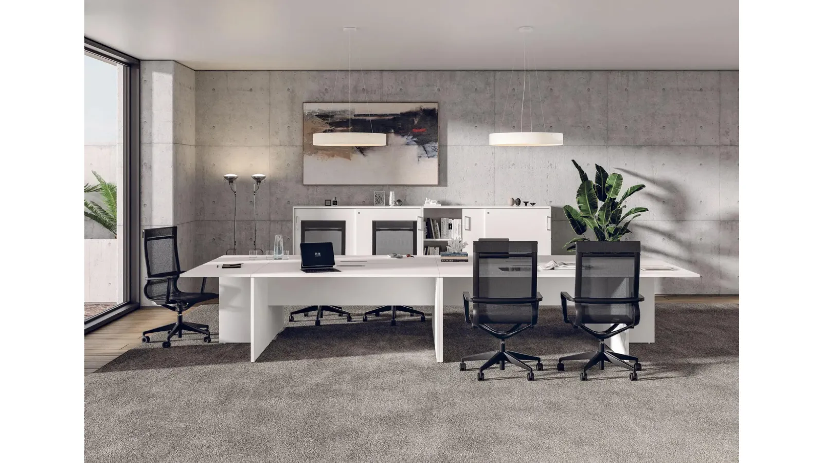 In the showroom, you can see and touch the most original melamine office furniture solutions, always of excellent quality and ideal for all types of spaces. Carefully furnishing work environments is important to provide comfort for employees and a welcoming atmosphere for clients: our showroom awaits you. The Krin Executive Desk by MobilOfficeFurniture is one of the best examples of functional and visually appealing furniture for workspaces from this well-known brand. Come discover in our store a variety of high-value executive desk models, always built with quality materials that withstand the test of time. When it comes to your office furniture, compositional arrangements with melamine executive desks play an extremely important role in equipping your space.