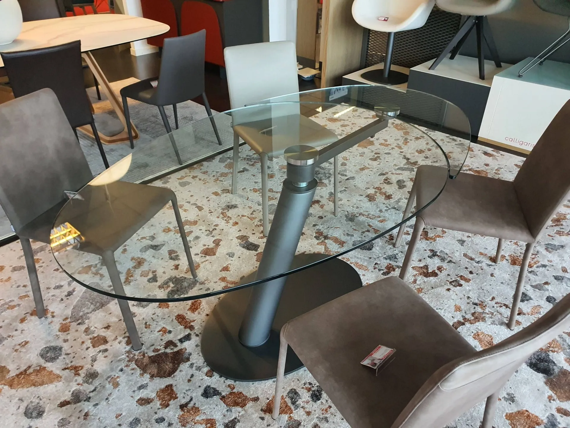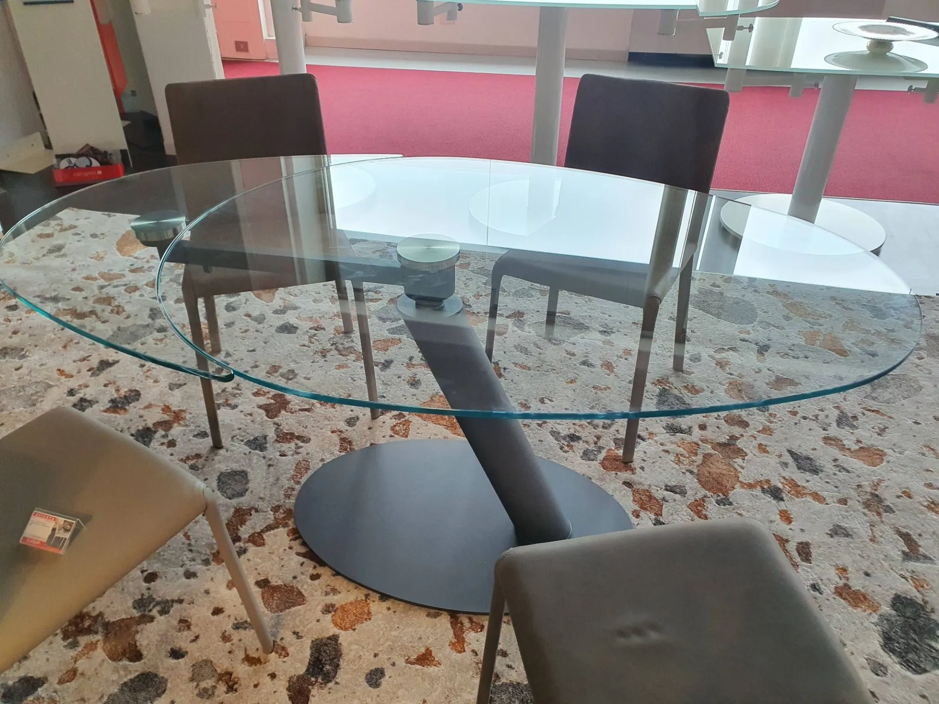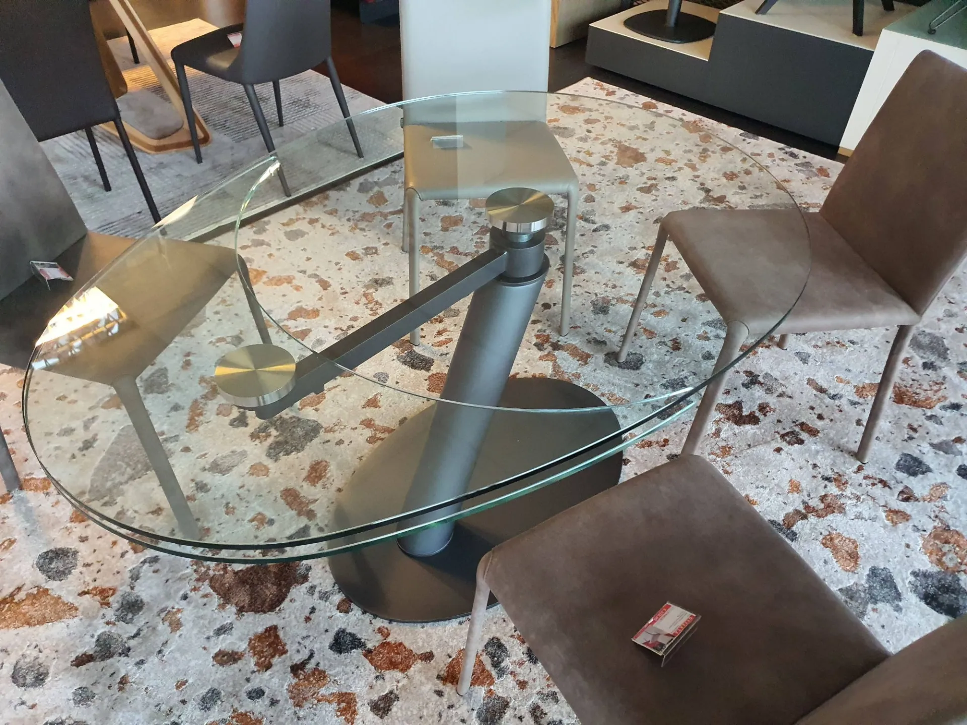 Beautiful extendable table with a fresh design and a graphite painted metal column base. The tabletop and the extension are made of transparent glass. The extension is rotatable with a self-lifting mechanism operated by a lever placed under the tabletop. The extension is fixed in the closed and open positions. It is a table suitable for those who have small spaces but do not want to give up on a design table with resistant materials. Its size when closed is cm L.134xW.98xH.74 and when open it measures cm L.170xW.98xH.74. Product displayed and available for immediate delivery.