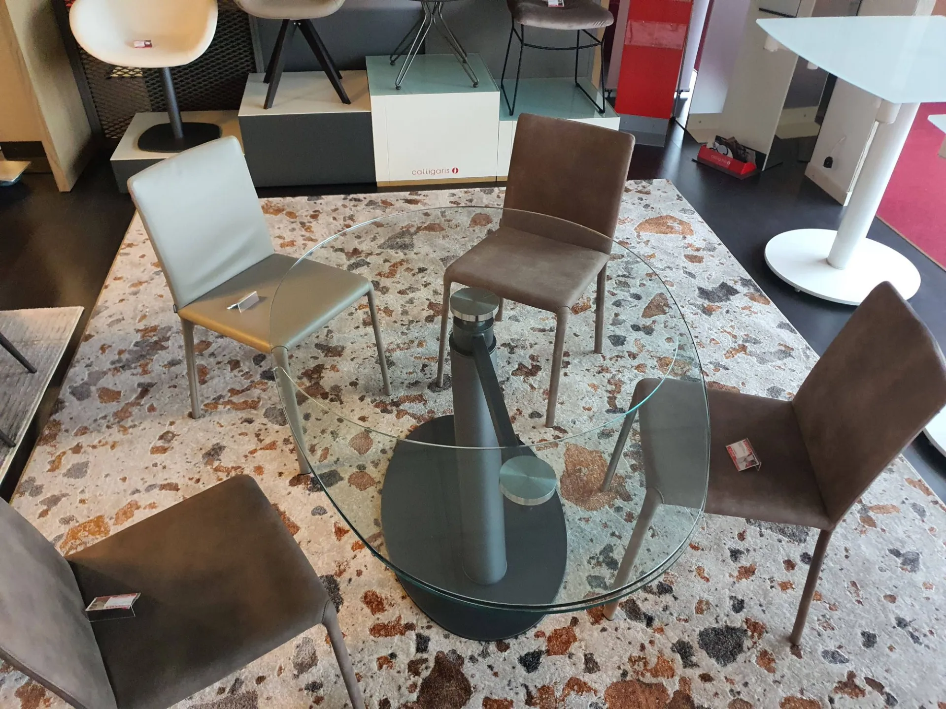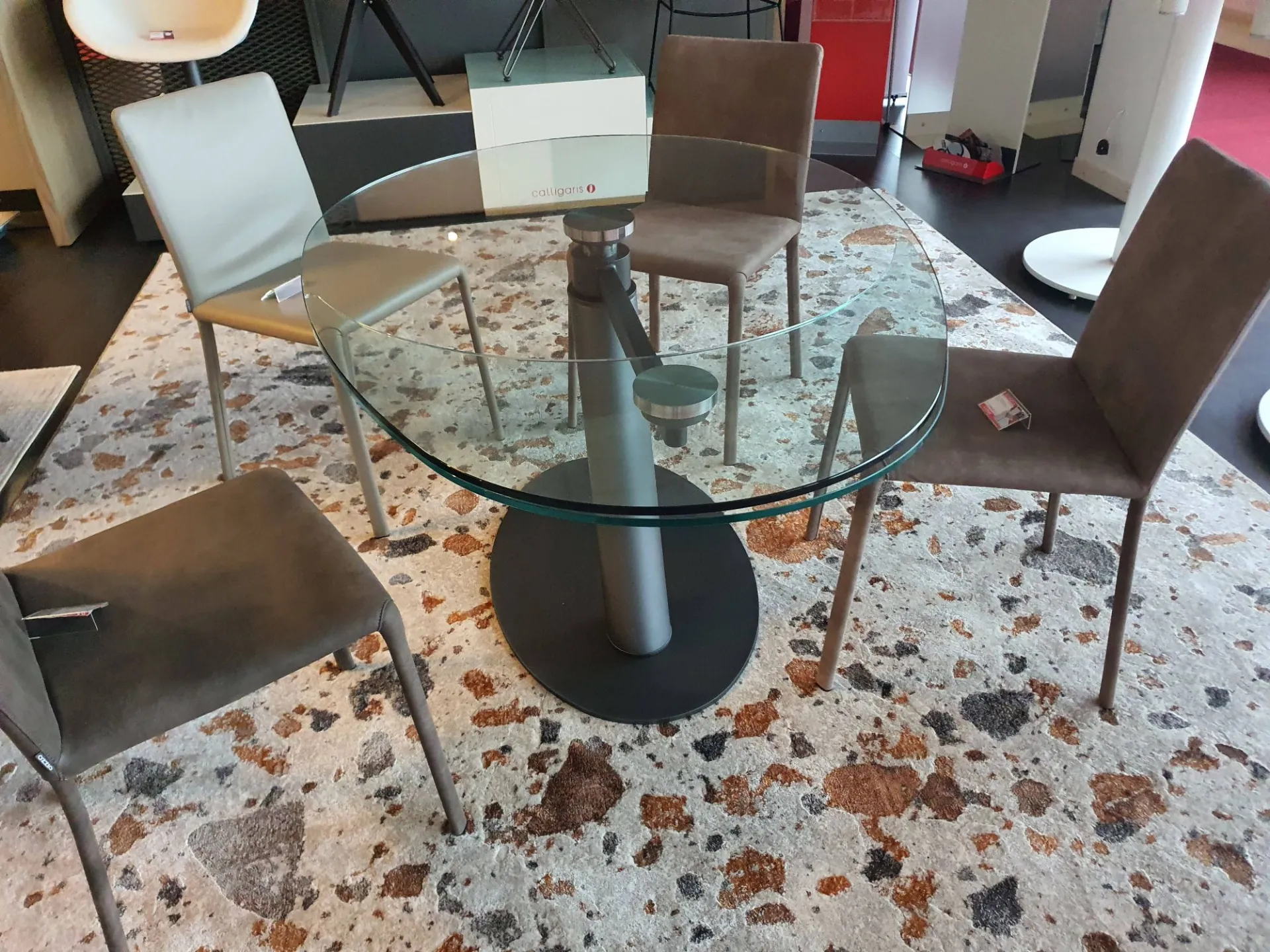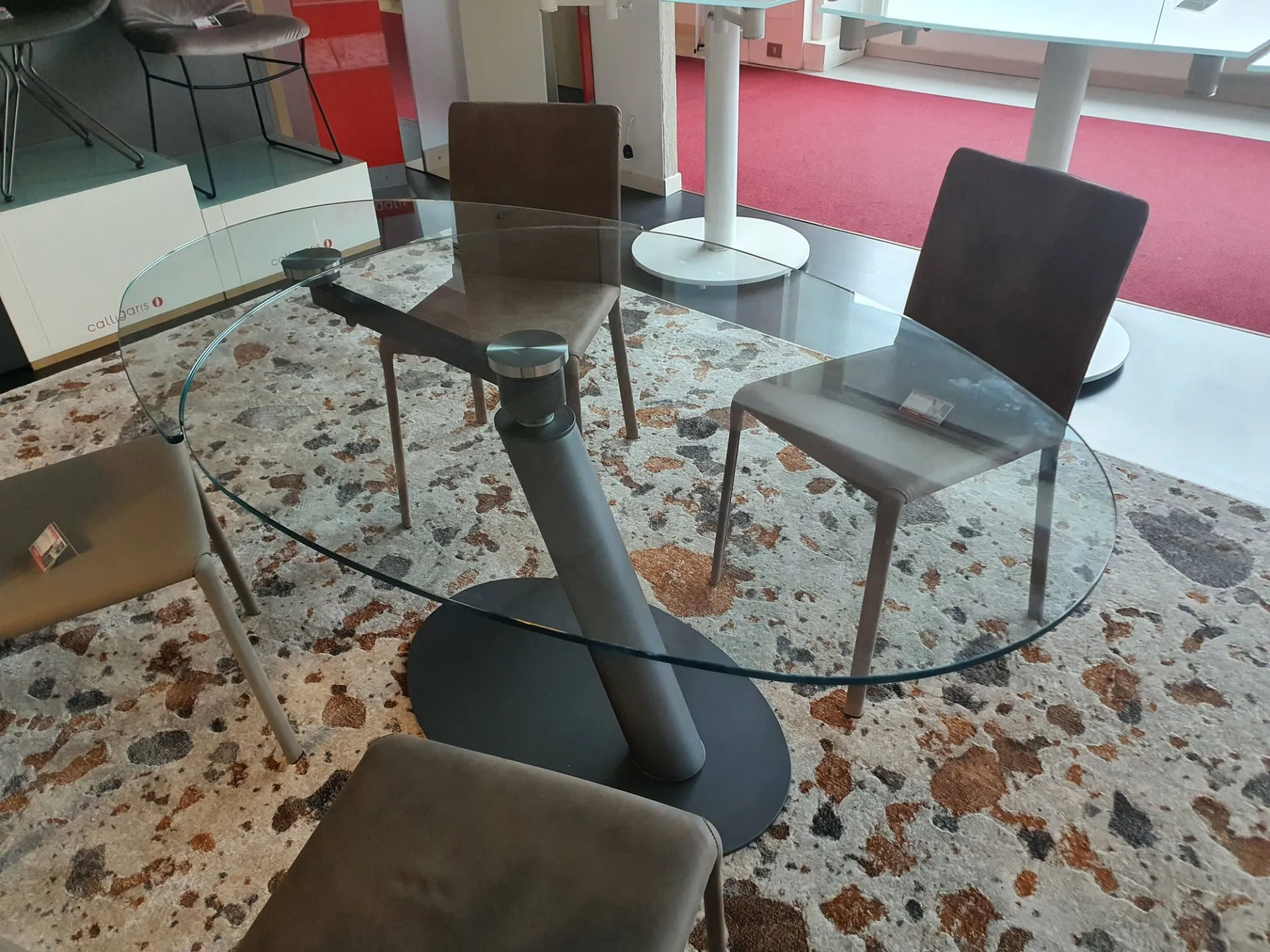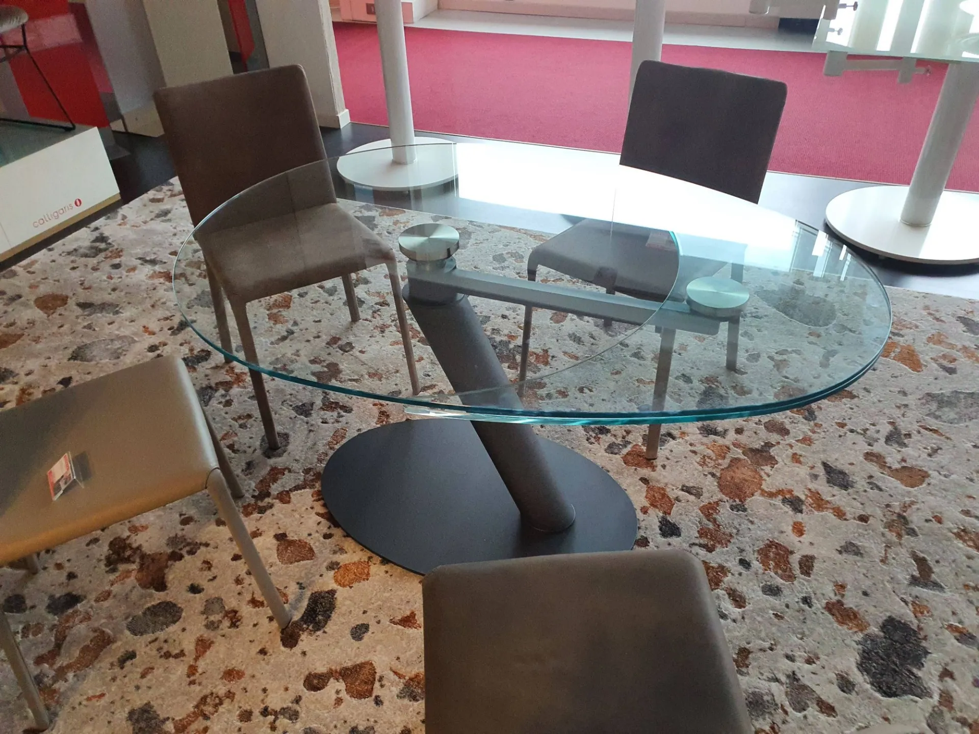 Beautiful extendable table with a fresh design and a graphite painted metal column base. The tabletop and the extension are made of transparent glass. The extension is rotatable with a self-lifting mechanism operated by a lever placed under the tabletop. The extension is fixed in the closed and open positions. It is a table suitable for those who have small spaces but do not want to give up on a design table with resistant materials. Its size when closed is cm L.134xW.98xH.74 and when open it measures cm L.170xW.98xH.74. Product displayed and available for immediate delivery.