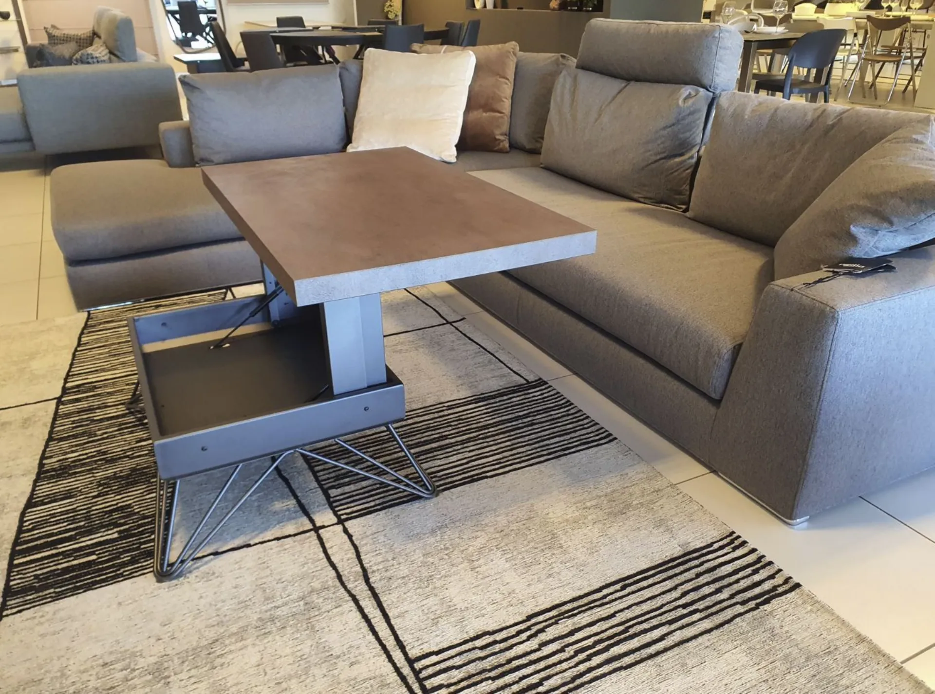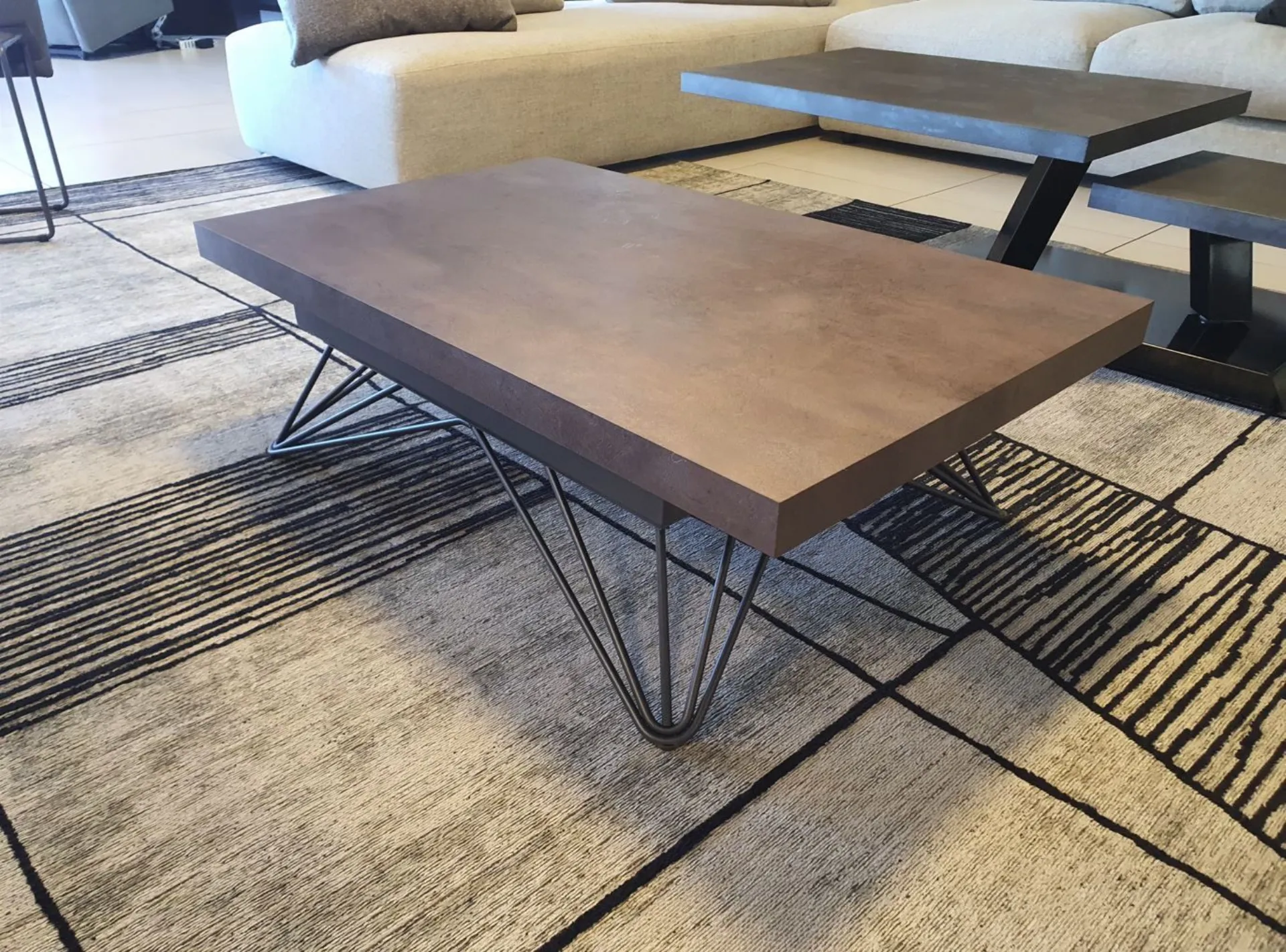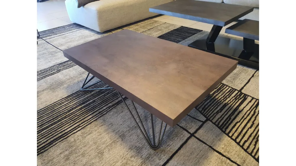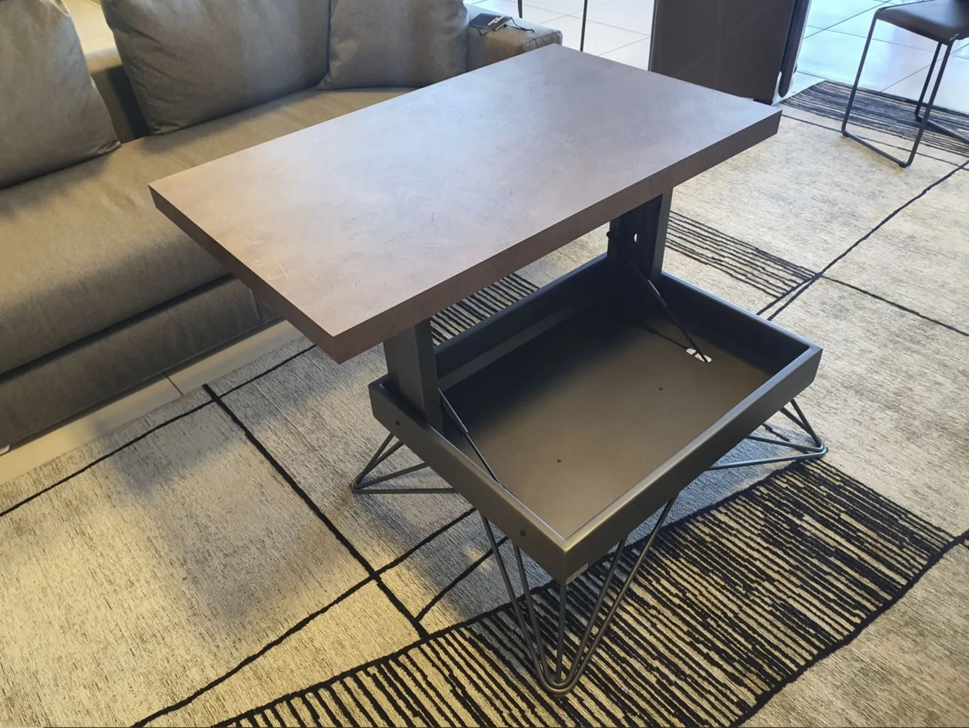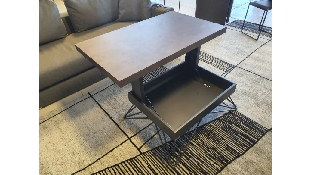 Convertible coffee table model RAY with modern design. The structure and legs are made of graphite-colored metal, while the top is made of CORTEN eco-wood, a finish that resembles rusty metal. It is an excellent space-saving solution thanks to the self-braking gas lifting mechanism, as the top goes from a base height of 32 cm to a height of 64 cm, convenient for eating or as a PC support. Height: from 32 to 64 cm Width: 106 cm Depth: 64 cm
