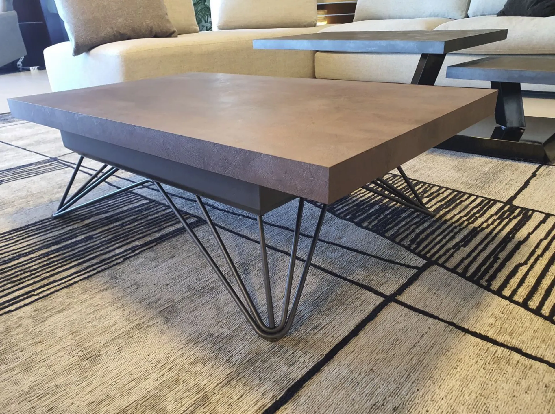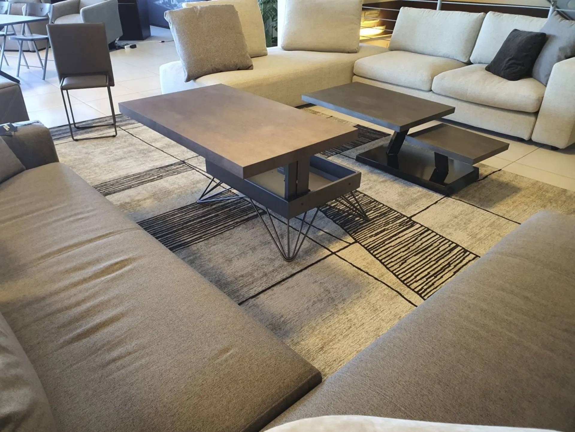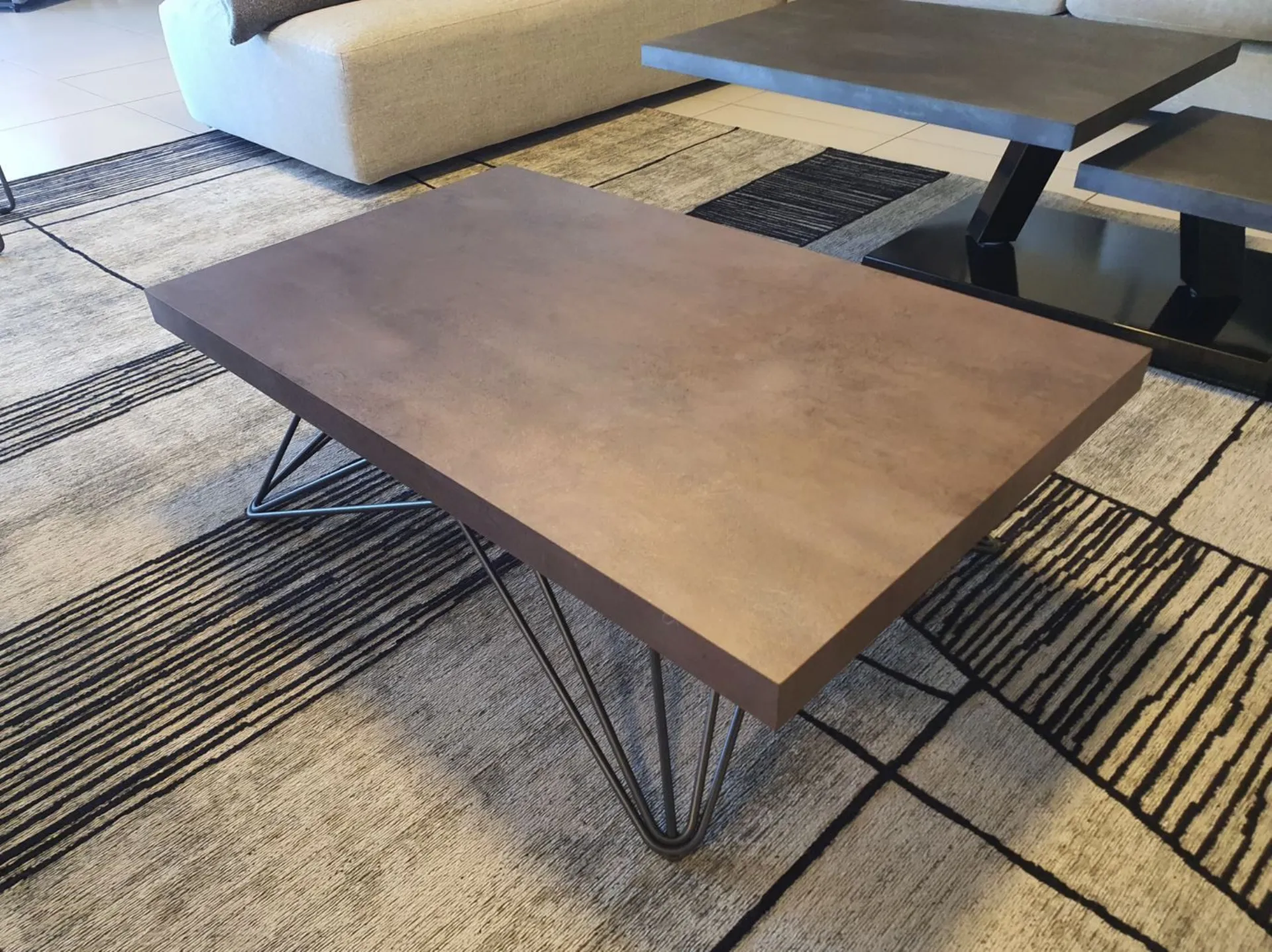 Convertible coffee table model RAY with modern design. The structure and legs are made of graphite-colored metal, while the top is made of CORTEN eco-wood, a finish that resembles rusty metal. It is an excellent space-saving solution thanks to the self-braking gas lifting mechanism, as the top goes from a base height of 32 cm to a height of 64 cm, convenient for eating or as a PC support. Height: from 32 to 64 cm Width: 106 cm Depth: 64 cm