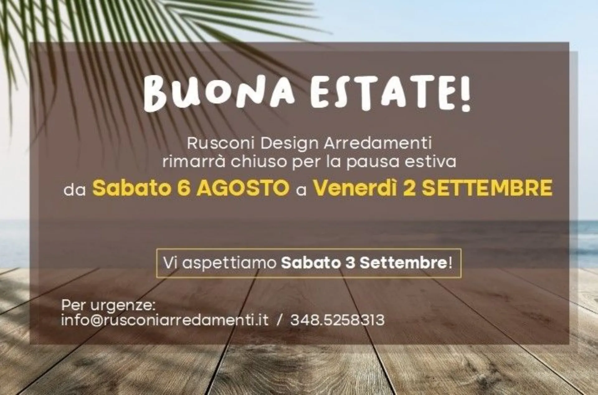 During the summer break, we inform our valued customers that Rusconi Design Arredamenti will be closed from Saturday 6th August to Friday 2nd September, inclusive. Have a great vacation! For any emergencies, please contact 3485258313 / info@rusconiarredamenti.it.
