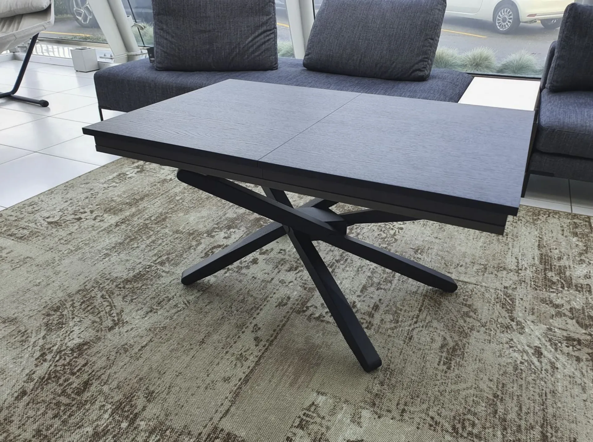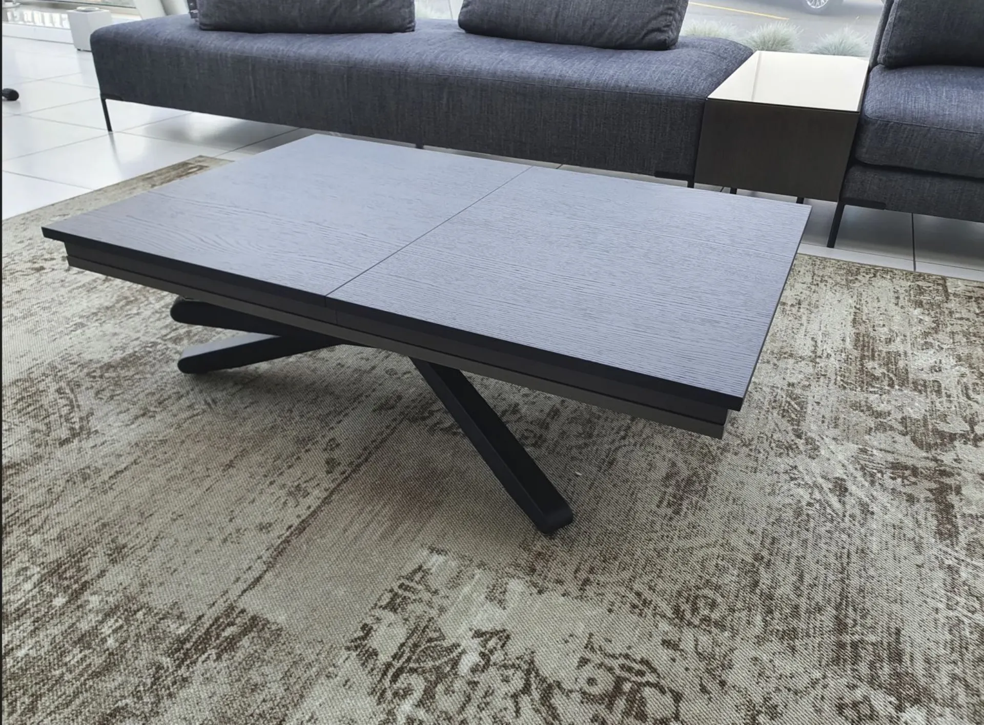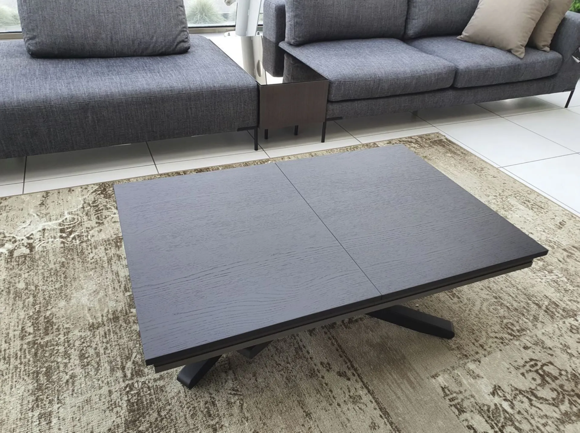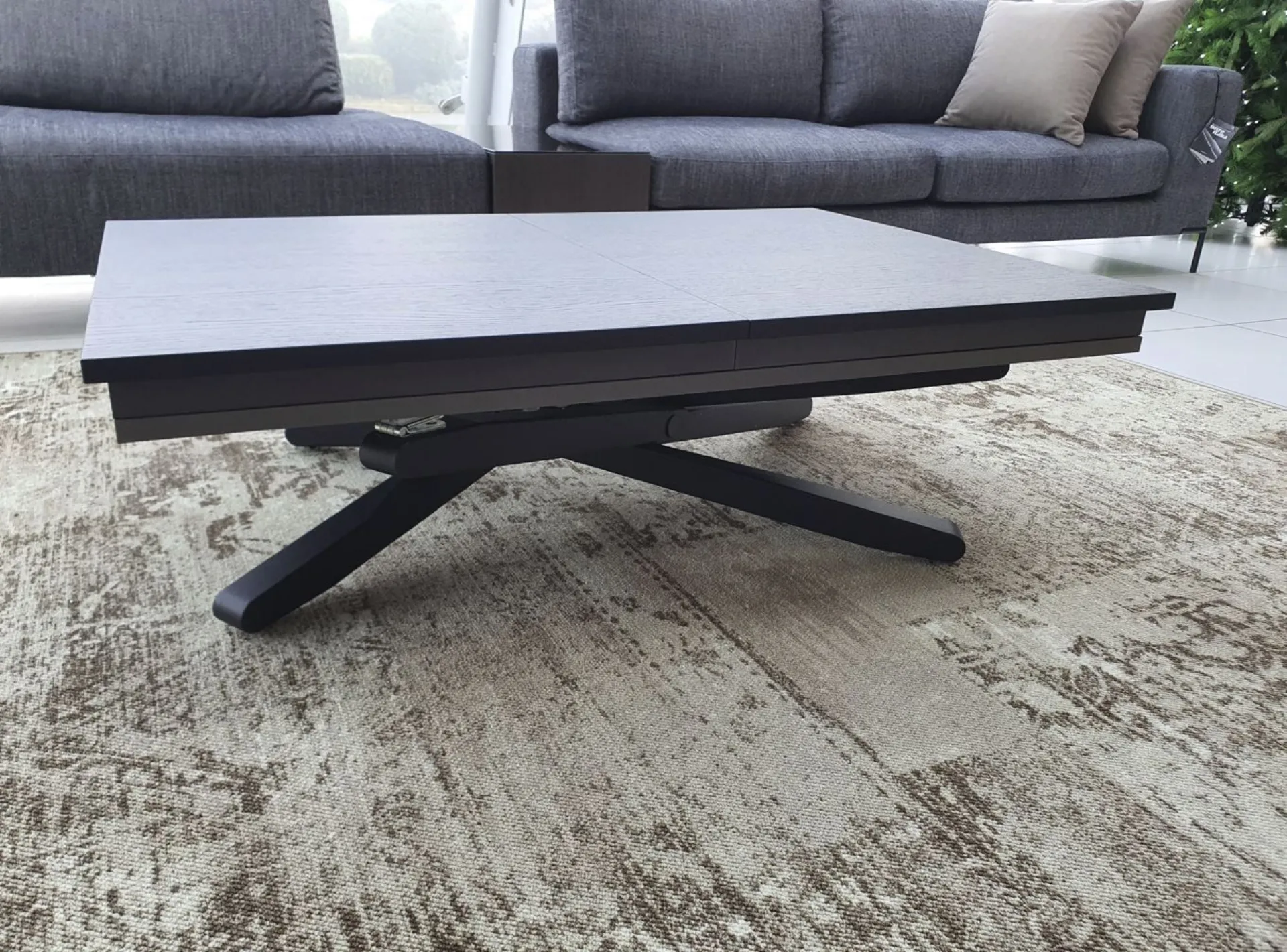 Convertible coffee table Jolly entirely in wood with wild carbon oak finish. A very practical solution for those who are short on space but don't want to give up a large table. Its size when closed is 115 cm long and 76 cm wide. Its size when opened is 177 cm long and 76 cm wide. The height is adjustable in centimeters, ranging from 33 to 75 cm. Contact us for more information.