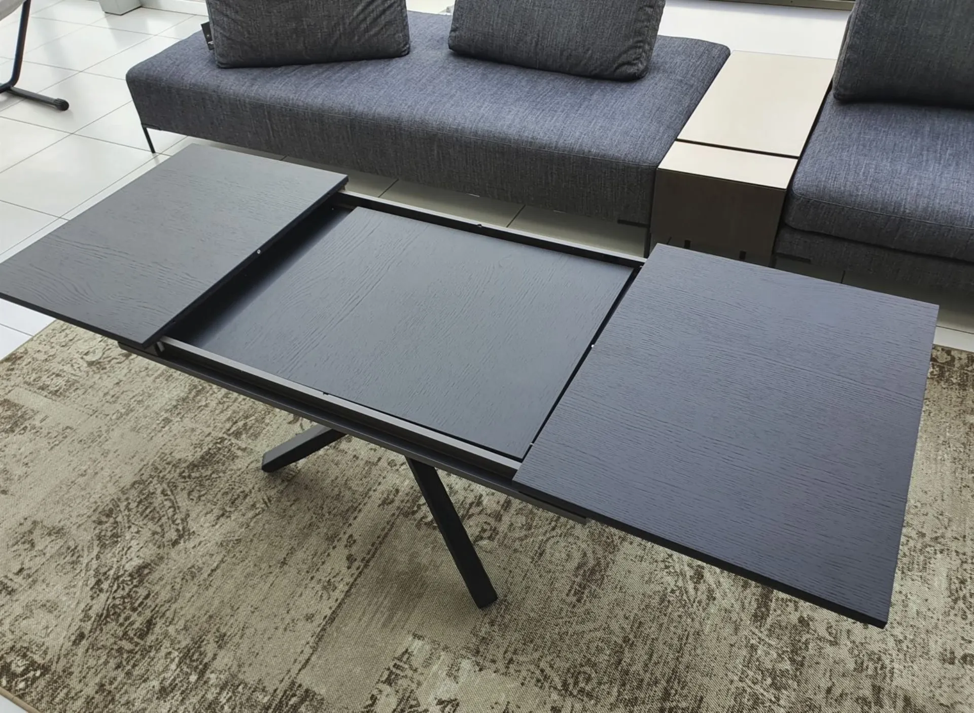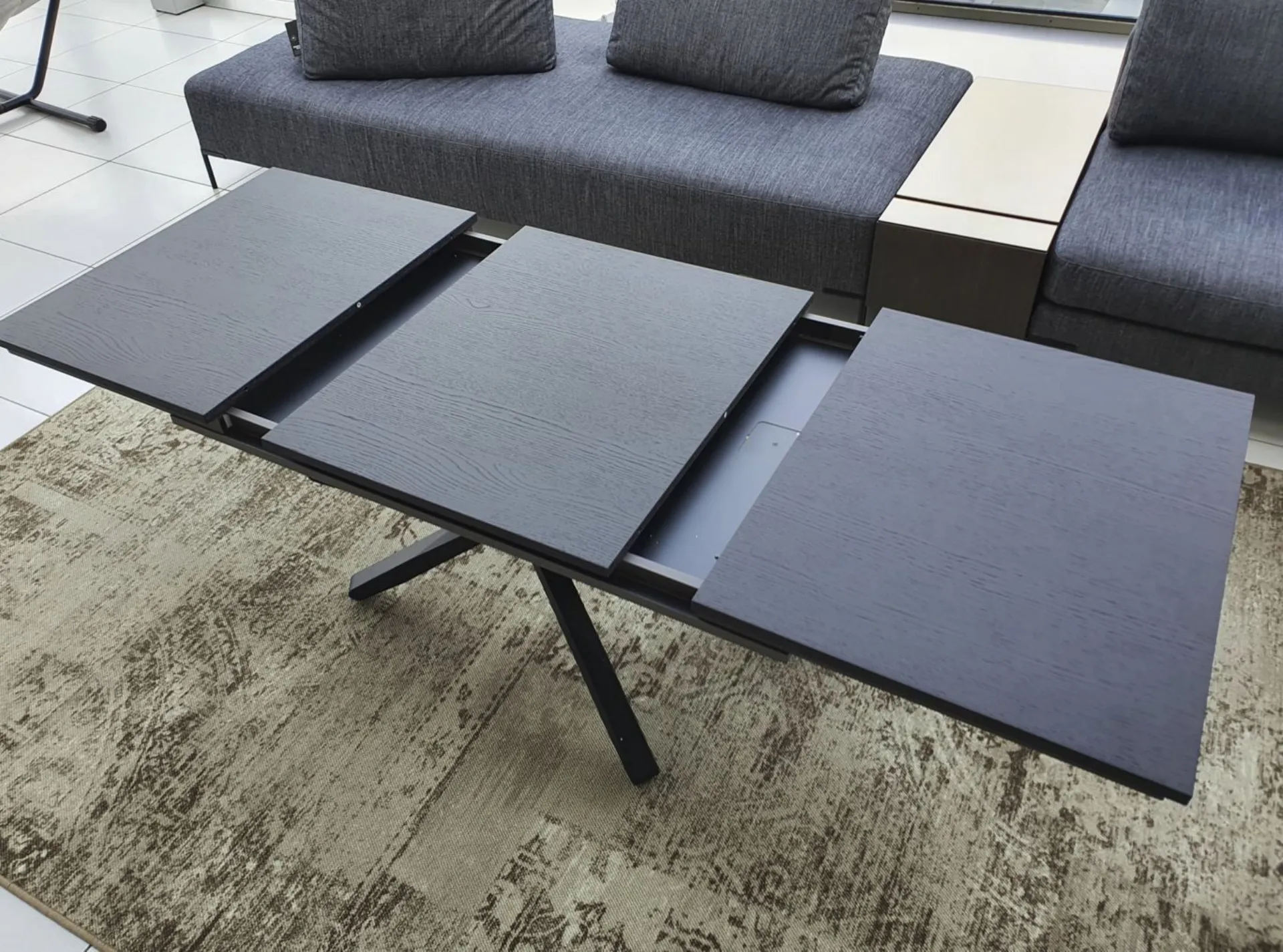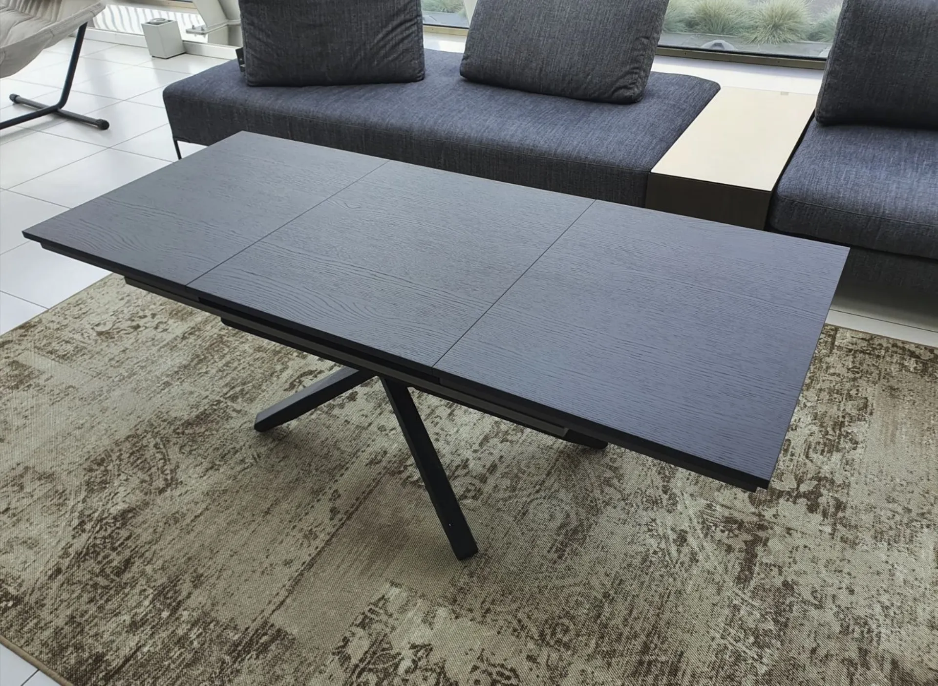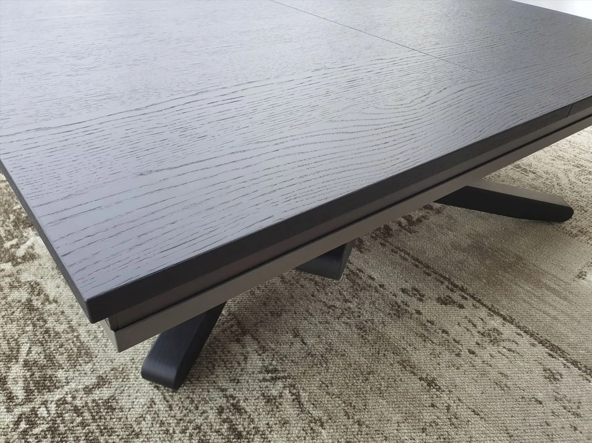 Convertible coffee table Jolly entirely in wood with wild carbon oak finish. A very practical solution for those who are short on space but don't want to give up a large table. Its size when closed is 115 cm long and 76 cm wide. Its size when opened is 177 cm long and 76 cm wide. The height is adjustable in centimeters, ranging from 33 to 75 cm. Contact us for more information.